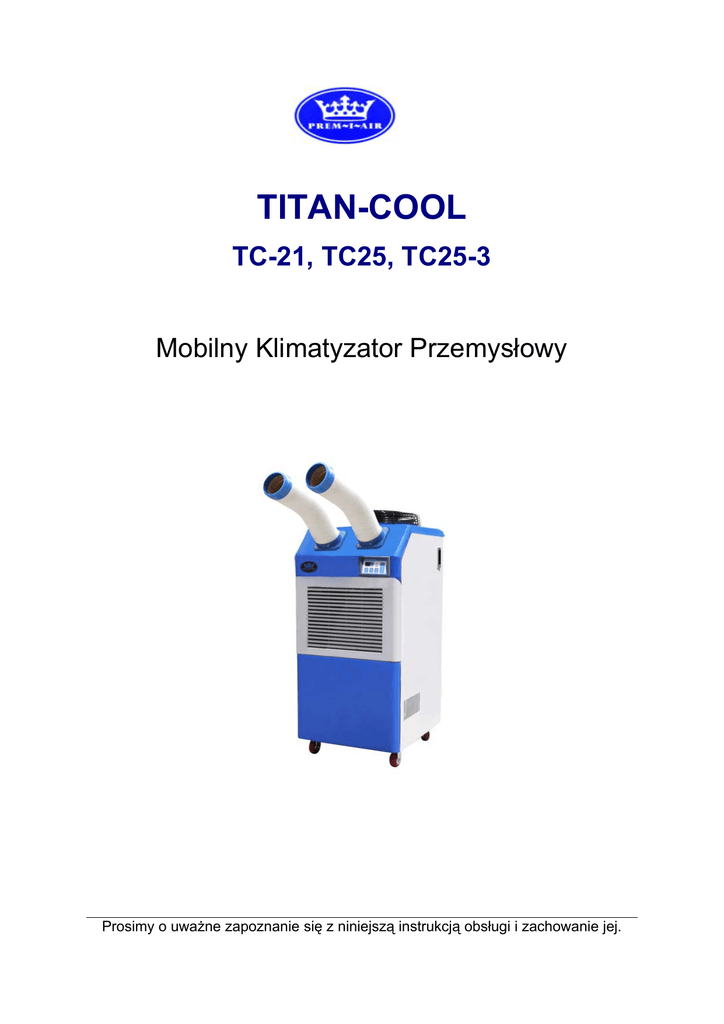TITAN-COOL TC-21, TC25, TC25-3 Mobilny Klimatyzator Przemysłowy Prosimy o uważne zapoznanie się z niniejszą instrukcją obsługi i zachowanie jej. Dziękujemy Państwu za zakup naszego urządzenia. Oddajemy do Państwa dyspozycji mobilny klimatyzator przemysłowy przystosowany do pracy w ciężkich warunkach. TITAN-COOL przeznaczony jest miejscowego schładzania w pomieszczeniach, które nie mogą być klimatyzowane lub schłodzone w odpowiednim stopniu Może służyć też do schładzania pomieszczeń o mniejszej kubaturze wbudowane kółka pozwalają na swobodne przemieszczanie urządzenia Panel sterujący jest czytelny i łatwy w obsłudze. Urządzenie posiada funkcje autodiagnozy Tryb pracy, zaprogramowana temperatura oraz temperatura pomieszczenia są wyświetlane na wyświetlaczu Rura wylotowa gorącego powietrza może być przedłużona do maksymalnie 9 metrów ZASTOSOWANIE -zakłady produkcyjne, warsztaty, kuchnie, zakłady tekstylne – wszędzie tam gdzie klimatyzacja jest zbyt słaba lub nieodpowiednia -kuchnie w restauracji, pomieszczenia z wtryskarkami i spawarkami, pomieszczenia serwerowni itp. – wszędzie tam gdzie wydzielają się duże ilości ciepła - namioty, hale – wszędzie tam gdzie miejscowe schładzanie jest niezbędne DANE TECHNICZNE Model Wydajność chłodzenia (BTU) Wydajność chłodzenia (kW) Moc (kW) Natężenie prądu (A) Przepływ powietrza max (m³/h) Napięcie zasilania Wydajność osuszania (l/24h) Maksymalne ciśnienie (MPa) Minimalne ciśnienie(MPa) Głośność(dB(A) Czynnik chłodniczy R410A(kg) Liczba prędkości wentylatora Waga netto(kg) Wymiary (szer x głęb x wys -mm) TC21 21000 6,1 2,38 10,8 810 45 2,9 0,9 66 1,0 2 93 TC25 TC25-3 25000 25000 7.3 7,3 2,7 2,7 12,3 12,3 950 950 220-240V – 50Hz 46 46 2,9 2,9 0,9 0,9 68 68 1,2 1,2 2 2 98 100 56x62x125 UWAGA: TITAN-COOL jest przeznaczony do pracy z temperaturze od 18 do 45 stopni C i wilgotności względnej do 80%. Poza w/w limitami praca urządzenia może być zakłócona. 2 ZALECENIA I WARUNKI BEZPIECZEŃSTWA 1. Przewożenie i przechowywanie urządzenia tylko w pozycji pionowej. Przed uruchomieniem po transporcie urządzenie powinno stać w normalnej pozycji przez ok. 3 godziny. 2. Zawsze ustawiaj urządzenie na poziomej powierzchni. 3. Konieczne jest zapewnienie otworu w oknie lub ścianie dla odprowadzenia gorącego powietrza na zewnątrz. 4. Upewnić się,że urządzenie jest podłączane do uziemionego gniazda elektrycznego o właściwym napięciu prądu, zgodnie z wartością na tabliczce znamionowej urządzenia. 5. Urządzenie będzie chłodzić jeśli temperatura pomieszczenia zawiera się w zakresie 18 -45°C oraz zaprogramowanej termostatem temperatury. 6. NIE UŻYWAĆ urządzenia do innych celów niż opisane w tej instrukcji. 7. UŻYWAĆ urządzenie tylko w pozycji pionowej. 8. NIE utrudniać swobodnego przepływu powietrza wokół urządzenia oraz nie zakrywać wlotów i wylotów powietrza w urządzeniu. 9. To urządzenie przeznaczone jest wyłącznie do pracy wewnątrz pomieszczeń. 10. NIGDY nie wyłączaj pracującego urządzenia z kontaktu gdyż może to uszkodzić jego elektroniczne podzespoły. 11. NIE WOLNO UŻYWAĆ urządzenia w wilgotnych pomieszczeniach takich jak łazienki, pralnie itp. 12. NIGDY nie załamuj i nie zgniataj rur powietrznych. 13. NIE umieszczaj na urządzeniu żadnych rzeczy 14. NIGDY nie obsługuj urządzenia mokrymi lub wilgotnymi rękoma. 15. NIE pozwól na kontakt urządzenia z substancjami chemicznymi. 16. NIE UŻYWAJ urządzenia w pomieszczeniach gdzie mogą występować substancje łatwopalne ( lub ich opary) takie jak alkohole , paliwa, środki owadobójcze i podobne. 17. NIE używaj wtyczki do włączania lub wyłączania urządzenia. Zawsze używaj do tego celu panelu sterującego. 18. Jeśli urządzenie nie jest używane odłącz je od prądu wyjmując wtyczkę z kontaktu. 19. ZAWSZE wyłącz urządzenie i odłącz je od prądu przed czyszczeniem, zmianą miejsca, podnoszeniem itp. 20. W przypadku konieczności użycia przedłużaczy elektrycznych lub adapterów wtyczek zawsze sprawdź czy są one odpowiednie dla urządzenia. Nie umieszczaj przewodu elektrycznego nad lub w pobliżu gorących powierzchni, zawsze rozwiń kabel do końca, zabezpieczy go to przed przegrzaniem. Jeśli kabel przyłączeniowy lub wtyczka ulegną uszkodzeniu to należy je bezwzględnie wymienić. Wykonanie tej czynności należy zlecić uprawnionym osobom. 21. Urządzenie musi być użytkowane tylko z zamontowanymi filtrami. Przed ich czyszczeniem urządzenie należy wyłączyć i wyciągnąć wtyczkę z gniazda elektrycznego. 22. NIE WOLNO używać urządzenia z uszkodzoną wtyczką lub kablem przyłączeniowym gdyż grozi to porażeniem przez prąd elektryczny. Wymianę ich należy zlecić uprawnionym osobom. 23. Uważnie nadzoruj dzieci i zwierzęta domowe jeśli w pobliżu nich pracuje urządzenie. 24. Urządzenie powinno być ustawione na płaskiej poziomej powierzchni w odległości minimalnej 60cm od innych przedmiotów. 3 JAK OSZCZĘDZAĆ ENĘRGIĘ - Zanieczyszczone kurzem filtry zmniejszają skuteczność chłodzenia i mogą zwiększyć zużycie energii o ok. 6% Unikać częstego otwierania drzwi Każda osoba w pomieszczeniu emituje od 100 do 150 Watt ciepła oznacza to, że duża liczba osób w pomieszczeniu może zmniejszyć efektywność chłodzenia. Dla uzyskania optymalnego efektu zaleca się ograniczyć do minimum napływ ciepłego powietrza z zewnątrz i ograniczenie nasłonecznienia pomieszczenia. WYMIANA KABLA PRZYŁĄCZENIOWEGO I WTYCZKI W przypadku konieczności wymiany kabla przyłączeniowego lub wtyczki należy ściśle przestrzegać lokalnych przepisów a najlepiej czynność tę zlecić uprawnionej osobie. WYŚWIETLACZ PANELU KONTROLNEGO 4 POWER BLOWER SPOT/COOL Przycisk ZASILANIE Przycisk DMUCHAWA Przycisk CHŁODZENIE PUNKTOWE ROOM/COOL Przycisk CHŁODZENIE POMIESZCZEŃ UP/DOWN Przycisk GÓRA/DÓŁ CURRENT TEMP Bieżąca temperatura T