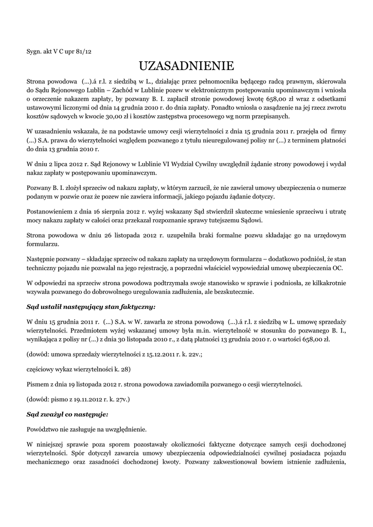 Sygn. akt V C upr 81/12 UZASADNIENIE Strona powodowa (...).á r.l. z siedzibą w L., działając przez pełnomocnika będącego radcą prawnym, skierowała do Sądu Rejonowego Lublin – Zachód w Lublinie pozew w elektronicznym postępowaniu upominawczym i wniosła o orzeczenie nakazem zapłaty, by pozwany B. I. zapłacił stronie powodowej kwotę 658,00 zł wraz z odsetkami ustawowymi liczonymi od dnia 14 grudnia 2010 r. do dnia zapłaty. Ponadto wniosła o zasądzenie na jej rzecz zwrotu kosztów sądowych w kwocie 30,00 zł i kosztów zastępstwa procesowego wg norm przepisanych. W uzasadnieniu wskazała, że na podstawie umowy cesji wierzytelności z dnia 15 grudnia 2011 r. przejęła od firmy (...) S.A. prawa do wierzytelności względem pozwanego z tytułu nieuregulowanej polisy nr (...) z terminem płatności do dnia 13 grudnia 2010 r. W dniu 2 lipca 2012 r. Sąd Rejonowy w Lublinie VI Wydział Cywilny uwzględnił żądanie strony powodowej i wydał nakaz zapłaty w postępowaniu upominawczym. Pozwany B. I. złożył sprzeciw od nakazu zapłaty, w którym zarzucił, że nie zawierał umowy ubezpieczenia o numerze podanym w pozwie oraz że pozew nie zawiera informacji, jakiego pojazdu żądanie dotyczy. Postanowieniem z dnia 16 sierpnia 2012 r. wyżej wskazany Sąd stwierdził skuteczne wniesienie sprzeciwu i utratę mocy nakazu zapłaty w całości oraz przekazał rozpoznanie sprawy tutejszemu Sądowi. Strona powodowa w dniu 26 listopada 2012 r. uzupełniła braki formalne pozwu składając go na urzędowym formularzu. Następnie pozwany – składając sprzeciw od nakazu zapłaty na urzędowym formularzu – dodatkowo podniósł, że stan techniczny pojazdu nie pozwalał na jego rejestrację, a poprzedni właściciel wypowiedział umowę ubezpieczenia OC. W odpowiedzi na sprzeciw strona powodowa podtrzymała swoje stanowisko w sprawie i podniosła, ze kilkakrotnie wzywała pozwanego do dobrowolnego uregulowania zadłużenia, ale bezskutecznie. Sąd ustalił następujący stan faktyczny: W dniu 15 grudnia 2011 r. (...) S.A. w W. zawarła ze strona powodową (...).á r.l. z siedzibą w L. umowę sprzedaży wierzytelności. Przedmiotem wyżej wskazanej umowy była m.in. wierzytelność w stosunku do pozwanego B. I., wynikająca z polisy nr (...) z dnia 30 listopada 2010 r., z datą płatności 13 grudnia 2010 r. o wartości 658,00 zł. (dowód: umowa sprzedaży wierzytelności z 15.12.2011 r. k. 22v.; częściowy wykaz wierzytelności k. 28) Pismem z dnia 19 listopada 2012 r. strona powodowa zawiadomiła pozwanego o cesji wierzytelności. (dowód: pismo z 19.11.2012 r. k. 27v.) Sąd zważył co następuje: Powództwo nie zasługuje na uwzględnienie. W niniejszej sprawie poza sporem pozostawały okoliczności faktyczne dotyczące samych cesji dochodzonej wierzytelności. Spór dotyczył zawarcia umowy ubezpieczenia odpowiedzialności cywilnej posiadacza pojazdu mechanicznego oraz zasadności dochodzonej kwoty. Pozwany zakwestionował bowiem istnienie zadłużenia, zarzucając że nie łączy go żadna umowa ze stroną powodową, a nie zostały przedłożone przez nabywcę wierzytelności żadne dokumenty źródłowe dotyczące dochodzonej należności. W obecnym kształcie procesu cywilnego ustawowo podkreślono jego kontradyktoryjny charakter, czego potwierdzeniem są regulacje zawarte w art. 232 k.p.c. oraz w art. 6 k.c. Ciężar dowodu spoczywa na stronach postępowania. To one są dysponentem toczącego się procesu i od nich zależy jego wynik. Mają bowiem obowiązek przejawiać aktywność, w celu wykazania wszystkich istotnych okoliczności i faktów, z których wywodzą skutki prawne. Strona powodowa formułując żądanie w niniejszej sprawie zaoferowała jako materiał dowodowy jedynie umowę cesji wraz ze stanowiącym jej załącznik częściowym wykazem wierzytelności oraz pismo informujące pozwanego o przelewie wierzytelności. W ocenie Sądu zaoferowany materiał dowodowy – w świetle zarzutów postawionych przez pozwanego – jest niewystarczający dla uwzględnienia żądania. Strona powodowa, reprezentowana przez profesjonalnego pełnomocnika, nie wykazała bowiem w żaden sposób – wbrew ciążącemu na niej obowiązkowi – faktu zawarcia przez pozwanego umowy ubezpieczenia z pierwotnym zbywcą wierzytelności, zasad obciążania pozwanego opłatami i dat powstania zaległości w płatności, a nawet danych dotyczących przedmiotu tej umowy ubezpieczenia. Powołując się w zakresie istnienia, wysokości i terminów płatności zadłużenia na polisę nr (...), nie dołączyła jej do pozwu, a jedynie powołała jej numer, datę i wartość, ujawnione w umowie przelewu wierzytelności. Nie wiadomo zatem, czego konkretnie wskazana polisa dotyczy i na jakiej podstawie została wystawiona. Uniemożliwia to dokonanie weryfikacji żądania przez Sąd. W tej sytuacji należało uznać, że strona powodowa nie uwodniła swojego roszczenia i dlatego w pkt I sentencji wyroku orzeczono o oddaleniu powództwa w całości. Rozstrzygnięcie o kosztach postępowania w pkt II wyroku wydano na podstawie przepisu art. 98 § 1 k.p.c. (...) 1. (...) 2. (...) 3. (...) 4. (...) M.(...)