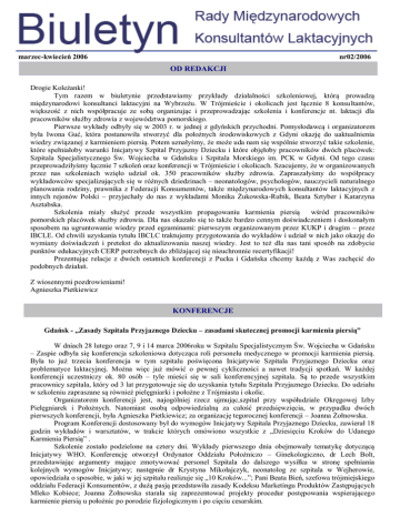 marzec-kwiecień 2006 nr02/2006 OD REDAKCJI Drogie Koleżanki! Tym razem w biuletynie przedstawiamy przykłady działalności szkoleniowej, którą prowadzą międzynarodowi konsultanci laktacyjni na Wybrzeżu. W Trójmieście i okolicach jest łącznie 8 konsultantów, większość z nich współpracuje ze sobą organizując i przeprowadzając szkolenia i konferencje nt. laktacji dla pracowników służby zdrowia z województwa pomorskiego. Pierwsze wykłady odbyły się w 2003 r. w jednej z gdyńskich przychodni. Pomysłodawcą i organizatorem była Iwona Guć, która postanowiła stworzyć dla położnych środowiskowych z Gdyni okazję do uaktualnienia wiedzy związanej z karmieniem piersią. Potem uznałyśmy, że może uda nam się wspólnie stworzyć takie szkolenie, które spełniałoby warunki Inicjatywy Szpital Przyjazny Dziecku i które objęłoby pracowników dwóch placówek: Szpitala Specjalistycznego Św. Wojciecha w Gdańsku i Szpitala Morskiego im. PCK w Gdyni. Od tego czasu przeprowadziłyśmy łącznie 7 szkoleń oraz konferencji w Trójmieście i okolicach. Szacujemy, że w organizowanych przez nas szkoleniach wzięło udział ok. 350 pracowników służby zdrowia. Zapraszałyśmy do współpracy wykładowców specjalizujących się w różnych dziedzinach – neonatologów, psychologów, nauczycieli naturalnego planowania rodziny, prawnika z Federacji Konsumentów, także międzynarodowych konsultantów laktacyjnych z innych rejonów Polski – przyjechały do nas z wykładami Monika Żukowska-Rubik, Beata Sztyber i Katarzyna Asztabska. Szkolenia miały służyć przede wszystkim propagowaniu karmienia piersią wśród pracowników pomorskich placówek służby zdrowia. Dla nas okazało się to także bardzo cennym doświadczeniem i doskonałym sposobem na ugruntowanie wiedzy przed egzaminami: pierwszym organizowanym przez KUKP i drugim – przez IBCLE. Od chwili uzyskania tytułu IBCLC traktujemy przygotowania do wykładów i udział w nich jako okazję do wymiany doświadczeń i pretekst do aktualizowania naszej wiedzy. Jest to też dla nas tani sposób na zdobycie punktów edukacyjnych CERP potrzebnych do zbliżającej się nieuchronnie recertyfikacji! Prezentując relacje z dwóch ostatnich konferencji z Pucka i Gdańska chcemy każdą z Was zachęcić do podobnych działań. Z wiosennymi pozdrowieniami! Agnieszka Pietkiewicz KONFERENCJE Gdańsk - „Zasady Szpitala Przyjaznego Dziecku – zasadami skutecznej promocji karmienia piersią” W dniach 28 lutego oraz 7, 9 i 14 marca 2006roku w Szpitalu Specjalistycznym Św. Wojciecha w Gdańsku – Zaspie odbyła się konferencja szkoleniowa dotycząca roli personelu medycznego w promocji karmienia piersią. Była to już trzecia konferencja w tym szpitalu poświęcona Inicjatywie Szpitala Przyjaznego Dziecku oraz problematyce laktacyjnej. Można więc już mówić o pewnej cykliczności a nawet tradycji spotkań. W każdej konferencji uczestniczy ok. 80 osób – tyle mieści się w sali konferencyjnej szpitala. Są to przede wszystkim pracownicy szpitala, który od 3 lat przygotowuje się do uzyskania tytułu Szpitala Przyjaznego Dziecku. Do udziału w szkoleniu zapraszane są również pielęgniarki i położne z Trójmiasta i okolic. Organizatorem konferencji jest, najogólniej rzecz ujmując,szpital przy współudziale Okręgowej Izby Pielęgniarek i Położnych. Natomiast osobą odpowiedzialną za całość przedsięwzięcia, w przypadku dwóch pierwszych konferencji, była Agnieszka Pietkiewicz; za organizację tegorocznej konferencji – Joanna Żołnowska. Program Konferencji dostosowany był do wymogów Inicjatywy Szpitala Przyjaznego Dziecku, zawierał 18 godzin wykładów i warsztatów, w trakcie których omówiono wszystkie z „Dziesięciu Kroków do Udanego Karmienia Piersią” . Szkolenie zostało podzielone na cztery dni. Wykłady pierwszego dnia obejmowały tematykę dotyczącą Inicjatywy WHO. Konferencję otworzył Ordynator Oddziału Położniczo – Ginekologiczno, dr Lech Bolt, przedstawiając argumenty mające zmotywować personel Szpitala do dalszego wysiłku w stronę spełniania kolejnych wymogów Inicjatywy; następnie dr Krystyna Mikołajczyk, neonatolog ze szpitala w Wejherowie, opowiedziała o sposobie, w jaki w jej szpitalu realizuje się „10 Kroków...”; Pani Beata Bień, szefowa trójmiejskiego oddziału Federacji Konsumentów, z dużą pasją przedstawiła zasady Kodeksu Marketingu Produktów Zastępujących Mleko Kobiece; Joanna Żołnowska starała się zaprezentować projekty procedur postępowania wspierającego karmienie piersią u położnic po porodzie fizjologicznym i po cięciu cesarskim. Pewną odskocznią tematyczną były wykłady pani Magdaleny Chrzan – szpitalnego psychologa – dotyczące zasad komunikacji w poradnictwie laktacyjnym oraz problemom emocjonalnym, które się wiążą z porodem. Pani dr Ewa Głuszczak, neonatolog, przedstawiła problemy w karmieniu piersią wynikające ze wcześniactwa i powikłań neurologicznych. Kolejne trzy dni konferencji należały do Agnieszki Pietkiewicz. Było dla niej prawdziwy wykładowy maraton. W ciągu 12 godzin przedstawiła w sposób niezwykle zajmujący, a zarazem wyczerpujący fizjologię laktacji, rozprawiła się z krążącymi mitami o karmieniu piersią, opowiedziała o problemach laktacyjnych i ich rozwiązywaniu, o alternatywnych metodach podawania pokarmu i o wielu innych zagadnieniach związanych ze wspieraniem matek rozpoczynających karmienie piersią. Wykłady przeplatane były zajęciami warsztatowymi, a każdy dzień zajęć zakończony był testem – pytania były podchwytliwe…ale uczestnicy konferencji dali sobie z nimi radę (chciałoby się rzec – wspólnymi siłami). Wszyscy uczestnicy konferencji mieli też możliwość uczestniczenia w warsztatach psychologicznych „Skuteczna komunikacja z kobietami w okresie okołoporodowym” oraz wysłuchania wykładu Magdaleny Chrzan o wspomaganiu tw