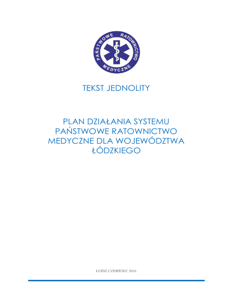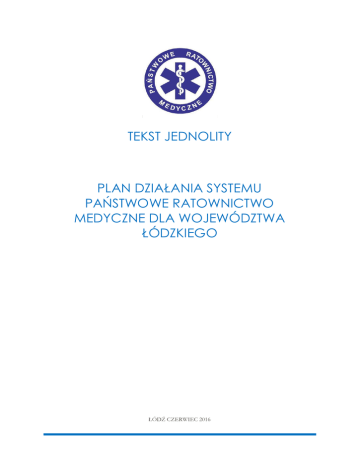 TEKST JEDNOLITY PLAN DZIAŁANIA SYSTEMU PAŃSTWOWE RATOWNICTWO MEDYCZNE DLA WOJEWÓDZTWA ŁÓDZKIEGO ŁÓDŹ CZERWIEC 2016 Tekst jednolity Planu działania systemu Państwowe Ratownictwo Medyczne dla Województwa Łódzkiego opracowany na podstawie: Planu działania systemu Państwowe Ratownictwo Medyczne dla Województwa Łódzkiego zatwierdzonego przez Ministra Zdrowia w dniu 11 sierpnia 2015 r. Aneksu Nr 1 zatwierdzonego przez Ministra Zdrowia w dniu 19 kwietnia 2016 r. Aneksu Nr 2 zatwierdzonego przez Ministra Zdrowia w dniu 22 czerwca 2016 r. 2|ST R ON A Spis treści ROZDZIAŁ I: Charakterystyka potencjalnych zagrożeń dla życia i zdrowia ....................................................................................................................... 7 I. 1. A. Sieć komunikacyjna ............................................................................................................ 7 Charakterystyka ogólna, .............................................................................................................................................. 7 A.1. Komunikacja drogowa ........................................................................................................................................... 8 A.2. Komunikacja kolejowa ......................................................................................................................................... 11 A.3. Komunikacja lotnicza ........................................................................................................................................... 12 A.4. Przewóz towarów niebezpiecznych ................................................................................................................... 14 B. Mapy ............................................................................................................................................................................. 18 2. Struktura urbanistyki, ze szczególnym uwzględnieniem zakładów zwiększonego ryzyka i zakładów dużego ryzyka .......................................................................... 18 A. Krótka charakterystyka ogólna ................................................................................................................................ 18 B. Opis zagrożeń i miejsc szczególnie niebezpiecznych (zakłady dużego i zwiększonego ryzyka) .................. 21 B.1. Zagrożenia przemysłowe ..................................................................................................................................... 21 B.2. Zakłady o zwiększonym ryzyku i zakłady o dużym ryzyku ........................................................................... 23 B.3. Zagrożenia budowlane ......................................................................................................................................... 25 B.4. Zagrożenia związane z transportem produktów naftowych i gazu rurociągami ....................................... 26 B.5. Zagrożenia radiacyjne........................................................................................................................................... 27 B.6. Zagrożenia spowodowane siłami natury – powodzie, huragany .................................................................. 27 B.7. Zagrożenia pożarami ............................................................................................................................................ 30 C. Mapy ............................................................................................................................................................................. 31 3. Struktura demograficzna ............................................................................................... 31 A. Krótka charakterystyka ogólna w układzie powiatowym (struktura zaludnienia, ludność według płci i wieku, gęstość zaludnienia, czasowe skupiska ludzkie itp.), .......................................................................................... 31 A.1. Struktura zaludnienia ............................................................................................................................................ 31 A.2. Gęstość zaludnienia .............................................................................................................................................. 32 A.3. Struktura ludności według płci i wieku w układzie powiatowym ................................................................ 33 A.4. Ruch naturalny ludności ...................................................................................................................................... 35 A.5. Migracje ludności .................................................................................................................................................. 35 B. Opis szczególnych zagrożeń .................................................................................................................................... 36 B.1. Czasowe skupiska ludności ................................................................................................................................. 36 B.2. Zagrożenia wynikające z warunków pracy w tym wypadki w rolnictwie .................................................... 37 4. Liczba wyjazdów zespołów ratownictwa medycznego na obszarze województwa ................................................................................................................................................... 39 A. Krótka charakterystyka ogólna, czasy dotarcia ..................................................................................................... 39 B. Tabele 1 i 2 sporządzone w aplikacji umożliwiającej dokonywanie obliczeń w formie tabelarycznej ........ 42 3|ST R ON A 5. Liczba wylotów lotniczych zespołów ratownictwa medycznego na obszarze województwa......................................