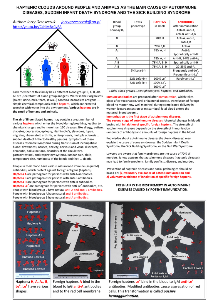 HAPTENIC CLOUDS AROUND PEOPLE AND ANIMALS AS THE MAIN CAUSE OF AUTOIMMUNE DISEASES, SUDDEN INFANT DEATH SYNDROME AND THE SICK BUILDING SYNDROME Author: Jerzy Grzeszczuk [email protected] http://youtu.be/CxblMBcCvEA Blood group Bombay 0h Lewis phenotype HAPTENS in smell 0 78% H B A1 78% B,H 78% A, H A2 A1B A2B 78% A, H 78% A, B, H 78% A, B, H 6% Le(a-b-) 22% Le(a+b-) 72% Le(a-b+) Each member of this family has a different blood group: 0, A, B, AB. All are „secretors” of blood group antigens. Water in their organisms (sweat, urine, milk, tears, saliva…) contains incomplete antigens --simple chemical compounds called haptens, which are excreted together with water into the environment. Various haptens are in the smell of humans and animals. a ANTIBODIES after immunization Anti-H, anti-A, anti-B, anti-A,B Anti-A, anti-B, anti-A,B Anti-A Anti-B, Sporadically anti-H Anti-B, 1-8% anti-A1 Sporadically anti-H 22-35% anti-A1 a Frequently anti-Le , b Frequently anti-Le b Rarely anti-Le 100% Le a 100% Le , b 100% Le Table: Blood groups, Lewis phenotypes, haptens, and antibodies. Immune antibodies are produced after immunization, which takes place after vaccination, viral or bacterial disease, transfusion of foreign blood no matter how well matched; during complicated delivery in women (cesarean section or miscarriage) fetal blood enters the maternal bloodstream… Immunization is the first stage of autoimmune diseases. The air of ill-ventilated homes may contain a great number of The second stage of autoimmune diseases (chemical changes in blood) various haptens which enter the blood during breathing, leading to begins with inhalation of specific foreign haptens. The strength of chemical changes and to more than 160 diseases, like allergy, autism, autoimmune diseases depends on the strength of immunization diabetes, depression, epilepsy, Hashimoto’s, glaucoma, lupus, (amounts of antibody) and amounts of foreign haptens in the blood. migraine, rheumatoid arthritis, schizophrenia, multiple sclerosis … Knowledge about autoimmune diseases (haptenic diseases) may sudden death of hitherto healthy persons. Symptoms of these explain the cause of some syndromes: the Sudden Infant Death diseases resemble symptoms during transfusion of incompatible Syndrome, the Sick Building Syndrome, or the Gulf War Syndrome. blood: drowsiness, nausea, anxiety, nervous and visual disorders, dementia, hallucinations, disorders of the circulatory, Lawyers are aware that family problems are the cause of 70% of gastrointestinal, and respiratory systems, lumbar pain, chills, murders. It now appears that autoimmune diseases (haptenic diseases) temperature rise, numbness of the hands and feet, … death. may lead to family problems, family conflicts, divorce, and murder. People in their blood have various natural and immune (acquired) Prevention of haptenic diseases and social pathologies should be antibodies, which protect against foreign antigens (haptens). based on: (1) voluntary avoidance of potent immunization and Haptens A are pathogenic for persons with anti-A antibodies. 2) voluntary avoidance of inhalation of specific foreign haptens. Haptens B are pathogenic for persons with anti-B antibodies. Haptens H are pathogenic for persons with anti-H antibodies. a a FRESH AIR IS THE BEST REMEDY IN AUTOIMMUNE Haptens Le are pathogenic for persons with anti-Le antibodies, etc. DISEASES CAUSED BY POTENT IMMUNIZATION. People with blood group 0 have natural anti-A and anti-B antibodies. People with blood group A have natural anti-B antibodies. People with blood group B have natural anti-A antibodies. Haptens: H, A, A1, B, Lea, Leb have various shapes. Foreign haptens A bind in the blood to IgG anti-A antibodies and to the red cell membrane. Foreign haptens Lea bind in the blood to IgM anti-Lea antibodies. Modified antibodies cause aggregation of red cells. This transformation is called passive hemagglutination.