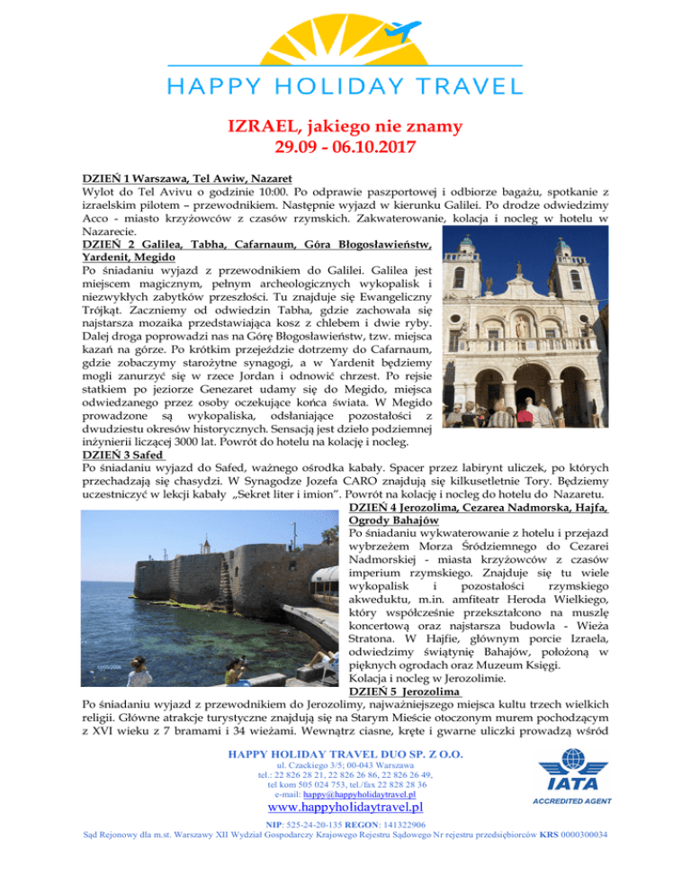 IZRAEL, jakiego nie znamy 29.09 - 06.10.2017 DZIEŃ 1 Warszawa, Tel Awiw, Nazaret Wylot do Tel Avivu o godzinie 10:00. Po odprawie paszportowej i odbiorze bagażu, spotkanie z izraelskim pilotem – przewodnikiem. Następnie wyjazd w kierunku Galilei. Po drodze odwiedzimy Acco - miasto krzyżowców z czasów rzymskich. Zakwaterowanie, kolacja i nocleg w hotelu w Nazarecie. DZIEŃ 2 Galilea, Tabha, Cafarnaum, Góra Błogosławieństw, Yardenit, Megido Po śniadaniu wyjazd z przewodnikiem do Galilei. Galilea jest miejscem magicznym, pełnym archeologicznych wykopalisk i niezwykłych zabytków przeszłości. Tu znajduje się Ewangeliczny Trójkąt. Zaczniemy od odwiedzin Tabha, gdzie zachowała się najstarsza mozaika przedstawiająca kosz z chlebem i dwie ryby. Dalej droga poprowadzi nas na Górę Błogosławieństw, tzw. miejsca kazań na górze. Po krótkim przejeździe dotrzemy do Cafarnaum, gdzie zobaczymy starożytne synagogi, a w Yardenit będziemy mogli zanurzyć się w rzece Jordan i odnowić chrzest. Po rejsie statkiem po jeziorze Genezaret udamy się do Megido, miejsca odwiedzanego przez osoby oczekujące końca świata. W Megido prowadzone są wykopaliska, odsłaniające pozostałości z dwudziestu okresów historycznych. Sensacją jest dzieło podziemnej inżynierii liczącej 3000 lat. Powrót do hotelu na kolację i nocleg. DZIEŃ 3 Safed Po śniadaniu wyjazd do Safed, ważnego ośrodka kabały. Spacer przez labirynt uliczek, po których przechadzają się chasydzi. W Synagodze Jozefa CARO znajdują się kilkusetletnie Tory. Będziemy uczestniczyć w lekcji kabały „Sekret liter i imion”. Powrót na kolację i nocleg do hotelu do Nazaretu. DZIEŃ 4 Jerozolima, Cezarea Nadmorska, Hajfa, Ogrody Bahajów Po śniadaniu wykwaterowanie z hotelu i przejazd wybrzeżem Morza Śródziemnego do Cezarei Nadmorskiej - miasta krzyżowców z czasów imperium rzymskiego. Znajduje się tu wiele wykopalisk i pozostałości rzymskiego akweduktu, m.in. amfiteatr Heroda Wielkiego, który współcześnie przekształcono na muszlę koncertową oraz najstarsza budowla - Wieża Stratona. W Hajfie, głównym porcie Izraela, odwiedzimy świątynię Bahajów, położoną w pięknych ogrodach oraz Muzeum Księgi. Kolacja i nocleg w Jerozolimie. DZIEŃ 5 Jerozolima Po śniadaniu wyjazd z przewodnikiem do Jerozolimy, najważniejszego miejsca kultu trzech wielkich religii. Główne atrakcje turystyczne znajdują się na Starym Mieście otoczonym murem pochodzącym z XVI wieku z 7 bramami i 34 wieżami. Wewnątrz ciasne, kręte i gwarne uliczki prowadzą wśród HAPPY HOLIDAY TRAVEL DUO SP. Z O.O. ul. Czackiego 3/5; 00-043 Warszawa tel.: 22 826 28 21, 22 826 26 86, 22 826 26 49, tel kom 505 024 753, tel./fax 22 828 28 36 e-mail: [email protected] www.happyholidaytravel.pl NIP: 525-24-20-135 REGON: 141322906 Sąd Rejonowy dla m.st. Warszawy XII Wydział Gospodarczy Krajowego Rejestru Sądowego Nr rejestru przedsiębiorców KRS 0000300034 dzielnic Muzułmańskiej, Chrześcijańskiej, Żydowskiej i Ormiańskiej do najważniejszego miejsca miasta - Wzgórza Świątynnego. Według tradycji jest to biblijne Wzgórze Moria, na którym Abraham miał złożyć w ofierze Izaaka. W miejscu tym Salomon zbudował Świątynię, w której umieścił Arkę Przymierza. W odbudowanej drugiej Świątyni nauczał Jezus, tu był także ofiarowany jako niemowlę i stad wyrzucił kupców. Było to miejsce nawiedzone przez Mahometa i według tradycji muzułmańskiej stąd został wzięty do nieba. Żydzi natomiast czczą przylegający od strony zachodniej do placu pozostały fragment muru otaczającego niegdyś świątynię, nazywany Ścianą Płaczu - Kotel Hama Aravi. Przychodzą tu, aby tradycyjnie opłakiwać zburzenie świątyni przez Rzymian w 70 r. Dla chrześcijan miejscem kultu sakralnego jest Bazylika Grobu Pańskiego, wznosząca się w dzielnicy chrześcijańskiej Starego Miasta. Wewnątrz bazyliki najważniejszym miejscem jest Grób Jezusa. Dzielnicę muzułmańską i chrześcijańska łączy ulica Via Dolorosa. Według tradycji to właśnie tędy był prowadzony Jezus na ukrzyżowanie. Na południe od Starego Miasta, za bramą Syjońską, na górze Syjon wznosi się Wieczernik, pomieszczenie, w którym Jezus z Apostołami spożył ostatnią wieczerzę. Jest to pierwszy kościół chrześcijański. Budowla pochodzi z XVI wieku. Znajduje się w niej także szczególnie czczony przez Żydów Grób Dawida. Powrót do hotelu na kolacje i nocleg. DZIEŃ 6 Góra Oliwna, Getsemani, Betlejem, Tunel Jerozolimski Po śniadaniu wyjazd na Górę Oliwną, skąd według tradycji, Jezus wstępuje do nieba. Wcześniej przychodził tu ze swoimi uczniami aby się modlić i medytować. Stąd też zapłakał nad Jerozolimą, zapowiadając jej upadek i zniszczenie. Następnie wizyta w Getsemanii nazywanym Kościołem Narodów, gdyż 16 narodów przyczyniło się do jego budowy. Od IV w. w Grocie Pojmania odbywały się chrześcijańskie obrzędy kultowe. W pobliskim sąsiedztwie Groty Pojmania znajduje się Grób Matki Boskiej. Imponujące schody prowadzą do podziemnej krypty na planie krzyża. Na zboczach Góry Oliwnej rozpościera się największy cmentarz Jerozolimy. Już od II tysiącleci p.n.e drążono tutaj grobowce. Swoich zmarłych grzebali Żydzi, chrześcijanie i muzułmanie. Tradycje trzech monoteistycznych religii głoszą, że na kamiennym cmentarzu i znajdującej się poniżej Dolinie Jazafata rozpocznie się zmartwychwstanie ludzi w dniu Sądu Ostatecznego. Z Góry Oliwnej rozpościera się piękna panorama na Stare Miasto i Wzgórze Świątynne z pozłacaną Kopułą na Skale. Po południu wyjazd do Betlejem – wizyta w Bazylice Narodzenia Świętego – najstarszym kościele na świecie. Wieczorem zwiedzanie tunelu Jerozolimskiego. Powrót do hotelu na kolację i nocleg. DZIEŃ 7 Morze Martwe, Qumran Po śniadaniu wyjazd z przewodnikiem nad Morze Martwe. Powietrze nad morzem jest wyjątkowo suche, a temperatura wysoka