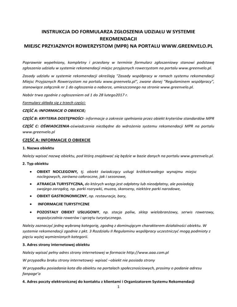 INSTRUKCJA DO FORMULARZA ZGŁOSZENIA UDZIAŁU W SYSTEMIE REKOMENDACJI MIEJSC PRZYJAZNYCH ROWERZYSTOM (MPR) NA PORTALU WWW.GREENVELO.PL Poprawnie wypełniony, kompletny i przesłany w terminie formularz zgłoszeniowy stanowi podstawę zgłoszenia udziału w systemie rekomendacji miejsc przyjaznych rowerzystom na portalu www.greenvelo.pl. Zasady udziału w systemie rekomendacji określają "Zasady współpracy w ramach systemu rekomendacji Miejsc Przyjaznych Rowerzystom na portalu www.greenvelo.pl", zwane danej "Regulaminem współpracy", stanowiące załącznik nr 1 do ogłoszenia o naborze, umieszczonego na stronie www.greenvelo.pl. Nabór trwa zgodnie z ogłoszeniem od 1 do 28 lutego2017 r. Formularz składa się z trzech części: CZĘŚĆ A: INFORMACJE O OBIEKCIE; CZĘŚĆ B: KRYTERIA DOSTĘPNOŚCI- informacje o zakresie spełniania przez obiekt kryteriów standardów MPR CZĘŚĆ C: OŚWIADCZENIA-oświadczenia niezbędne do wdrożenia systemu rekomendacji MPR na portalu www.greenvelo.pl CZĘŚĆ A: INFORMACJE O OBIEKCIE 1. Nazwa obiektu Należy wpisać nazwę obiektu, pod którą znajdować się będzie w bazie danych na portalu www.greenvelo.pl. 2. Typ obiektu • OBIEKT NOCLEGOWY, tj. obiekt świadczący usługi krótkotrwałego wynajmu miejsc noclegowych, zarówno całoroczne, jak i sezonowe, • ATRAKCJA TURYSTYCZNA, do których wstęp jest odpłatny lub nieodpłatny, ale posiadają swojego zarządcę, np. parki rozrywki, muzea, skanseny, niektóre parki narodowe, • OBIEKT GASTRONOMICZNY, np. restauracje, bary, • INFORMACJIE TURYSTYCZNE • POZOSTAŁY OBIEKT USŁUGOWY, np. stacja paliw, sklep wielobranżowy, serwis rowerowy, wypożyczalnia rowerów i sprzętu turystycznego. Należy zaznaczyć jedną wybraną kategorię, zgodną z dominującym charakterem działalności obiektu. W systemie rekomendacji zgodnie z pkt. 3 Rozdziału II Regulaminu współpracy uczestniczyć mogą podmioty z pięciu wyżej wymienionych kategorii. 3. Adres strony internetowej obiektu Należy wpisać pełny adres strony internetowej w formacie http://www.aaa.com.pl W przypadku braku strony internetowej- wpisać –obiekt nie posiada strony W przypadku posiadania kota dla obiektu na portalach społecznościowych, prosimy o podanie adresu fanpage’a 4. Adres poczty elektronicznej do kontaktu z klientami i Organizatorem Systemu Rekomendacji 1 Należy wpisać adres poczty elektronicznej w formacie np. [email protected] 5. Telefon kontaktowy Należy wpisać numer telefonu kontaktowego do obiektu 6. Lokalizacja obiektu a. województwo (wpisać) b. powiat (wpisać) c. gmina (wpisać) d. miejscowość (wpisać) e. kod pocztowy i miejscowość właściwa dla kodu pocztowego (wpisać) f. ulica (wypełnić) g. numer (wypełnić) UWAGA: adres lokalizacji obiektu należy wpisać zgodnie z wytycznymi. Położenie obiektu na terenie gmin korytarza Wschodniego Szlaku Rowerowego Green Velo stanowi jedno z kryteriów dostępu do systemu rekomendacji, zgodnie z pkt. 1 Rozdziału II Regulaminu współpracy. Lista gmin objętych działaniem stanowi załącznik nr 2a Regulaminu współpracy, a mapa korytarza szlaku Green Velo stanowi załączniki nr 1 a-e Regulaminu Współpracy. 7. Sezonowość • • obiekt całoroczny obiekt sezonowy UWAGA: w systemie rekomendacji dopuszczony jest udział obiektów całorocznych i sezonowych. Należy zaznaczyć "obiekt całoroczny" w przypadku obiektów czynnych cały rok, a "obiekt sezonowy" z podaniem miesięcy otwarcia obiektu, wpisując np.;( kwiecień - maj - czerwiec - lipiec - sierpień - wrzesień ) 8. Opis obiektu Pole opisowe (maksimum 500 znaków). INSTRUKCJA: należy opisać w syntetyczny sposób położenie i charakter obiektu, oraz cechy charakterystyczne. Organizator Systemu Rekomendacji zastrzega sobie prawo do redakcji treści i dokonania modyfikacji w opisie dla ujednolicenia sposobu opisu wszystkich obiektów na portalu www.greenvelo.pl. 7. Udogodnienia Należy zaznaczyć usługi dostępne w obiekcie wg listy • • • • • • • • • • • Akceptujemy Euro Akceptujemy płatność kartą Mówimy po angielsku Mówimy po niemiecku Mówimy po rosyjsku Parking strzeżony Obiekt przystosowany dla osób niepełnosprawnych Sprzedaż pamiątek Materiały informacyjne o obszarze i atrakcjach Fitness Club Usługi SPA/Wellness 2 • • • • • • • • • • Dostęp do internetu Klimatyzacja Basen Pokoje dla niepalących Sejf TV/Sat Usługi biznesowe (ksero, faks, konferencje) Oferta dla rodzin z dziećmi Serwis rowerowy Ładowanie rowerów elektrycznych CZĘŚĆ B: KRYTERIA DOSTĘPNOŚCI Zaproponowane w niniejszym Regulaminie kryteria służą wyłącznie do charakterystyki zakresu usług, oferowanych przez Miejsca Przyjazne Rowerzystom. Wszystkie zgłoszone, spełniające kryteria obowiązkowe i formalne (lokalizacja, kompletność i terminowość zgłoszenia) obiekty zostaną umieszczone na portalu www.greenvelo.pl oraz w dedykowanej aplikacji mobilnej. Proszę zaznaczyć poprzez wybranie jednej odpowiedzi „tak lub „nie”, które kryteria spełnia obiekt, a w przypadku, gdy dane kryterium nie dotyczy zgłaszanego obiektu, zaznaczyć "nie dotyczy". KRYTERIUM 1: Możliwość skorzystania przez turystę z pobytu na jedną dobę Dotyczy wyłącznie obiektów noclegowych i stanowi kryterium obowiązkowe. Opis kryterium zgodnie z regulaminem: Kryterium oznacza, że zainteresowany uzyskaniem rekomendacji MPR podmiot dysponuje minimum 6 miejscami noclegowymi i deklaruje gotowość przyjmowania rowerzystów na jedną dobę hotelową. Deklaracja jest wiążąca przez cały okres funkcjonowania obiektu. W przypadku obiektów sezonowych deklaracja jest wiążąca przez wskazane w formularzu zgłoszeniowym miesiące. KRYTERIUM 2: Możliwość bezpiecznego i nieodpłatnego przechowania rowerów Dotyczy wyłącznie obiektów noclegowych i stanowi kryterium obowiązkowe. Opis kryterium zgodnie z regulaminem: Kryterium oznacza, że zainteresowany uzyskaniem rekom