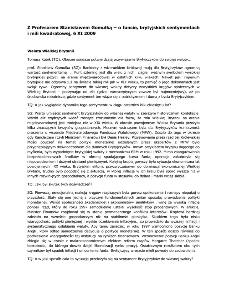 Z Profesorem Stanisławem Gomułką – o funcie, brytyjskich sentymentach i mili kwadratowej, 6 XI 2009 Waluta Wielkiej Brytanii Tomasz Kubik (TQ): Obecne sondaże potwierdzają przywiązanie Brytyjczyków do swojej waluty... prof. Stanisław Gomułka (SG): Banknoty z wizerunkiem Królowej mają dla Brytyjczyków ogromną wartość sentymentalną .. Funt szterling jest dla wielu z nich ciągle ważnym symbolem wysokiej brytyjskiej pozycji na arenie międzynarodowej w ostatnich kilku wiekach. Nawet jeśli imperium brytyjskie nie odgrywa już na świecie takiej roli jak w XIX wieku, to pamięć o jego dokonaniach jest wciąż żywa. Ogromny sentyment do własnej waluty dotyczy wszystkich kręgów społecznych w Wielkiej Brytanii – poczynając od elit (gdzie eurosceptycyzm zawsze był najmocniejszy), aż po środowiska robotnicze, gdzie sentyment ten wiąże się z patriotyzmem i dumą z bycia Brytyjczykiem. TQ: A jak wyglądała dynamika tego sentymentu w ciągu ostatnich kilkudziesięciu lat? SG: Warto umieścić sentyment Brytyjczyków do własnej waluty w szerszym historycznym kontekście. Wśród elit rządzących widać rosnące zrozumienie dla faktu, że rola Wielkiej Brytanii na arenie międzynarodowej jest mniejsza niż w XIX wieku. W okresie powojennym Wielka Brytania przeżyła kilka znaczących kryzysów gospodarczych. Mocnym wstrząsem była dla Brytyjczyków konieczność proszenia o wsparcie Międzynarodowego Funduszu Walutowego (MFW). Doszło do tego w okresie gdy Kanclerzem (czyli Ministrem Finansów) był Denis Healey. Przyjmowanie przez rząd Jej Królewskiej Mości pouczeń na temat polityki monetarnej udzielanych przez ekspertów z MFW było przygnębiającym doświadczeniem dla dumnych Brytyjczyków. Innym przykładem kryzysu dającego do myślenia, było wypadnięcie brytyjskiej waluty z mechanizmu ERM w roku 1992. Mimo zaangażowania bezprecedensowych środków w obronę spadającego kursu funta, operacja zakończyła się niepowodzeniem i dużymi stratami pieniężnymi. Kolejną kroplą goryczy była sytuacja ekonomiczna lat powojennych XX wieku. Brytyjskim elitom, przyzwyczajonym do dominacji ekonomicznej Wielkiej Brytanii, trudno było pogodzić się z sytuacją, w której inflacja w ich kraju była sporo wyższa niż w innych rozwiniętych gospodarkach, a pozycja funta w stosunku do dolara i marki wciąż słabła. TQ: Jaki był skutek tych doświadczeń? SG: Pierwszą, emocjonalną reakcją kręgów rządzących była gorycz upokorzenia i rosnący niepokój o przyszłość. Stały się one jedną z przyczyn fundamentalnych zmian sposobu prowadzenia polityki monetarnej. Wśród społeczności akademickiej i ekonomistów- analityków , winę za wysoką inflację ponosił rząd, który do roku 1997 samodzielnie ustalał wysokość stóp procentowych. W efekcie, Minister Finansów znajdował się w stanie permanentnego konfliktu interesów. Rządowi bardziej zależało na wzroście gospodarczym niż na stabilności pieniądza. Skutkiem tego była niska wiarygodnośc polityki pieniężnej i wyskie oczekiwania inflacyjne., co prowadziło do wyższej inflacji i systematycznego osłabiania waluty. Aby temu zaradzić, w roku 1997 wzmocniono pozycję Banku Anglii, który odtąd samodzielnie decyduje o polityce monetarnej. W ten sposób doszło również do podniesienia wiarygodności tej instytucji na rynkach finansowych. Wzmocnienie pozycji Banku Anglii zbiegło się w czasie z makroekonomicznym efektem reform rządów Margaret Thatcher (spadek bezrobocia, do którego doszło dzięki liberalizacji rynku pracy). Ostatecznym rezultatem obu tych czynników był spadek inflacji i umocnienie funta. Brytyjczycy wreszcie mieli powody do zadowolenia. TQ: A w jaki sposób cała ta sytuacja przełożyła się na sentyment Brytyjczyków do własnej waluty? SG: Głównym argumentem zwolenników rezygnacji z funta na rzecz euro było uzyskanie przez Wielką Brytanię niskich stóp procentowych i równocześnie stabilnej, mocnej waluty. Tymczasem, w ciągu ostatnich 10 lat oba te warunki ziściły się w odniesieniu do funta. Główne argumenty za przystąpieniem do strefy euro straciły więc swoją aktualność. Dodatkowym powodem do zadowolenia ze status quo jest świadomość, że polityka pieniężna jest sprawowana w interesie Brytyjczyków, a jej ośrodek decyzyjny znajduje się w Londynie. TQ: Jednak nawet w obecnej sytuacji, w Wielkiej Brytanii padają głosy za wejściem do strefy euro. Komu na tym zależy? SG: Najbardziej pro-unijną partią w Wielkiej Brytanii jest Partia Liberalna – jednak od dawna nie ma ona dostępu do władzy. Obecnie rządząca Partia Pracy uważa, że Wielka Brytania powinna odgrywać większą niż obecnie rolę w Unii Europejskiej. W idealnym scenariuszu, powinna ona dołączyć do Francji i Niemiec, i wspólnie z nimi ustalać główne zręby unijnej polityki., Takie wzmocnienie pozycji Wielkiej Brytanii nie będzie jednak możliwe dopóki pozostaje ona poza strefą euro. Jednocześnie, Wielka Brytania ma duży sentyment do Stanów Zjednoczonych, z którymi od lat łączy Brytyjczyków tak zwane „special relationship”. Ten atlantycki sojusz nie zawsze działa jak należy, ale jego strategiczne znaczenie jest ważnym argumentem dla wszystkich, którzy nie chcą głębszej integracji Wielkiej Brytanii z Unią Europejską. Można powiedzieć, że Brytyjczycy stoją obecnie na rozdrożu. To, co zrobią z własną walutą, będzie zależało od pozycji, jaką zechcą zajmować na globalnej mapie politycznej – bliżej Stanów Zjednoczonych, czy bliżej Europy kontynentalnej. TQ: Patrząc czysto hipotetycznie, co musiałoby się wydarzyć, aby Brytyjczycy nagle zapragnęli wejść do strefy euro? SG: Dobre pytanie – na razie nie widać niczego, co zwiastowałoby tak nagłą zmianę sentymentów. Można jednak wyróżnić czynniki, których nałożenie się na siebie przyspieszyłoby ten proces. Pierwszy z nich to detronizacja dolara przez eu