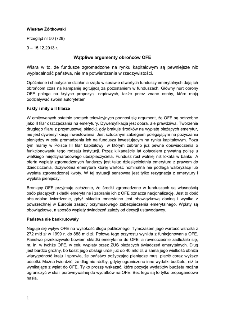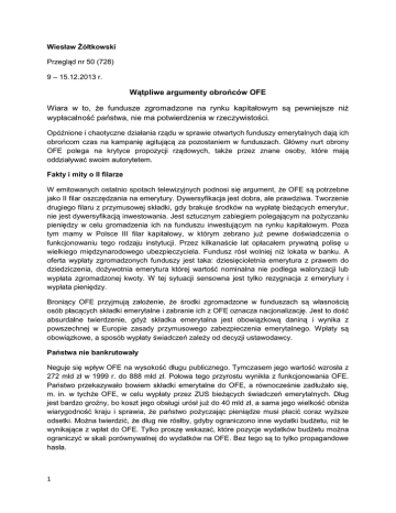 Wiesław Żółtkowski Przegląd nr 50 (728) 9 – 15.12.2013 r. Wątpliwe argumenty obrońców OFE Wiara w to, że fundusze zgromadzone na rynku kapitałowym są pewniejsze niż wypłacalność państwa, nie ma potwierdzenia w rzeczywistości. Opóźnione i chaotyczne działania rządu w sprawie otwartych funduszy emerytalnych dają ich obrońcom czas na kampanię agitującą za pozostaniem w funduszach. Główny nurt obrony OFE polega na krytyce propozycji rządowych, także przez znane osoby, które mają oddziaływać swoim autorytetem. Fakty i mity o II filarze W emitowanych ostatnio spotach telewizyjnych podnosi się argument, że OFE są potrzebne jako II filar oszczędzania na emerytury. Dywersyfikacja jest dobra, ale prawdziwa. Tworzenie drugiego filaru z przymusowej składki, gdy brakuje środków na wypłatę bieżących emerytur, nie jest dywersyfikacją inwestowania. Jest sztucznym zabiegiem polegającym na pożyczaniu pieniędzy w celu gromadzenia ich na funduszu inwestującym na rynku kapitałowym. Poza tym mamy w Polsce III filar kapitałowy, w którym zebrano już pewne doświadczenia o funkcjonowaniu tego rodzaju instytucji. Przez kilkanaście lat opłacałem prywatną polisę u wielkiego międzynarodowego ubezpieczyciela. Fundusz rósł wolniej niż lokata w banku. A oferta wypłaty zgromadzonych funduszy jest taka: dziesięcioletnia emerytura z prawem do dziedziczenia, dożywotnia emerytura której wartość nominalna nie podlega waloryzacji lub wypłata zgromadzonej kwoty. W tej sytuacji sensowna jest tylko rezygnacja z emerytury i wypłata pieniędzy. Broniący OFE przyjmują założenie, że środki zgromadzone w funduszach są własnością osób płacących składki emerytalne i zabranie ich z OFE oznacza nacjonalizację. Jest to dość absurdalne twierdzenie, gdyż składka emerytalna jest obowiązkową daniną i wynika z powszechnej w Europie zasady przymusowego zabezpieczenia emerytalnego. Wpłaty są obowiązkowe, a sposób wypłaty świadczeń zależy od decyzji ustawodawcy. Państwa nie bankrutowały Neguje się wpływ OFE na wysokość długu publicznego. Tymczasem jego wartość wzrosła z 272 mld zł w 1999 r. do 888 mld zł. Połowa tego przyrostu wynikła z funkcjonowania OFE. Państwo przekazywało bowiem składki emerytalne do OFE, a równocześnie zadłużało się, m. in. w tychże OFE, w celu wypłaty przez ZUS bieżących świadczeń emerytalnych. Dług jest bardzo groźny, bo koszt jego obsługi urósł już do 40 mld zł, a sama jego wielkość obniża wiarygodność kraju i sprawia, że państwo pożyczając pieniądze musi płacić coraz wyższe odsetki. Można twierdzić, że dług nie rósłby, gdyby ograniczono inne wydatki budżetu, niż te wynikające z wpłat do OFE. Tylko proszę wskazać, które pozycje wydatków budżetu można ograniczyć w skali porównywalnej do wydatków na OFE. Bez tego są to tylko propagandowe hasła. 1 Pojawiła się koncepcja długu „ukrytego”, rozumianego jako suma różnych przyszłych zobowiązań państwa, w tym przede wszystkim wobec przyszłych emerytów. Są to liczby ogromne, znacznie przewyższające obecne PKB i prawdziwe, przy przyjętych założeniach. Ale założenia mówiące o tym, że państwo w przyszłości będzie musiało płacić, bez wskazania, że będzie także miało dochody, jest pozbawiona sensu ekonomicznego. A wiara w to, iż fundusze zgromadzone na rynku kapitałowym są bardziej pewne, niż wypłacalność państwa nie znajduje potwierdzenia w rzeczywistości. W ostatnich latach bankrutowały fundusze, banki i korporacje, ale nie państwa, które choć mogą mieć ograniczoną wypłacalność, mają zdolność do przetrwania każdego kryzysu. I ciągle wypłacają emerytury, czego nie robią bankrutujące prywatne fundusze emerytalne. OFE otrzymywały horrendalnie wysokie opłaty za zarządzanie, najpierw 10%, teraz 3,5%. Obrońcy funduszy słusznie wskazują, że opłaty te były określone przez ustawodawcę. Przemilczają natomiast fakt, że zostały podpowiedziane przez ekspertów, którzy tworzyli ramy funkcjonowania OFE, a teraz ich bronią. Wrażliwi obrońcy Obrońcy modelu emerytalnego z OFE są bardzo wrażliwi, gdy wskazuje się, że mają związki z reformą emerytalną z 1999 r. i są powiązani z zarabiającymi na niej instytucjami finansowymi. To może dziwić. Jeśli było się autorem sytemu, ma się prawo do jego obrony, jednak inni też mają prawo przypominać ówczesne założenia i wtykać rozbieżność między nimi a późniejszą praktyką. Przede wszystkim to, że nie zrealizowano (nierealnych od początku) założeń, którymi uzasadniano reformę emerytalną. Poza tym nie jest praktyką normalną, gdy w dużym kraju europejskim, jakim jest Polska, w publicznych mediach sytuację gospodarczą kraju objaśniają głownie eksperci reprezentujący zagraniczne instytucje finansowe. Czy można sobie wyobrazić taką sytuację w Niemczech, we Francji, czy Szwecji? Dyskusja o systemie emerytalnym skupia się na funkcjonowaniu OFE, nie odnosi się zaś do istoty reformy z 1999 r. Tymczasem reforma ta polegała na odejściu od zdefiniowanego świadczenia do zdefiniowanej składki. Wcześniej była określona wysokość składki, a wysokość emerytury zależała od przyjętego systemu jej wyznaczania. W praktyce pomniejszano wysokość emerytur osobom, które wpłaciły największe składki, a dodawano tym, którzy zgromadzili mniejsze składki. W ten sposób wszyscy mogli mieć emerytury pozwalające na przeżycie. W założeniach reformy, inaczej niż w krajach starej Unii, przyjęto, że wysokość świadczeń będzie zależna tylko od wartości indywidualnie zgromadzonego funduszu. Oznacza to, że bogatsi będą mieli emerytury dużo większe, a biedniejsi minimalne, nie pozwalające na przeżycie. Bezrobotni oraz pracujących, ale nie płacących składek emerytalnych, nie będą oni mieli żadnej emerytury. Oszustwem intelektualnym reformy emerytalne