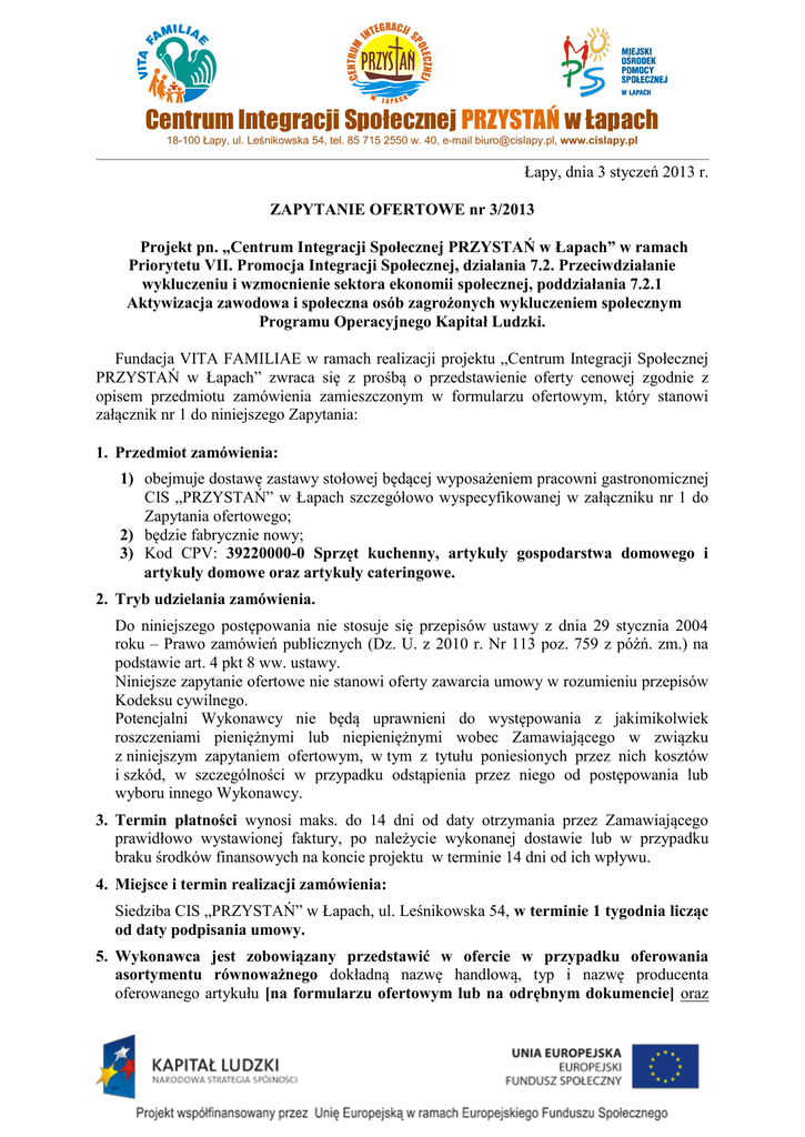 Centrum Integracji Społecznej PRZYSTAŃ w Łapach 18-100 Łapy, ul. Leśnikowska 54, tel. 85 715 2550 w. 40, e-mail [email protected], www.cislapy.pl Łapy, dnia 3 styczeń 2013 r. ZAPYTANIE OFERTOWE nr 3/2013 Projekt pn. „Centrum Integracji Społecznej PRZYSTAŃ w Łapach” w ramach Priorytetu VII. Promocja Integracji Społecznej, działania 7.2. Przeciwdziałanie wykluczeniu i wzmocnienie sektora ekonomii społecznej, poddziałania 7.2.1 Aktywizacja zawodowa i społeczna osób zagrożonych wykluczeniem społecznym Programu Operacyjnego Kapitał Ludzki. Fundacja VITA FAMILIAE w ramach realizacji projektu „Centrum Integracji Społecznej PRZYSTAŃ w Łapach” zwraca się z prośbą o przedstawienie oferty cenowej zgodnie z opisem przedmiotu zamówienia zamieszczonym w formularzu ofertowym, który stanowi załącznik nr 1 do niniejszego Zapytania: 1. Przedmiot zamówienia: 1) obejmuje dostawę zastawy stołowej będącej wyposażeniem pracowni gastronomicznej CIS „PRZYSTAŃ” w Łapach szczegółowo wyspecyfikowanej w załączniku nr 1 do Zapytania ofertowego; 2) będzie fabrycznie nowy; 3) Kod CPV: 39220000-0 Sprzęt kuchenny, artykuły gospodarstwa domowego i artykuły domowe oraz artykuły cateringowe. 2. Tryb udzielania zamówienia. Do niniejszego postępowania nie stosuje się przepisów ustawy z dnia 29 stycznia 2004 roku – Prawo zamówień publicznych (Dz. U. z 2010 r. Nr 113 poz. 759 z późń. zm.) na podstawie art. 4 pkt 8 ww. ustawy. Niniejsze zapytanie ofertowe nie stanowi oferty zawarcia umowy w rozumieniu przepisów Kodeksu cywilnego. Potencjalni Wykonawcy nie będą uprawnieni do występowania z jakimikolwiek roszczeniami pieniężnymi lub niepieniężnymi wobec Zamawiającego w związku z niniejszym zapytaniem ofertowym, w tym z tytułu poniesionych przez nich kosztów i szkód, w szczególności w przypadku odstąpienia przez niego od postępowania lub wyboru innego Wykonawcy. 3. Termin płatności wynosi maks. do 14 dni od daty otrzymania przez Zamawiającego prawidłowo wystawionej faktury, po należycie wykonanej dostawie lub w przypadku braku środków finansowych na koncie projektu w terminie 14 dni od ich wpływu. 4. Miejsce i termin realizacji zamówienia: Siedziba CIS „PRZYSTAŃ” w Łapach, ul. Leśnikowska 54, w terminie 1 tygodnia licząc od daty podpisania umowy. 5. Wykonawca jest zobowiązany przedstawić w ofercie w przypadku oferowania asortymentu równoważnego dokładną nazwę handlową, typ i nazwę producenta oferowanego artykułu [na formularzu ofertowym lub na odrębnym dokumencie] oraz dołączyć kartę katalogową lub etykietę asortymentu (w języku polskim) itp., z której będzie wynikało, że oferowany artykuł: spełnia minimalne parametry określone przez Zamawiającego, charakteryzuje się takimi samymi lub lepszymi parametrami jakościowymi, funkcjonalnymi oraz użytkowymi w odniesieniu do asortymentu określonego przez Zamawiającego w formularzu ofertowym. UWAGA: Zaoferowanie asortymentu sprzecznego z powyższymi wymaganiami skutkować będzie odrzuceniem oferty. Wszędzie, gdzie wskazane są znaki towarowe, nazwy etc. dopuszcza się uwzględnienie innych produktów równoważnych, o jakości nie gorszej niż wskazane w Zapytaniu ofertowym. 6. Zamawiający nie dopuszcza składania ofert częściowych. Oferta powinna zawierać cenę za dostawę całego przedmiotu zamówienia. 7. Osoba uprawniona do kontaktu: Małgorzata Wasilewska, tel. (85) 715-25-50 w. 31, adres email: [email protected] 8. Ofertę można złożyć listownie lub osobiście w siedzibie CIS przy ul. Leśnikowskiej 54, 18 – 100 Łapy, faksem 85 814 23 24, 85 715 25 50 lub pocztą elektroniczną: [email protected] (jako skan) do 18 stycznia 2013 r. do godziny 10:00. 9. Za najkorzystniejszą zostanie uznana oferta spełniająca łącznie następujące kryteria: a) będzie zgodna z opisem przedmiotu zamówienia oraz innymi wymaganiami określonymi przez Zamawiającego w formularzu ofertowym b) będzie zawierała najniższą cenę brutto (Kryterium 100% CENA). Oferty zostaną ocenione w następujący sposób: Cena brutto oferty najtańszej Liczba punktów= -------------------------------------------- *100 Cena brutto oferty badanej 10. Zamawiający udzieli zamówienia oferentowi, którego oferta odpowiada wszystkim wymaganiom przedstawionym w zapytaniu ofertowym i przedstawi najkorzystniejszą ofertę w oparciu o kryteria wyboru określone w zapytaniu ofertowym. 11. Warunki udziału w postępowaniu O udzielenie zamówienia mogą ubiegać się Wykonawcy, którzy: a) Są uprawnieni do występowania w obrocie prawnym zgodnie z wymogami ustawowymi. b) Posiadają niezbędną wiedzę i doświadczenie oraz potencjał techniczny, a także dysponują osobami zdolnymi do realizacji zamówienia. c) Znajdują się w sytuacji ekonomicznej i finansowej zapewniającej prawidłowe wykonanie zamówienia. d) Nie podlegają wykluczeniu z postępowania o udzielenie zamówienia ze względu na powiązania osobowe lub kapitałowe z Zamawiającym. 12. Niniejsze zapytanie ofertowe nie stanowi zobowiązania do zawarcia umowy. ..................................................... /podpis Zamawiającego/ Załącznik nr 1 – Formularz ofertowy Wykonawca/ pieczątka: .......................... dn. .................. NIP ............................................... REGON........................................ Formularz ofertowy W odpowiedzi na zapytanie ofertowe na dostawę zastawy stołowej będącej wyposażeniem pracowni gastronomicznej CIS „PRZYSTAŃ” w Łapach: 1. Składam(y) ofertę na wykonanie całego przedmiotu zamówienia w zakresie określonym w zapytaniu ofertowym, za cenę brutto:…………………… zł (słownie: …………………… ………….......................……………………………………..) Opis przedmiotu zamówienia: L.p. Nazwa Oferowany artykuł (nazwa, typ, model) Ilość 1. Łyżka obiadowa Stresa 100 2. Widelec obiadowy Stresa 100 