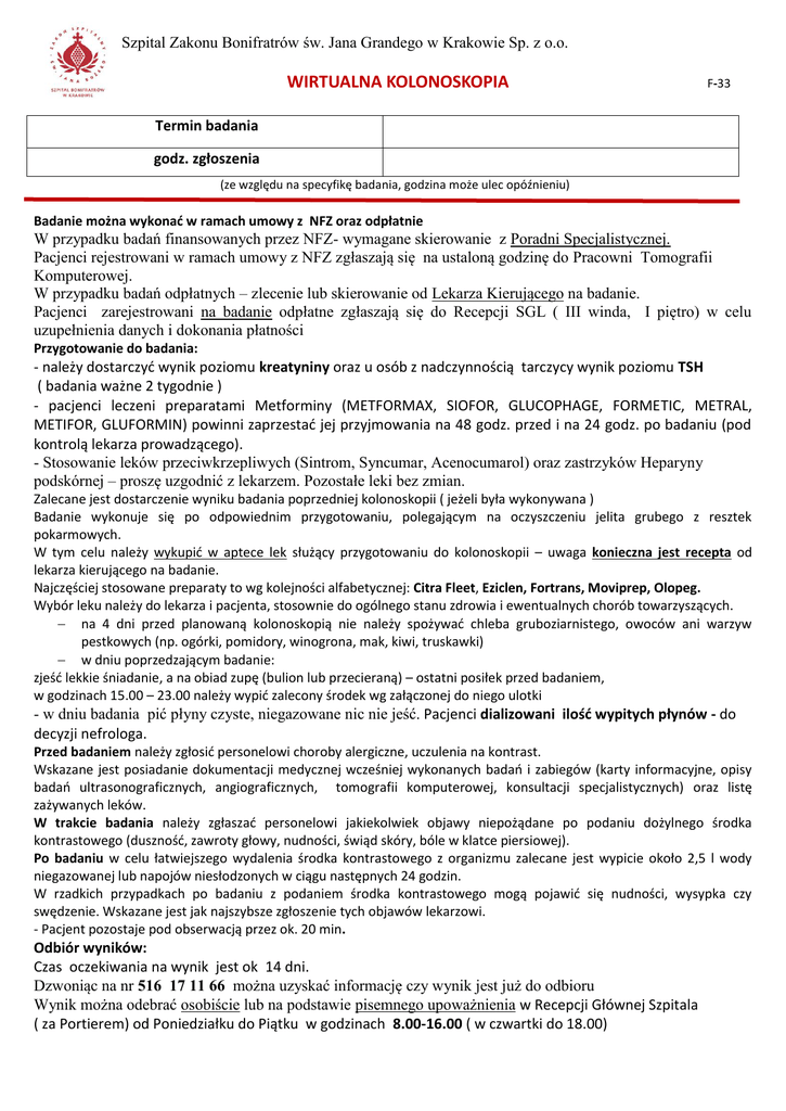 Szpital Zakonu Bonifratrów św. Jana Grandego w Krakowie Sp. z o.o. WIRTUALNA KOLONOSKOPIA F-33 Termin badania godz. zgłoszenia (ze względu na specyfikę badania, godzina może ulec opóźnieniu) Badanie można wykonać w ramach umowy z NFZ oraz odpłatnie W przypadku badań finansowanych przez NFZ- wymagane skierowanie z Poradni Specjalistycznej. Pacjenci rejestrowani w ramach umowy z NFZ zgłaszają się na ustaloną godzinę do Pracowni Tomografii Komputerowej. W przypadku badań odpłatnych – zlecenie lub skierowanie od Lekarza Kierującego na badanie. Pacjenci zarejestrowani na badanie odpłatne zgłaszają się do Recepcji SGL ( III winda, I piętro) w celu uzupełnienia danych i dokonania płatności Przygotowanie do badania: - należy dostarczyć wynik poziomu kreatyniny oraz u osób z nadczynnością tarczycy wynik poziomu TSH ( badania ważne 2 tygodnie ) - pacjenci leczeni preparatami Metforminy (METFORMAX, SIOFOR, GLUCOPHAGE, FORMETIC, METRAL, METIFOR, GLUFORMIN) powinni zaprzestać jej przyjmowania na 48 godz. przed i na 24 godz. po badaniu (pod kontrolą lekarza prowadzącego). - Stosowanie leków przeciwkrzepliwych (Sintrom, Syncumar, Acenocumarol) oraz zastrzyków Heparyny podskórnej – proszę uzgodnić z lekarzem. Pozostałe leki bez zmian. Zalecane jest dostarczenie wyniku badania poprzedniej kolonoskopii ( jeżeli była wykonywana ) Badanie wykonuje się po odpowiednim przygotowaniu, polegającym na oczyszczeniu jelita grubego z resztek pokarmowych. W tym celu należy wykupić w aptece lek służący przygotowaniu do kolonoskopii – uwaga konieczna jest recepta od lekarza kierującego na badanie. Najczęściej stosowane preparaty to wg kolejności alfabetycznej: Citra Fleet, Eziclen, Fortrans, Moviprep, Olopeg. Wybór leku należy do lekarza i pacjenta, stosownie do ogólnego stanu zdrowia i ewentualnych chorób towarzyszących. na 4 dni przed planowaną kolonoskopią nie należy spożywać chleba gruboziarnistego, owoców ani warzyw pestkowych (np. ogórki, pomidory, winogrona, mak, kiwi, truskawki) w dniu poprzedzającym badanie: zjeść lekkie śniadanie, a na obiad zupę (bulion lub przecieraną) – ostatni posiłek przed badaniem, w godzinach 15.00 – 23.00 należy wypić zalecony środek wg załączonej do niego ulotki - w dniu badania pić płyny czyste, niegazowane nic nie jeść. Pacjenci dializowani ilość wypitych płynów - do decyzji nefrologa. Przed badaniem należy zgłosić personelowi choroby alergiczne, uczulenia na kontrast. Wskazane jest posiadanie dokumentacji medycznej wcześniej wykonanych badań i zabiegów (karty informacyjne, opisy badań ultrasonograficznych, angiograficznych, tomografii komputerowej, konsultacji specjalistycznych) oraz listę zażywanych leków. W trakcie badania należy zgłaszać personelowi jakiekolwiek objawy niepożądane po podaniu dożylnego środka kontrastowego (duszność, zawroty głowy, nudności, świąd skóry, bóle w klatce piersiowej). Po badaniu w celu łatwiejszego wydalenia środka kontrastowego z organizmu zalecane jest wypicie około 2,5 l wody niegazowanej lub napojów niesłodzonych w ciągu następnych 24 godzin. W rzadkich przypadkach po badaniu z podaniem środka kontrastowego mogą pojawić się nudności, wysypka czy swędzenie. Wskazane jest jak najszybsze zgłoszenie tych objawów lekarzowi. - Pacjent pozostaje pod obserwacją przez ok. 20 min. Odbiór wyników: Czas oczekiwania na wynik jest ok 14 dni. Dzwoniąc na nr 516 17 11 66 można uzyskać informację czy wynik jest już do odbioru Wynik można odebrać osobiście lub na podstawie pisemnego upoważnienia w Recepcji Głównej Szpitala ( za Portierem) od Poniedziałku do Piątku w godzinach 8.00-16.00 ( w czwartki do 18.00) OŚWIADCZENIE O ZGODZIE NA UDZIELENIE ŚWIADCZENIA ZDROWOTNEGO 1. Otrzymałem/am niniejszą pisemną informację na temat sposobu wykonania oraz mogących wystąpić powikłań w związku z badaniem tomografii komputerowej, w tym podaniem środka kontrastowego: Optiray, Ultravist 2. Ogólne informację Stosowanie jodowych środków kontrastowych może wywołać działanie niepożądane, zwykle o charakterze przejściowym i stopniu ciężkości od łagodnego do umiarkowanego. Zanotowano również przypadki ciężkich i zagrażających życiu reakcji prowadzących do zgonu. Reakcje pojawiają się najczęściej w ciągu kilku minut od podania, ale mogą wystąpić znacznie później. a) Ból i obrzęk w miejscu podania, w większości przypadków są konsekwencją wynaczynienia środka kontrastowego. Reakcje te zwykle są przejściowe i nie powodują trwałego uszczerbku na zdrowiu. Niemniej bardzo rzadko po podaniu tej grupy środków kontrastowych notowano stan zapalny, a nawet martwicę skóry. b) Anafilaksja (ciężka reakcja alergiczna) przejawia się w różny sposób, bardzo rzadko u jednego pacjenta daje wszystkie możliwe objawy. Zwykle w ciągu 1 do 15 minut (rzadko dłużej niż po 2 godzinach). Może wystąpić złe samopoczucie, pobudzenie, uderzenie gorąca, uczucie ciepła, zwiększona potliwość, zawroty głowy, zwiększone łzawienie, zapalenie śluzówki nosa, kołatanie serca, parestezje (zmienione wrażenia czuciowe), świąd, uczucie pulsowania w głowie, ból gardła i uczucie ściskania w gardle, utrudnione połykanie, kaszel, kichanie, pokrzywka, rumień, łagodne miejscowe obrzęki, obrzęk naczynioruchowy, duszność spowodowaną obrzękiem języka i krtani i/lub jej skurczem. c) Nudności, wymioty, ból brzucha i biegunka d) Pierwotna zapaść krążeniowa, występować może jako jedyna i/lub początkowa reakcja bez dodatkowych objawów ze strony układu oddechowego lub bez innych objawów wymienionych uprzednio. e) Skurcz naczyń prowadzący do niedokrwienia. f) Ciężkie reakcje ze strony układu sercowo- naczyniowego, takie jak: rozszerzenie naczyń ze spadkiem ciśnienia tętniczego, przyspieszoną czynnością serca (częstoskurczem), dusznością, pobudzeniem, sinicą, utrat