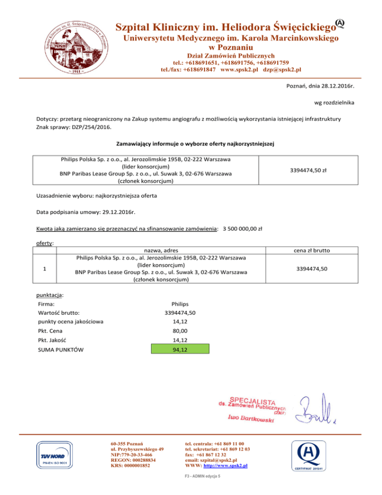 Szpital Kliniczny im. Heliodora Święcickiego Uniwersytetu Medycznego im. Karola Marcinkowskiego w Poznaniu Dział Zamówień Publicznych tel.: +618691651, +618691756, +618691759 tel./fax: +618691847 www.spsk2.pl [email protected] Poznań, dnia 28.12.2016r. wg rozdzielnika Dotyczy: przetarg nieograniczony na Zakup systemu angiografu z możliwością wykorzystania istniejącej infrastruktury Znak sprawy: DZP/254/2016. Zamawiający informuje o wyborze oferty najkorzystniejszej Philips Polska Sp. z o.o., al. Jerozolimskie 195B, 02-222 Warszawa (lider konsorcjum) BNP Paribas Lease Group Sp. z o.o., ul. Suwak 3, 02-676 Warszawa (członek konsorcjum) 3394474,50 zł Uzasadnienie wyboru: najkorzystniejsza oferta Data podpisania umowy: 29.12.2016r. Kwota jaką zamierzano się przeznaczyć na sfinansowanie zamówienia: 3 500 000,00 zł oferty: 1 nazwa, adres Philips Polska Sp. z o.o., al. Jerozolimskie 195B, 02-222 Warszawa (lider konsorcjum) BNP Paribas Lease Group Sp. z o.o., ul. Suwak 3, 02-676 Warszawa (członek konsorcjum) punktacja: Firma: Philips Wartość brutto: 3394474,50 punkty ocena jakościowa 14,12 Pkt. Cena 80,00 Pkt. Jakość 14,12 SUMA PUNKTÓW 94,12 60-355 Poznań ul. Przybyszewskiego 49 NIP:779-20-33-466 REGON: 000288834 KRS: 0000001852 tel. centrala: +61 869 11 00 tel. sekretariat: +61 869 12 03 fax: +61 867 12 32 email: [email protected] WWW: http://www.spsk2.pl F3 - ADMIN edycja 5 cena zł brutto 3394474,50