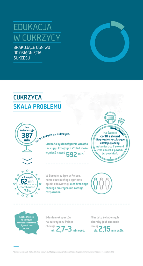 EDUKACJA W CUKRZYCY BRAKUJĄCE OGNIWO DO OSIĄGNIĘCIA SUKCESU CUKRZYCA SKALA PROBLEMU Na świecie żyje 387 mln ó os b ych n ch o r a c u k r z y c ę. Liczba ta systematycznie wzrasta i w ciągu kolejnych 20 lat może wynieść nawet mln. 592 w Europie mln chorobowość: 7,9% Liczba chorych na cukrzycę w Polsce i na świecie dynamicznie rośnie. Na świecie co 10 sekund diagnozuje się cukrzycę u kolejnej osoby, natomiast co 7 sekund ktoś umiera z powodu jej powikłań. W Europie, w tym w Polsce, mimo rozwiniętego systemu opieki zdrowotnej, u co trzeciego chorego cukrzyca nie zostaje rozpoznana. Zdaniem ekspertów na cukrzycę w Polsce choruje ok. mln osób. 2,7-3 Niestety świadomych choroby jest znacznie mniej ok. mln osób. 2,15 *Dorośli w wieku 20-79 lat. Według szacunków Międzynarodowej Federacji Diabetologicznej (International Diabetes Federation; IDF) EDUKACJA DIABETOLOGICZNA Nowoczesna terapia cukrzycy wykracza poza tradycyjne rozumienie leczenia chorób przewlekłych. Obejmuje wczesną profilaktykę, identyfikowanie i monitorowanie czynników ryzyka oraz edukację. Dokonujące się na przestrzeni ostatnich lat przekształcenie tradycyjnego, pasywnego „modelu choroby” w model „aktywnego uczestnictwa w terapii” (samokontroli i samoopieki) sprawiło, że edukacja stała się czynnikiem terapeutycznym równie ważnym jak farmakoterapia. Świadomy pacjent, który rozumie swoją rolę w procesie terapeutycznym, staje się aktywnym uczestnikiem walki z chorobą. DOSTĘP DO EDUKACJI DIABETOLOGICZNEJ W POLSCE JEST NIEWYSTARCZAJĄCY 51 % szkoleń dla pacjentów w około 50% przypadków pielęgniarka jest osobą, która zarówno podejmuje wstępną edukację pacjenta, jak również ją kontynuuje jest ograniczona do 15-minutowego spotkania Najczęściej są prowadzone w postaci spontanicznych, indywidualnych sesji edukacyjnych trwających nie więcej niż 1 godzinę. 91% ankietowanych stwierdziło, że edukacja pacjentów nie należy do podstawowych obowiązków pielęgniarki i stanowi jedynie zajęcie dodatkowe, wykonywane w wolnych chwilach, między szeregiem innych obowiązków tylko 9% pielęgniarek realizuje edukację w zakresie cukrzycy w ramach swoich podstawowych obowiązków 99% ankietowanych pielęgniarek deklaruje, że edukacja diabetologiczna ma realny wpływ na wyniki zdrowotne i jakość życia pacjentów z cukrzycą WEDŁUG PIELĘGNIAREK DOSTĘP DO SPECJALISTÓW W ICH MIEJSCACH PRACY JEST NIEWYSTARCZAJĄCY: brak stałego dostępu do specjalistów 48% brak opieki rehabilitanta 56% brak opieki psychologa 49% brak opieki dietetyka 70% brak opieki edukatora ds. diabetologii 99% ankietowanych twierdzi, że stanowisko edukatora ds. diabetologii jest ważne w systemie opieki zdrowotnej pacjenta z cukrzycą *Organizacja opieki i edukacji diabetologicznej nad pacjentem z cukrzycą w lecznictwie ambulatoryjnym i stacjonarnym. Badanie przeprowadzone z inicjatywy Polskiej Federacji Edukacji w Diabetologii przez pracownię badawczą BSM na grupie 1390 przedstawicieli środowiska pielęgniarskiego.