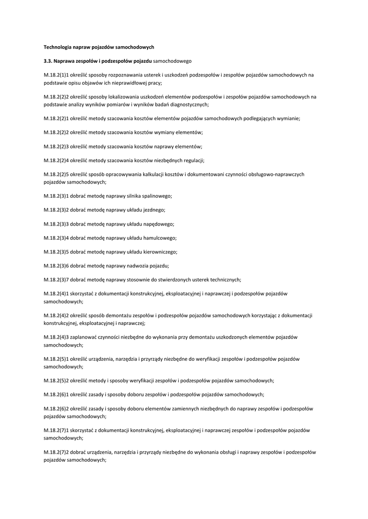 Technologia napraw pojazdów samochodowych 3.3. Naprawa zespołów i podzespołów pojazdu samochodowego M.18.2(1)1 określić sposoby rozpoznawania usterek i uszkodzeń podzespołów i zespołów pojazdów samochodowych na podstawie opisu objawów ich nieprawidłowej pracy; M.18.2(2)2 określić sposoby lokalizowania uszkodzeń elementów podzespołów i zespołów pojazdów samochodowych na podstawie analizy wyników pomiarów i wyników badań diagnostycznych; M.18.2(2)1 określić metody szacowania kosztów elementów pojazdów samochodowych podlegających wymianie; M.18.2(2)2 określić metody szacowania kosztów wymiany elementów; M.18.2(2)3 określić metody szacowania kosztów naprawy elementów; M.18.2(2)4 określić metody szacowania kosztów niezbędnych regulacji; M.18.2(2)5 określić sposób opracowywania kalkulacji kosztów i dokumentowani czynności obsługowo-naprawczych pojazdów samochodowych; M.18.2(3)1 dobrać metodę naprawy silnika spalinowego; M.18.2(3)2 dobrać metodę naprawy układu jezdnego; M.18.2(3)3 dobrać metodę naprawy układu napędowego; M.18.2(3)4 dobrać metodę naprawy układu hamulcowego; M.18.2(3)5 dobrać metodę naprawy układu kierowniczego; M.18.2(3)6 dobrać metodę naprawy nadwozia pojazdu; M.18.2(3)7 dobrać metodę naprawy stosownie do stwierdzonych usterek technicznych; M.18.2(4)1 skorzystać z dokumentacji konstrukcyjnej, eksploatacyjnej i naprawczej i podzespołów pojazdów samochodowych; M.18.2(4)2 określić sposób demontażu zespołów i podzespołów pojazdów samochodowych korzystając z dokumentacji konstrukcyjnej, eksploatacyjnej i naprawczej; M.18.2(4)3 zaplanować czynności niezbędne do wykonania przy demontażu uszkodzonych elementów pojazdów samochodowych; M.18.2(5)1 określić urządzenia, narzędzia i przyrządy niezbędne do weryfikacji zespołów i podzespołów pojazdów samochodowych; M.18.2(5)2 określić metody i sposoby weryfikacji zespołów i podzespołów pojazdów samochodowych; M.18.2(6)1 określić zasady i sposoby doboru zespołów i podzespołów pojazdów samochodowych; M.18.2(6)2 określić zasady i sposoby doboru elementów zamiennych niezbędnych do naprawy zespołów i podzespołów pojazdów samochodowych; M.18.2(7)1 skorzystać z dokumentacji konstrukcyjnej, eksploatacyjnej i naprawczej zespołów i podzespołów pojazdów samochodowych; M.18.2(7)2 dobrać urządzenia, narzędzia i przyrządy niezbędne do wykonania obsługi i naprawy zespołów i podzespołów pojazdów samochodowych; M.18.2(7)3 zaplanować czynności niezbędne do wykonania wymiany uszkodzonych zespołów i podzespołów pojazdów samochodowych; M.18.2(8)1 zidentyfikować sposób połączenia elementów; M.18.2(8)2 określić urządzenia, narzędzia i przyrządy niezbędne do wykonania obsługi i naprawy zespołów i podzespołów pojazdów samochodowych; M.18.2(8)3 zaplanować czynności niezbędne do wykonania montażu wymienianych lub naprawionych elementów; M.18.2(8)4 zaplanować czynności niezbędne do zamontowania naprawionych lub wymienianych zespołów i podzespołów do pojazdu; M.18.2(9)1 zaplanować czynności niezbędne do wykonania konserwacji zespołów i podzespołów pojazdów samochodowych M.18.2(9)2 określić urządzenia, narzędzia i przyrządy niezbędne do konserwacji zespołów i podzespołów pojazdów samochodowych; M.18.2(10)1 scharakteryzować materiały eksploatacyjne do zespołów i podzespołów pojazdów samochodowych; M.18.2(10)2 wyjaśnić zasady eksploatacji układów pojazdów samochodowych; M.18.2(10)3 określić sposoby doboru materiałów eksploatacyjnych do układów pojazdów samochodowych; M.18.2(11)1 dobrać metody przeprowadzania próby pojazdu samochodowego po naprawie w zależności od zakresu naprawy; M.18.2(11)2 dobrać metodę badania pojazdu samochodowego po naprawie; M.18.2(11)3 określić urządzenia, narzędzia i przyrządy niezbędne do diagnostyki zespołów i podzespołów pojazdów samochodowych po wykonanej naprawie; M.18.2(11)4 zaplanować czynności niezbędne do przeprowadzenia próby pracy układów pojazdów samochodowych po naprawie; M.18.2(12)1 określić sposób interpretowania wyników badań uzyskane podczas próbę pracy po naprawie; M.18.2(12)2 zaplanować czynności niezbędne do dokonania oceny jakości wykonanej naprawy na podstawie uzyskanych wyników badań podczas próby pracy; M.18.2(12)3 określić sposoby ustalenia kosztów naprawy z uwzględnieniem kosztów części, materiałów eksploatacyjnych i kosztu robocizny