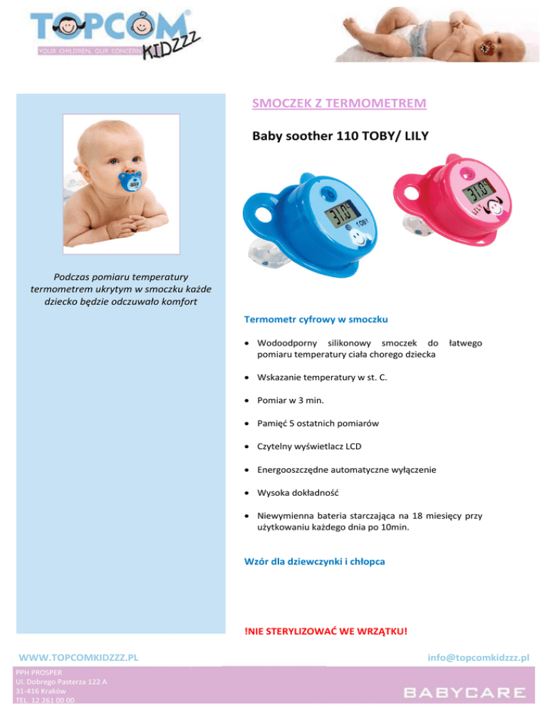 SMOCZEK Z TERMOMETREM Baby soother 110 TOBY/ LILY Podczas pomiaru temperatury termometrem ukrytym w smoczku każde dziecko będzie odczuwało komfort Termometr cyfrowy w smoczku Wodoodporny silikonowy smoczek do pomiaru temperatury ciała chorego dziecka łatwego Wskazanie temperatury w st. C. Pomiar w 3 min. Pamięd 5 ostatnich pomiarów Czytelny wyświetlacz LCD Energooszczędne automatyczne wyłączenie Wysoka dokładnośd Niewymienna bateria starczająca na 18 miesięcy przy użytkowaniu każdego dnia po 10min. Wzór dla dziewczynki i chłopca !NIE STERYLIZOWAĆ WE WRZĄTKU! WWW.TOPCOMKIDZZZ.PL PPH PROSPER Ul. Dobrego Pasterza 122 A 31-416 Kraków TEL. 12 261 00 00 [email protected]