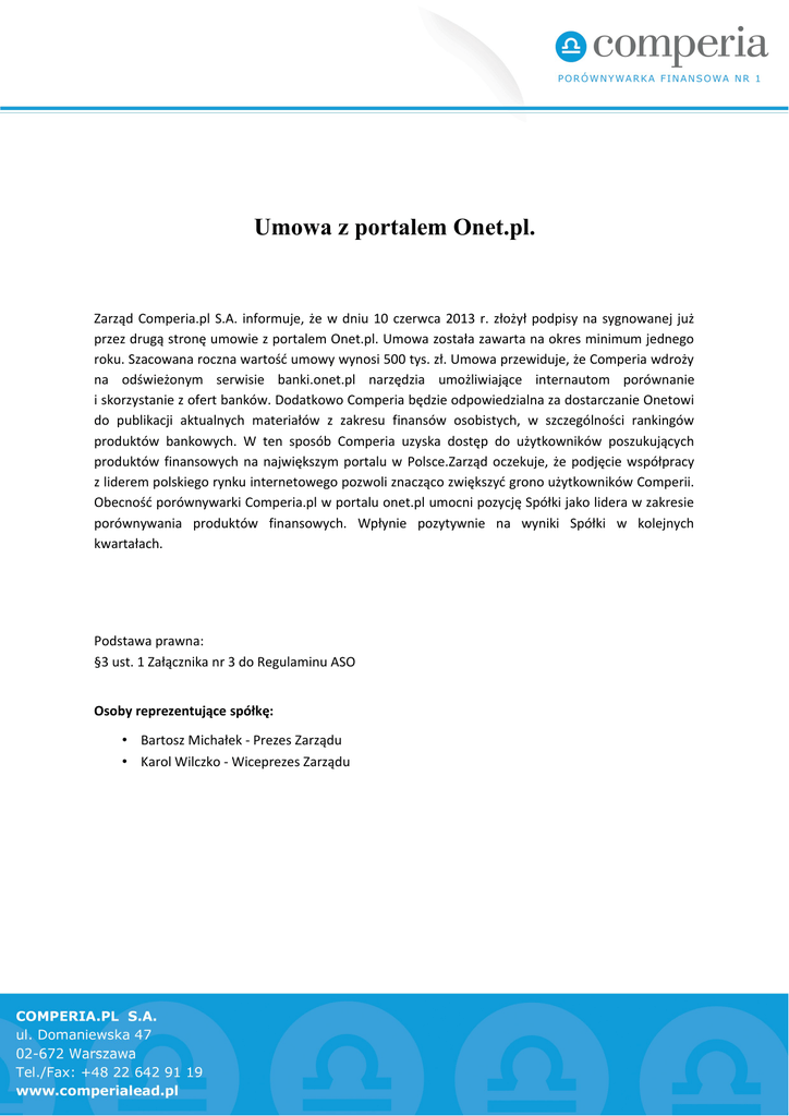 Umowa z portalem Onet.pl. Zarząd Comperia.pl S.A. informuje, że w dniu 10 czerwca 2013 r. złożył podpisy na sygnowanej już przez drugą stronę umowie z portalem Onet.pl. Umowa została zawarta na okres minimum jednego roku. Szacowana roczna wartość umowy wynosi 500 tys. zł. Umowa przewiduje, że Comperia wdroży na odświeżonym serwisie banki.onet.pl narzędzia umożliwiające internautom porównanie i skorzystanie z ofert banków. Dodatkowo Comperia będzie odpowiedzialna za dostarczanie Onetowi do publikacji aktualnych materiałów z zakresu finansów osobistych, w szczególności rankingów produktów bankowych. W ten sposób Comperia uzyska dostęp do użytkowników poszukujących produktów finansowych na największym portalu w Polsce.Zarząd oczekuje, że podjęcie współpracy z liderem polskiego rynku internetowego pozwoli znacząco zwiększyć grono użytkowników Comperii. Obecność porównywarki Comperia.pl w portalu onet.pl umocni pozycję Spółki jako lidera w zakresie porównywania produktów finansowych. Wpłynie pozytywnie na wyniki Spółki w kolejnych kwartałach. Podstawa prawna: §3 ust. 1 Załącznika nr 3 do Regulaminu ASO Osoby reprezentujące spółkę: • Bartosz Michałek - Prezes Zarządu • Karol Wilczko - Wiceprezes Zarządu