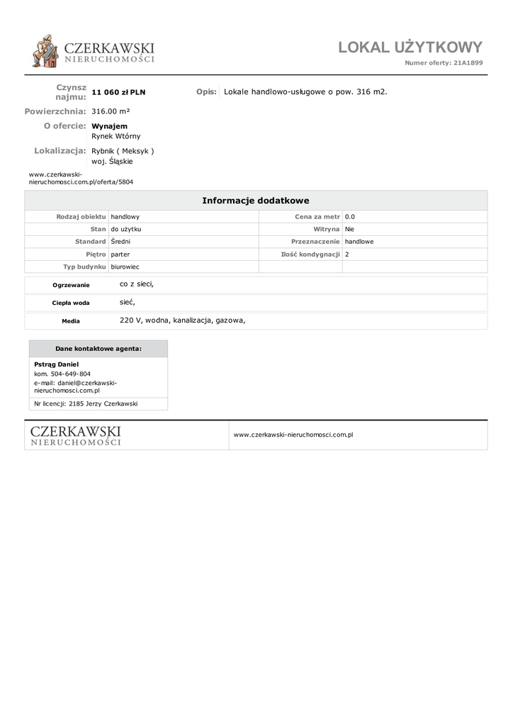 LOKAL UŻYTKOWY Numer oferty: 21A1899 Czynsz 11 060 zł PLN najmu: Opis: Lokale handlowo-usługowe o pow. 316 m2. Powierzchnia: 316.00 m² O ofercie: Wynajem Rynek Wtórny Lokalizacja: Rybnik ( Meksyk ) woj. Śląskie www.czerkawskinieruchomosci.com.pl/oferta/5804 Informacje dodatkowe Rodzaj obiektu handlowy Cena za metr 0.0 Stan do użytku Witryna Nie Standard Średni Przeznaczenie handlowe Piętro parter Ilość kondygnacji 2 Typ budynku biurowiec Ogrzewanie co z sieci, Ciepła woda sieć, Media 220 V, wodna, kanalizacja, gazowa, Dane kontaktowe agenta: Pstrąg Daniel kom. 504-649-804 e-mail: [email protected] Nr licencji: 2185 Jerzy Czerkawski www.czerkawski-nieruchomosci.com.pl