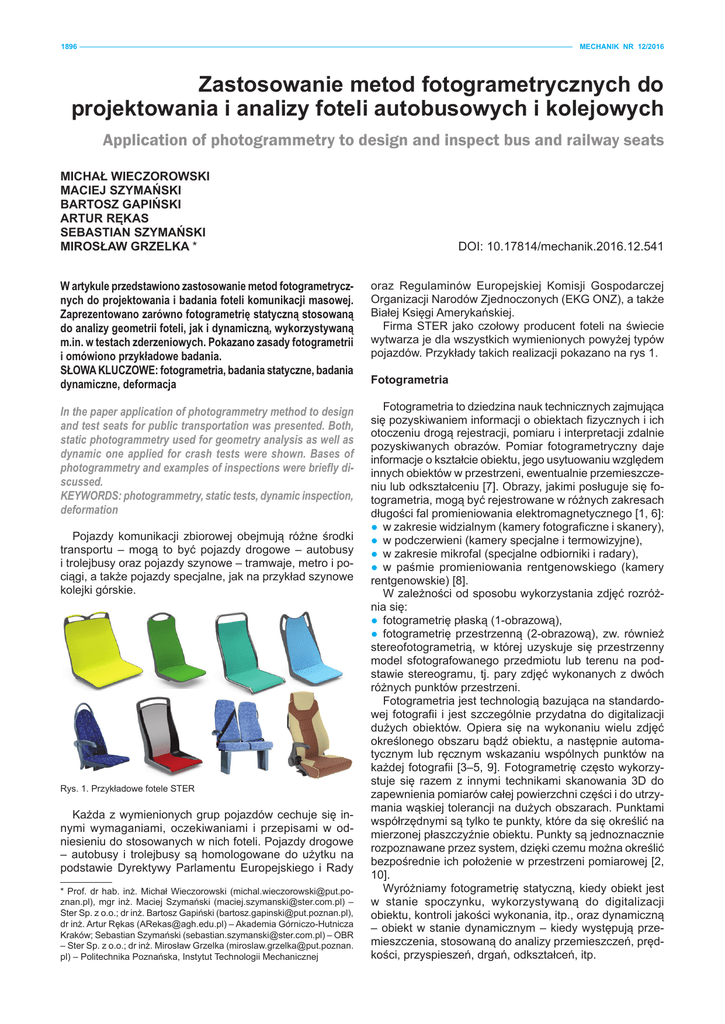 1896 MECHANIK NR 12/2016 Zastosowanie metod fotogrametrycznych do projektowania i analizy foteli autobusowych i kolejowych Application of photogrammetry to design and inspect bus and railway seats MICHAŁ WIECZOROWSKI MACIEJ SZYMAŃSKI BARTOSZ GAPIŃSKI ARTUR RĘKAS SEBASTIAN SZYMAŃSKI MIROSŁAW GRZELKA * DOI: 10.17814/mechanik.2016.12.541 W artykule przedstawiono zastosowanie metod fotogrametrycznych do projektowania i badania foteli komunikacji masowej. Zaprezentowano zarówno fotogrametrię statyczną stosowaną do analizy geometrii foteli, jak i dynamiczną, wykorzystywaną m.in. w testach zderzeniowych. Pokazano zasady fotogrametrii i omówiono przykładowe badania. SŁOWA KLUCZOWE: fotogrametria, badania statyczne, badania dynamiczne, deformacja oraz Regulaminów Europejskiej Komisji Gospodarczej Organizacji Narodów Zjednoczonych (EKG ONZ), a także Białej Księgi Amerykańskiej. Firma STER jako czołowy producent foteli na świecie wytwarza je dla wszystkich wymienionych powyżej typów pojazdów. Przykłady takich realizacji pokazano na rys 1. In the paper application of photogrammetry method to design and test seats for public transportation was presented. Both, static photogrammetry used for geometry analysis as well as dynamic one applied for crash tests were shown. Bases of photogrammetry and examples of inspections were briefly discussed. KEYWORDS: photogrammetry, static tests, dynamic inspection, deformation Fotogrametria to dziedzina nauk technicznych zajmująca się pozyskiwaniem informacji o obiektach fizycznych i ich otoczeniu drogą rejestracji, pomiaru i interpretacji zdalnie pozyskiwanych obrazów. Pomiar fotogrametryczny daje informacje o kształcie obiektu, jego usytuowaniu względem innych obiektów w przestrzeni, ewentualnie przemieszczeniu lub odkształceniu [7]. Obrazy, jakimi posługuje się fotogrametria, mogą być rejestrowane w różnych zakresach długości fal promieniowania elektromagnetycznego [1, 6]: ●● w zakresie widzialnym (kamery fotograficzne i skanery), ●● w podczerwieni (kamery specjalne i termowizyjne), ●● w zakresie mikrofal (specjalne odbiorniki i radary), ●● w paśmie promieniowania rentgenowskiego (kamery rentgenowskie) [8]. W zależności od sposobu wykorzystania zdjęć rozróżnia się: ●● fotogrametrię płaską (1-obrazową), ●● fotogrametrię przestrzenną (2-obrazową), zw. również stereofotogrametrią, w której uzyskuje się przestrzenny model sfotografowanego przedmiotu lub terenu na podstawie stereogramu, tj. pary zdjęć wykonanych z dwóch różnych punktów przestrzeni. Fotogrametria jest technologią bazująca na standardowej fotografii i jest szczególnie przydatna do digitalizacji dużych obiektów. Opiera się na wykonaniu wielu zdjęć określonego obszaru bądź obiektu, a następnie automatycznym lub ręcznym wskazaniu wspólnych punktów na każdej fotografii [3–5, 9]. Fotogrametrię często wykorzystuje się razem z innymi technikami skanowania 3D do zapewnienia pomiarów całej powierzchni części i do utrzymania wąskiej tolerancji na dużych obszarach. Punktami współrzędnymi są tylko te punkty, które da się określić na mierzonej płaszczyźnie obiektu. Punkty są jednoznacznie rozpoznawane przez system, dzięki czemu można określić bezpośrednie ich położenie w przestrzeni pomiarowej [2, 10]. Wyróżniamy fotogrametrię statyczną, kiedy obiekt jest w stanie spoczynku, wykorzystywaną do digitalizacji obiektu, kontroli jakości wykonania, itp., oraz dynamiczną – obiekt w stanie dynamicznym – kiedy występują przemieszczenia, stosowaną do analizy przemieszczeń, prędkości, przyspieszeń, drgań, odkształceń, itp. Pojazdy komunikacji zbiorowej obejmują różne środki transportu – mogą to być pojazdy drogowe – autobusy i trolejbusy oraz pojazdy szynowe – tramwaje, metro i pociągi, a także pojazdy specjalne, jak na przykład szynowe kolejki górskie. Rys. 1. Przykładowe fotele STER Każda z wymienionych grup pojazdów cechuje się innymi wymaganiami, oczekiwaniami i przepisami w odniesieniu do stosowanych w nich foteli. Pojazdy drogowe – autobusy i trolejbusy są homologowane do użytku na podstawie Dyrektywy Parlamentu Europejskiego i Rady * Prof. dr hab. inż. Michał Wieczorowski ([email protected]), mgr inż. Maciej Szymański ([email protected]) – Ster Sp. z o.o.; dr inż. Bartosz Gapiński ([email protected]), dr inż. Artur Rękas ([email protected]) – Akademia Górniczo-Hutnicza Kraków; Sebastian Szymański ([email protected]) – OBR – Ster Sp. z o.o.; dr inż. Mirosław Grzelka ([email protected]. pl) – Politechnika Poznańska, Instytut Technologii Mechanicznej Fotogrametria MECHANIK NR 12/2016 + 1897 MECHANIK NR .../20... Procedura badawcza Wyróżniamy fotogrametrię statyczną kiedy obiekt jest w stanie spoczynku, wykorzystywaną do digitalizacji obiektu, Z punktu widzenia producenta jakim jest STER, kontroli jakości wykonania, itp., orazfoteli, dynamiczną – obiekt w stanie kiedy występują przemieszczenia, wysocedynamicznym pożądane jest– zastosowanie urządzenia pomiarostosowaną do analizy na przemieszczeń, prędkości, przyspiewego pozwalającego rejestrację danych wymaganych szeń, odkształceń, itp. ale również jednocześnie przezdrgań, uregulowania prawne, pozwalającego na pełną analizę zmian geometrii fotela Procedura badawczaw trakcie prowadzonego testu. Rówi jego wyposażenia nie ważna jest rzeczywista geometria fotela przed przeZ punktu widzenia foteli, jakim jest STER, prowadzeniem testu i producenta potwierdzenie jego zgodności wywysoce pożądane jest zastosowanie urządzenia pomiaromiarowej z dokumentacją, jak i ocena geometrii całości wego pozwalającego na rejestrację danych wymaganych fotela po przeprowadzonym teście. Do przeprowadzenia przez uregulowania prawne, ale również jednocześnie pobadań nad zastosowaniem metod do zwalającego na pełną analizę zmianfotogrametrycznych g