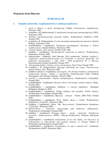 Wojciech Józef Burszta PUBLIKACJE I. Książki (autorskie, współautorstwo i redakcja naukowa) 1. Język a kultura w myśli etnologicznej, Polskie Towarzystwo Ludoznawcze, Wrocław 1986. 2. [wspólnie z M. Buchowskim], O założeniach interpretacji antropologicznej, PWN, Warszawa 1992. 3. Wymiary antropologicznego poznania kultury, Wydawnictwo Naukowe UAM, Poznań 1992. 4. [wspólnie z K. Piątkowskim], O czym opowiada antropologiczna opowieść, Instytut Kultury, Warszawa 1994. 5. [współredaktor i współautor], Pożegnania paradygmatu? Etnologia w obliczu współczesności, Instytut Kultury, Warszawa 1994. 6. Czytanie kultury. Pięć szkiców, IEiAK, Łódź 1996. 7. [redaktor i współautor], Antropologiczne wędrówki po kulturze, Wydawnictwo Humaniora, Poznań 1996. 8. [opracowanie i redakcja], Józef Burszta, Wieś małopolska. Studium struktury i organizacji społeczno-przestrzennej wsi Grodzisko w powiecie łańcuckim. Na podstawie maszynopisów z roku 1938 i 1948 przygotował W. J. Burszta, Stowarzyszenie Ziemia Grodziska, Poznań 1997. 9. Antropologia kultury. Tematy, teorie, interpretacje, Zysk i S-ka, Poznań 1998. 10. [wspólnie z W. Kuligowskim], Dlaczego kościotrup nie wstaje. Ponowoczesne pejzaże kultury, Sic!, Warszawa 1999. 11. [redaktor naukowy i współautor], Euroregion „Pro Europa Viadrina” pomostem do zjednoczonej Europy. Analizy i rozpoznania, Stowarzyszenie Gmin Polskich Euroregionu „Pro Europa Viadrina”, Gorzów 2000. 12. Asteriks w Disneylandzie. Zapiski antropologiczne, Wydawnictwo Poznańskie, Poznań 2001. 13. [współredaktor i współautor], Ojczyzny słowa. Narracyjne wymiary kultury, Telgte, Poznań 2002. 14. [współredaktor i współautor], Edukacja w czasach popkultury, Akademia Bydgoska, Bydgoszcz 2002. 15. [współredaktor i współautor], Polska refleksja nad narodem. Wybór tekstów, Wydawnictwo Poznańskie, Poznań 2002. 16. [współredaktor i współautor], Migracja – Europa – Polska, ZBN PAN, Poznań 2003. 17. [współredaktor i współautor], Rock. Między duszą a ciałem, Wydawnictwo Książkowe „Twój Styl”, Warszawa 2003. 18. [redaktor i współautor], Ekran. Mit. Rzeczywistość, Wydawnictwo Książkowe „Twój Styl“, Warszawa 2003. 19. Różnorodność i tożsamość. Antropologia jako kulturowa refleksyjność, Wydawnictwo Poznańskie, Poznań 2004. 20. [redaktor i współautor], Strategie śmierci – formy umierania.. Świadectwa literackie i kulturoznawcze, SWPS, Oficyna Wydawnicza Volumen, Warszawa 2004. 21. [współredaktor i współautor] Nationalisms Across the Globe. An Overwiew of Nationalisms in state-edowed and stateless nations, t.1 Europe, School of Humanities and Journalism, Poznań 2005. 22. [współredaktor i współautor], Kontrkultura. Co nam z tamtych lat?, Academica Wydawnictwo SWPS, Warszawa 2005. 23. [z W. Kuligowskim] Sequel. Dalsze przygody kultury w globalnym świecie, MUZA, Warszawa 20005. 24. [współredaktor i współautor] Naród – tożsamość – kultura. Między koniecznością a wyborem, SOW, Warszawa 2005. 25. [współredaktor i współautor] Nationalisms Across the Globe. An Overview of Nationalisms In the State-Endowed and Stateless Nations, t.2 The World, School of Humanities and Journalism, Poznań 2006. 26. [z M. Czubajem] Krwawa setka. Sto najważniejszych powieści kryminalnych, Muza, Warszawa 2007. 27. [współredaktor i współautor] Kiczosfery współczesności, Academica, Warszawa 2008. 28. Świat jako więzienie kultury. Pomyślenia, Państwowy Instytut Wydawniczy, Warszawa 2008. 29. Od mowy magicznej do szumów popkultury, Academica, Warszawa 2009. 30. [współredaktor i współautor] Europa – Slavia – Germania. W poszukiwaniu tożsamości, Instytut Slawistyki PAN, Państwowa Wyższa Szkoła Zawodowa w Gorzowie, Warszawa-Gorzów Wielkopolski 2009. 31. [współredaktor i współautor] Kulturo-znawstwo: dyscyplina bez dyscypliny?, Academica, Warszawa 2010. 32. [współredaktor i współautor] Kultura miejska w Polsce z perspektywy interdyscyplinarnych badań jakościowych, Narodowe Centrum Kultury, Warszawa 2010. 33. [współredaktor] Tożsamość i samotność. Komentarze młodego pokolenia, Academica, Warszawa 2011. 34. (współredaktor i współautor) Stan i zróżnicowanie kultury wsi i małych miast w Polsce. Kanon i rozproszenie, Narodowe Centrum Kultury, Warszawa 2011. 35. (współredaktor i współautor) Stadion – Miasto – Kultura. EURO 2012 i przemiany kultury polskiej, Narodowe Centrum Kultury, Warszawa 2012. 36. (współredaktor i współautor) Polskie widzenie Europy. Historia i współczesność, Slawistyczny Ośrodek Wydawniczy, Warszawa (w druku). 37. (redakcja i współautorstwo) Ścięgna konsumpcyjne. Próby z kulturoznawstwa krytycznego (w przygotowaniu dla wydawnictwa „Katedra”). 38. Wojny kultur z popnacjonalizmem w tle (w druku w wydawnictwie „Iskry”). 39. Preteksty. Drugie czytanie kultury (w przygotowaniu). II. Artykuły 1. Implikacje metodologiczne krytyki koncepcji Claude Lévi-Straussa dla badań etnograficznych, Lud t.64:1980, s. 105-129. 2. [z M. Buchowskim], Teoretyczny aspekt etnograficznych badań nad kulturą, Lud t.66:1982, s. 31-44. 3. W świecie ideacyjnych kodów – propozycje Warda Goodenougha, Lud, t.66:1982, s. 46-60. 4. Z problemów językowego uwarunkowania kultury, Lud t.67:1983, s. 57-72. 5. Lingwistyka a etnologia, Przegląd Literatury Metodologicznej 1:1984, s. 53-62. 6. [z M. Buchowskim], Kultura symboliczna w badaniach etnologicznych, Etnografia Polska t.29, z.1:1985, s. 33-40. 7. Lingwistyka a etnologia, [w:] O kulturze i jej badaniu, K. Zamiara [red.], PWN, Warszawa 1985, s. 88-101. 8. „Piśmienność” jako czynnik rozwojowy systemów wiedzy kulturowej, Lud t.70:1986, s. 85-98. 9. [z M. Buchowskim], Status języka w świadomości magicznej, Etnografia Polska t.30, z.1:1986, s. 31-42. 10. Język a kultura w empiryzmie etnograficznym Bronisława Malinowskiego, Literatura Ludowa 2:1986, s. 3-14. 2 1