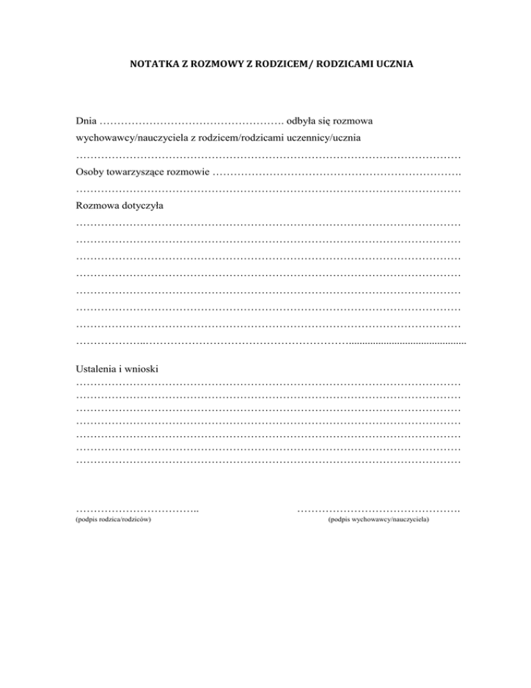 NOTATKA Z ROZMOWY Z RODZICEM/ RODZICAMI UCZNIA Dnia ……………………………………………. odbyła się rozmowa wychowawcy/nauczyciela z rodzicem/rodzicami uczennicy/ucznia ……………………………………………………………………………………………… Osoby towarzyszące rozmowie ……………………………………………………………. ……………………………………………………………………………………………… Rozmowa dotyczyła ……………………………………………………………………………………………… ……………………………………………………………………………………………… ……………………………………………………………………………………………… ……………………………………………………………………………………………… ……………………………………………………………………………………………… ……………………………………………………………………………………………… ……………………………………………………………………………………………… ………………..…………………………………………………............................................ Ustalenia i wnioski ……………………………………………………………………………………………… ……………………………………………………………………………………………… ……………………………………………………………………………………………… ……………………………………………………………………………………………… ……………………………………………………………………………………………… ……………………………………………………………………………………………… ……………………………………………………………………………………………… …………………………….. (podpis rodzica/rodziców) ………………………………………. (podpis wychowawcy/nauczyciela)
