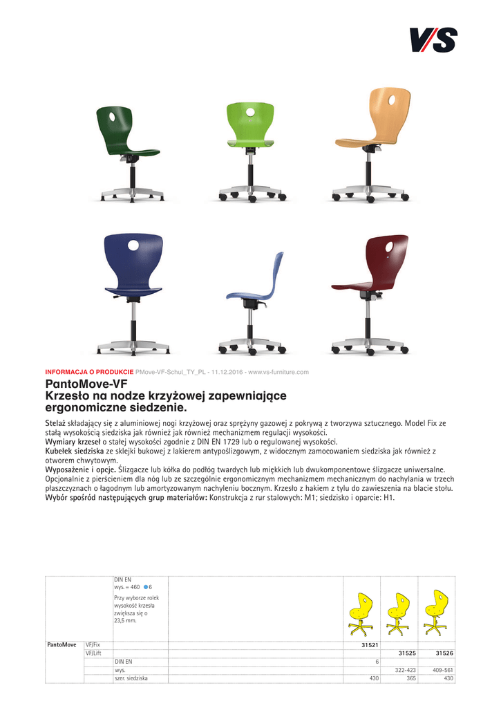 INFORMACJA O PRODUKCIE PMove-VF-Schul_TY_PL - 11.12.2016 - www.vs-furniture.com PantoMove-VF Krzesło na nodze krzyżowej zapewniające ergonomiczne siedzenie. Stelaż składający się z aluminiowej nogi krzyżowej oraz sprężyny gazowej z pokrywą z tworzywa sztucznego. Model Fix ze stałą wysokością siedziska jak również jak również mechanizmem regulacji wysokości. Wymiary krzeseł o stałej wysokości zgodnie z DIN EN 1729 lub o regulowanej wysokości. Kubełek siedziska ze sklejki bukowej z lakierem antypoślizgowym, z widocznym zamocowaniem siedziska jak również z otworem chwytowym. Wyposażenie i opcje. Ślizgacze lub kółka do podłóg twardych lub miękkich lub dwukomponentowe ślizgacze uniwersalne. Opcjonalnie z pierścieniem dla nóg lub ze szczególnie ergonomicznym mechanizmem mechanicznym do nachylania w trzech płaszczyznach o łagodnym lub amortyzowanym nachyleniu bocznym. Krzesło z hakiem z tylu do zawieszenia na blacie stołu. Wybór spośród następujących grup materiałów: Konstrukcja z rur stalowych: M1; siedzisko i oparcie: H1. DIN EN wys. = 460 6 Przy wyborze rolek wysokość krzesła zwiększa się o 23,5 mm. PantoMove VF/Fix VF/Lift 31521 DIN EN wys. szer. siedziska 31525 31526 322-423 365 409-561 430 6 430