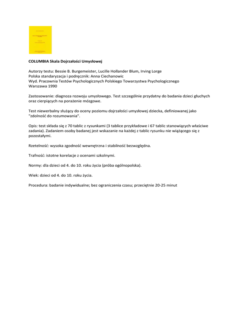COLUMBIA Skala Dojrzałości Umysłowej Autorzy testu: Bessie B. Burgemeister, Lucille Hollander Blum, Irving Lorge Polska standaryzacja i podręcznik: Anna Ciechanowic Wyd. Pracownia Testów Psychologicznych Polskiego Towarzystwa Psychologicznego Warszawa 1990 Zastosowanie: diagnoza rozwoju umysłowego. Test szczególnie przydatny do badania dzieci głuchych oraz cierpiących na porażenie mózgowe. Test niewerbalny służący do oceny poziomu dojrzałości umysłowej dziecka, definiowanej jako "zdolność do rozumowania". Opis: test składa się z 70 tablic z rysunkami (3 tablice przykładowe i 67 tablic stanowiących właściwe zadania). Zadaniem osoby badanej jest wskazanie na każdej z tablic rysunku nie wiążącego się z pozostałymi. Rzetelność: wysoka zgodność wewnętrzna i stabilność bezwzględna. Trafność: istotne korelacje z ocenami szkolnymi. Normy: dla dzieci od 4. do 10. roku życia (próba ogólnopolska). Wiek: dzieci od 4. do 10. roku życia. Procedura: badanie indywidualne; bez ograniczenia czasu; przeciętnie 20-25 minut