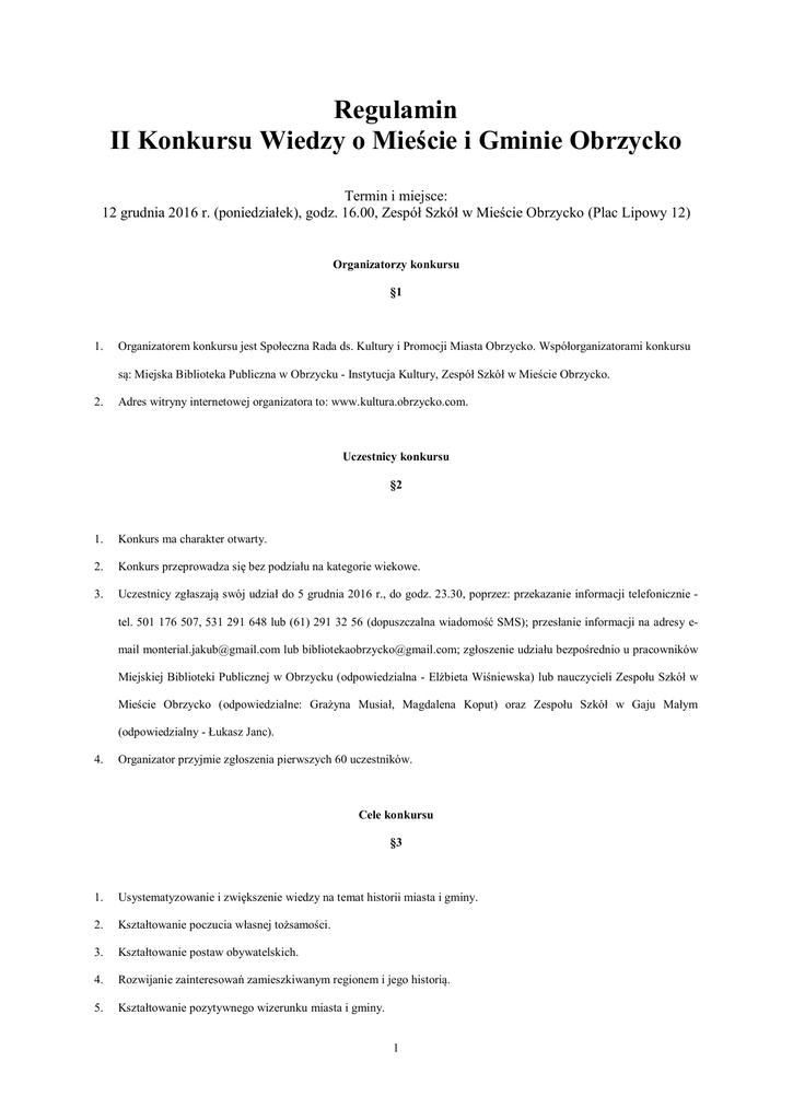 Regulamin II Konkursu Wiedzy o Mieście i Gminie Obrzycko Termin i miejsce: 12 grudnia 2016 r. (poniedziałek), godz. 16.00, Zespół Szkół w Mieście Obrzycko (Plac Lipowy 12) Organizatorzy konkursu §1 1. Organizatorem konkursu jest Społeczna Rada ds. Kultury i Promocji Miasta Obrzycko. Współorganizatorami konkursu są: Miejska Biblioteka Publiczna w Obrzycku - Instytucja Kultury, Zespół Szkół w Mieście Obrzycko. 2. Adres witryny internetowej organizatora to: www.kultura.obrzycko.com. Uczestnicy konkursu §2 1. Konkurs ma charakter otwarty. 2. Konkurs przeprowadza się bez podziału na kategorie wiekowe. 3. Uczestnicy zgłaszają swój udział do 5 grudnia 2016 r., do godz. 23.30, poprzez: przekazanie informacji telefonicznie tel. 501 176 507, 531 291 648 lub (61) 291 32 56 (dopuszczalna wiadomość SMS); przesłanie informacji na adresy email [email protected] lub [email protected]; zgłoszenie udziału bezpośrednio u pracowników Miejskiej Biblioteki Publicznej w Obrzycku (odpowiedzialna - Elżbieta Wiśniewska) lub nauczycieli Zespołu Szkół w Mieście Obrzycko (odpowiedzialne: Grażyna Musiał, Magdalena Koput) oraz Zespołu Szkół w Gaju Małym (odpowiedzialny - Łukasz Janc). 4. Organizator przyjmie zgłoszenia pierwszych 60 uczestników. Cele konkursu §3 1. Usystematyzowanie i zwiększenie wiedzy na temat historii miasta i gminy. 2. Kształtowanie poczucia własnej tożsamości. 3. Kształtowanie postaw obywatelskich. 4. Rozwijanie zainteresowań zamieszkiwanym regionem i jego historią. 5. Kształtowanie pozytywnego wizerunku miasta i gminy. 1 6. Rozwijanie zdolności i zainteresowań mieszkańców. Zakres tematyczny §4 1. Celem przygotowania się do konkursu zalecane jest zapoznanie się z niżej wymienioną literaturą. Literatura zalecana dla wszystkich uczestników: „Almanach Obrzycki”, wyd. 1988 r., „Almanach Szamotulski”, wyd. 1961 r., „Gmina i Miasto Obrzycko”, wyd. 1999 r., „Kapliczki i figury przydrożne powiatu szamotulskiego”, wyd. 2002 r., „Vademecum Krajoznawcze Ziemi Szamotulskiej”, 2002 r., „Puszcza Notecka. Przewodnik krajoznawczy”, wyd. 2005 r., „Ziemia Szamotulska. Przewodnik wycieczkowy”, wyd. 1965 r., „Ziemia Szamotulska. Przewodnik”, wyd. 1972 r. Dodatkowo: wiadomości o teraźniejszości Obrzycka, zdobyte dzięki własnej inwencji uczestników, współczesna prasa lokalna - wycinki prasowe dostępne w siedzibie biblioteki w Obrzycku, opracowanie Głównego Urzędu Statystycznego w Warszawie - „Ludność. Stan i struktura ludności oraz ruch naturalny w przekroju terytorialnym. Stan w dniu 31 XII 2014 r.”. Realizacja konkursu §5 1. Konkurs przeprowadza się w dwóch etapach. Etap I 1. Eliminacje pisemne. Zestaw konkursowy - test jednokrotnego wyboru - zawierać będzie od 35 do 40 pytań, na które odpowiedzi udzielić należy w nieprzekraczalnym czasie 20 minut. 2. Punktacja jest następująca: za odpowiedź prawidłową - 1 punkt, za nieprawidłową - 0 punktów. Nie ma punktacji pośredniej i ujemnej. 2 3. Jury powołane przez organizatora wyłania do udziału w II etapie 10 uczestników konkursu, którzy uzyskali największą liczbę punktów. Etap II 1. Etap II - finałowy - odbędzie się po sprawdzeniu przez jury testów z eliminacji pisemnych i ogłoszeniu wyników. 2. Uczestnicy etapu finałowego będą odpowiadali na pytania ustne (co najmniej 9). 3. Etap II składa się z trzech rund. Uczestnik w każdej rundzie odpowiada na pytania z trzech kategorii - kategoria „pytania łatwe”, kategoria „fotografie”, kategoria „pytania trudne”. Punktacja odpowiedzi ustnej jest następująca: 1 punkt - kategoria „pytania łatwe”, 2 punkty - kategoria „fotografie”, 3 punkty - kategoria „pytania trudne”. 4. Pytania do odpowiedzi ustnej są przez uczestników konkursu losowane. 5. W przypadku uzyskania takiej samej liczby punktów przez więcej niż jednego uczestnika, zostanie przeprowadzona dogrywka w formie odpowiedzi ustnej na wylosowane pytanie. 6. Odpowiedzi uczestników etapu finałowego będzie oceniało jury. 7. Zwycięzcą konkursu jest osoba, która uzyskała największą liczbę punktów za udzielone odpowiedzi. Ustalenia końcowe §6 1. Każdy uczestnik konkursu otrzymuje nagrodę rzeczową. 2. Wyniki konkursu zostaną ogłoszone w dniu rozgrywania etapu finałowego. 3. Biorący udział w konkursie wyrażają zgodę na przetwarzanie danych osobowych przez organizatorów i ewentualnych patronów medialnych, zgodnie z ustawą o ochronie danych osobowych, w szczególności na publikację ich nazwiska oraz wizerunku. 4. Dokumentację konkursu po jego zakończeniu przechowuje organizator. 5. Organizator zastrzega sobie możliwość zmiany niniejszego regulaminu. 6. Sprawy, które nie zostały ujęte w niniejszym regulaminie oraz kwestie sporne rozstrzyga jury. 3