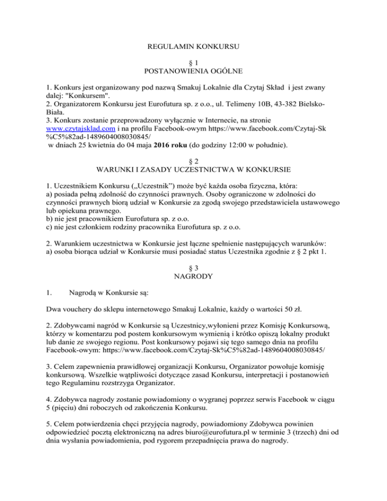 REGULAMIN KONKURSU §1 POSTANOWIENIA OGÓLNE 1. Konkurs jest organizowany pod nazwą Smakuj Lokalnie dla Czytaj Skład i jest zwany dalej: "Konkursem". 2. Organizatorem Konkursu jest Eurofutura sp. z o.o., ul. Telimeny 10B, 43-382 BielskoBiała. 3. Konkurs zostanie przeprowadzony wyłącznie w Internecie, na stronie www.czytajsklad.com i na profilu Facebook-owym https://www.facebook.com/Czytaj-Sk %C5%82ad-1489604008030845/ w dniach 25 kwietnia do 04 maja 2016 roku (do godziny 12:00 w południe). §2 WARUNKI I ZASADY UCZESTNICTWA W KONKURSIE 1. Uczestnikiem Konkursu („Uczestnik”) może być każda osoba fizyczna, która: a) posiada pełną zdolność do czynności prawnych. Osoby ograniczone w zdolności do czynności prawnych biorą udział w Konkursie za zgodą swojego przedstawiciela ustawowego lub opiekuna prawnego. b) nie jest pracownikiem Eurofutura sp. z o.o. c) nie jest członkiem rodziny pracownika Eurofutura sp. z o.o. 2. Warunkiem uczestnictwa w Konkursie jest łączne spełnienie następujących warunków: a) osoba biorąca udział w Konkursie musi posiadać status Uczestnika zgodnie z § 2 pkt 1. §3 NAGRODY 1. Nagrodą w Konkursie są: Dwa vouchery do sklepu internetowego Smakuj Lokalnie, każdy o wartości 50 zł. 2. Zdobywcami nagród w Konkursie są Uczestnicy,wyłonieni przez Komisję Konkursową, którzy w komentarzu pod postem konkursowym wymienią i krótko opiszą lokalny produkt lub danie ze swojego regionu. Post konkursowy pojawi się tego samego dnia na profilu Facebook-owym: https://www.facebook.com/Czytaj-Sk%C5%82ad-1489604008030845/ 3. Celem zapewnienia prawidłowej organizacji Konkursu, Organizator powołuje komisję konkursową. Wszelkie wątpliwości dotyczące zasad Konkursu, interpretacji i postanowień tego Regulaminu rozstrzyga Organizator. 4. Zdobywca nagrody zostanie powiadomiony o wygranej poprzez serwis Facebook w ciągu 5 (pięciu) dni roboczych od zakończenia Konkursu. 5. Celem potwierdzenia chęci przyjęcia nagrody, powiadomiony Zdobywca powinien odpowiedzieć pocztą elektroniczną na adres [email protected] w terminie 3 (trzech) dni od dnia wysłania powiadomienia, pod rygorem przepadnięcia prawa do nagrody. 8. Za przekazanie nagrody zwycięzcy odpowiedzialny będzie pracownik firmy SmakujLokalnie.pl 9. W myśl niniejszego regulaminu, każdy uczestnik zwalnia serwis Facebook z odpowiedzialności za konkurs prowadzony przez Eurofutura sp. z o.o. 10. Konkurs nie jest w żaden sposób sponsorowany, popierany, przeprowadzany przez serwis Facebook, ani z nim związany. §4 DANE OSOBOWE UCZESTNIKÓW KONKURSU 1. Warunkiem udziału w Konkursie jest podanie przez Uczestnika Konkursu prawdziwych danych osobowych, tj.: imienia, nazwiska, adresu, adresu konta poczty elektronicznej, numeru tel. kontaktowego niezbędnych do przekazania nagrody. 2. Przystępując do Konkursu i akceptując niniejszy regulamin Uczestnik wyraża zgodę na przetwarzanie podanych przez niego danych osobowych przez Organizatora. Dane będą przetwarzane w celu przeprowadzenia Konkursu oraz w związku z wydaniem nagrody. §5 POSTANOWIENIA KOŃCOWE Organizator ma prawo do zmiany postanowień niniejszego Regulaminu, o ile nie wpłynie to na pogorszenie warunków uczestnictwa w Konkursie. Dotyczy to w szczególności zmian terminów poszczególnych czynności konkursowych. Zmieniony Regulamin obowiązuje od czasu opublikowania go na stronie www.czytajsklad.com