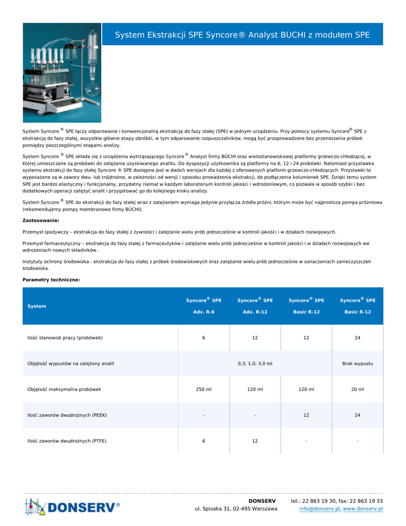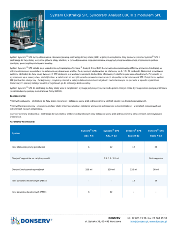 System Ekstrakcji SPE Syncore® Analyst BUCHI z modułem SPE System Syncore ® SPE łączy odparowanie i konwencjonalną ekstrakcję do fazy stałej (SPE) w jednym urządzeniu. Przy pomocy systemu Syncore® SPE z ekstrakcją do fazy stałej, wszystkie główne etapy obróbki, w tym odparowanie rozpuszczalników, mogą być przeprowadzone bez przenoszenia próbek pomiędzy poszczególnymi etapami analizy. System Syncore ® SPE składa się z urządzenia wytrząsającego Syncore ® Analyst firmy BÜCHI oraz wielostanowiskowej platformy grzewczo-chłodzącej, w której umieszczane są probówki do zatężania uzyskiwanego analitu. Do dyspozycji użytkownika są platformy na 6, 12 i 24 probówki. Natomiast przystawka systemu ekstrakcji do fazy stałej Syncore ® SPE dostępna jest w dwóch wersjach dla każdej z oferowanych platform grzewczo-chłodzących. Przystawki te wyposażone są w zawory dwu- lub trójdrożne, w zależności od wersji i sposobu prowadzenia ekstrakcji, do podłączenia kolumienek SPE. Dzięki temu system SPE jest bardzo elastyczny i funkcjonalny, przydatny niemal w każdym laboratorium kontroli jakości i wdrożeniowym, co pozwala w sposób szybki i bez dodatkowych operacji zatężyć analit i przygotować go do kolejnego kroku analizy. System Syncore ® SPE do ekstrakcji do fazy stałej wraz z zatężaniem wymaga jedynie przyłącza źródła próżni, którym może być najprostsza pompa próżniowa (rekomendujemy pompy membranowe firmy BÜCHI). Zastosowanie: Przemysł spożywczy – ekstrakcja do fazy stałej z żywności i zatężanie wielu prób jednocześnie w kontroli jakości i w działach rozwojowych. Przemysł farmaceutyczny – ekstrakcja do fazy stałej z farmaceutyków i zatężanie wielu prób jednocześnie w kontroli jakości i w działach rozwojowych we wdrożeniach nowych składników. Instytuty ochrony środowiska - ekstrakcja do fazy stałej z próbek środowiskowych oraz zatężanie wielu prób jednocześnie w oznaczeniach zanieczyszczeń środowiska. Parametry techniczne: Syncore® SPE Syncore® SPE Syncore® SPE Syncore® SPE Adv. R-6 Adv. R-12 Basic R-12 Basic R-12 6 12 12 24 System Ilość stanowisk pracy (probówek) Objętość wypustów na zatężony analit Objętość maksymalna probówek 0,3; 1,0; 3,0 ml Brak wypustu 250 ml 120 ml 120 ml 20 ml Ilość zaworów dwudrożnych (PEEK) - - 12 24 Ilość zaworów dwudrożnych (PTFE) 6 12 - - DONSERV ul. Spisaka 31, 02-495 Warszawa tel.: 22 863 19 30, fax: 22 863 19 33 [email protected], www.donserv.pl Przyłącze chłodnicy zwrotnej 1 1 - - Naczynia odpadowe i zbiorcze 1 1 - - Wymiary urządzenia wytrząsającego (do montażu platformy 480 x 354 x 487 mm grzewczo-chłodzącej – bez wyposażenia) Wymiary urządzenia wytrząsającego (bez wyposażenia) Zasilanie elektryczne Częstotliwość Pobór mocy Zakres obrotów wytrząsania Maksymalna temperatura grzania probówek Minimalna temperatura chłodzenia wypustów Zakres temperatury oparów (dla pokrywy próżniowej) Programy temperaturowe 30 kg 230 V ±10% 50/60 Hz 1500 W 0 ÷ 600 rpm +150°C -20°C od temp. pokojowej do +70°C 9 kroków, do 9 godzin 59 minut każdy Producent BÜCHI Labortechnik AG Link do pliku źródłowego DONSERV ul. Spisaka 31, 02-495 Warszawa tel.: 22 863 19 30, fax: 22 863 19 33 [email protected], www.donserv.pl