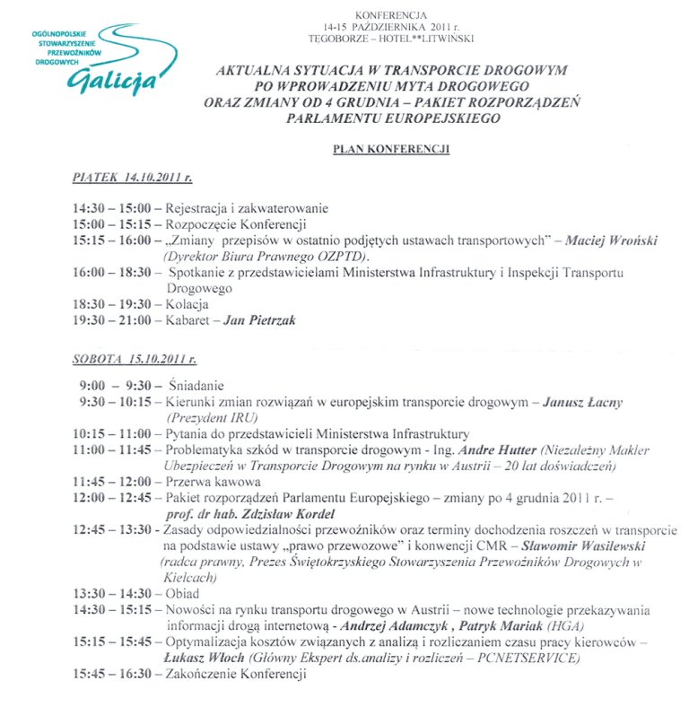 0 OGOLNOPOLSKIE 5TOWARZYSZENIE PRZEWoiNIKOW DROGOWYCH Cjaliela KONFERENC.JA 14-15 rAZOZIERNIKA 2011 r. TE;GOBORZE - HOTEL **L1TWINSKI AKTUALNA SYTUACJA W TRANSPORCIE DROGOWYM PO WPROWADZENIU MYTA DROGOWEGO ORAZ ZMIANY OD 4 GRUDNIA - PAKIET ROZPORZ~DZEN PARLAMENTU EUROPEJSKIEGO 14:30 - 15:00 - Rejestracja i zakwaterowanie 15:00 -15:15 - Rozpoczycie Konferencji 15:15 -16:00 - "Zll1iany przepis6w w ostatnio podjytych ustawach transportowych" -Maciej Wronski (Dyrektor Biura Prawn ego OZPTD). 16:00 -18:30 - Spotkanie z przedstawicielall1i Ministerstwa Infrastruktury i Inspekcji Transportu Drogowego 18:30 -19:30 - Kolacja 19:30 - 21:00 - Kabaret - Jan Pietrzak SOBOTA /5./0.2011 r. 9:00 - 9:30 - Sniadanie 9:30 - 10:15 - Kierunki zll1ian rozwiqzall w europejskill1 transporcie drogowYIl1 - Janusz Lacny (Prezydent IRU) 10:15 - 11:00 - Pytania do przedstawicieli Ministerstwa Infrastruktury 11:00 - 11:45 - Problell1atyka szk6d w transporcie drogowyll1 - Ing. Andre Hutter (Niezale:iny Makler Ubezpieezen w Transporeie Drogowym na rynku w Austrii - 20 lat doswiadezen) 11:45 -12:00 - Przerwa kawowa 12:00 - 12:45 - Pakiet rozporzqdzen Parlamentu Europejskiego - zmiany po 4 grudnia 2011 r.prof dr hab. Zdzislaw Kordel 12:45 - 13:30 - Zasady odpowiedzialnosci przewoinik6w oraz terminy dochodzenia roszczell w transporcie na podstawie ustawy "prawo przewozowe" i konwencji CMR - Slawomir Wasilewski (radea prawny, Prezes SWi?tokrzyskiego Stowarzyszenia Przewoinik6w Drogowych w Kielcach) 13:30 - 14:30 - Obiad 14:30 - 15:15 - Nowosci na rynku transportu drogowego w Austrii - nowe technologie przekazywania informacji drogq internetowq - Andrzej Adamczyk, Patryk Mariak (HGA) 15:15 -15:45 - Optymalizacja koszt6w zwiqzanych z analizq i rozliczaniem czasu pracy kierowc6wLukasz Wloch (GlrJwny Ekspert ds.analizy i rozliezen - PCNETSERVICE) 15:45 - 16:30 - Zakonczenie Konferencji