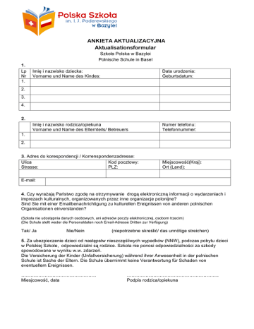ANKIETA AKTUALIZACYJNA Aktualisationsformular Szkoła Polska w Bazylei Polnische Schule in Basel 1. Lp Nr 1. Imię i nazwisko dziecka: Vorname und Name des Kindes: Data urodzenia: Geburtsdatum: Imię i nazwisko rodzica/opiekuna Vorname und Name des Elternteils/ Betreuers Numer telefonu: Telefonnummer: 2. 3. 4. 2. 1. 2. 3. Adres do korespondencji / Korrenspondenzadresse: Ulica Kod pocztowy: Strasse: PLZ: Miejscowość(Kraj): Ort (Land): E-mail: 4. Czy wyrażają Państwo zgodę na otrzymywanie drogą elektroniczną informacji o wydarzeniach i imprezach kulturalnych, organizowanych przez inne organizacje polonijne? Sind Sie mit einer Emailbenachrichtigung zu kulturellen Ereignissen von anderen polnischen Organisationen einverstanden? (Szkoła nie udostępnia danych osobowych, ani adresów poczty elektronicznej, osobom trzecim) (Die Schule stellt weder die Personaldaten noch Email-Adresse Dritten zur Verfügung) Tak/ Ja Nie/Nein (niepotrzebne skreślić/ das unnötige streichen) 5. Za ubezpieczenie dzieci od następstw nieszczęśliwych wypadków (NNW), podczas pobytu dzieci w Polskiej Szkole, odpowiedzialni są rodzice. Szkoła nie ponosi odpowiedzialności za szkody spowodowane w wyniku w.w. zdarzeń. Die Versicherung der Kinder (Unfallversicherung) während ihrer Anwesenheit in der polnischen Schule ist Sache der Eltern. Die Schule übernimmt keine Verantwortung für Schaden von eventuellem Ereignissen. ………………………………………… Miesjcowość, data ………………………………………………….. Podpis rodzica/opiekuna