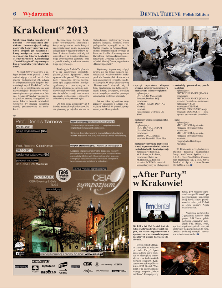 6 DENTAL TRIBUNE Wydarzenia Polish Edition Krakdent® 2013 Niezliczona liczba branżowych nowości – rewolucyjnych produktów i innowacyjnych usług, niezwykle bogaty program naukowy obejmujący szkolenia i kursy medyczne oraz ceniona w środowisku lekarzy dentystów Międzynarodowa Konferencja „Dental Spaghetti” – tym wszystkim przywitał w tym roku Krakdent®. Niemal 300 wystawców z całego świata oraz ponad 11 000 zwiedzających – tak w skrócie można podsumować 21. edycję Międzynarodowych Targów Stomatologicznych Krakdent®, które od wielu lat postrzegane są jako najważniejsze branżowe wydarzenie pierwszego półrocza w Polsce. Krakdent® tradycyjnie rozpoczął rok w branży. Spragnieni nowości lekarze tłumnie odwiedzili wystawę, by poznać światowe trendy prezentowane na stoiskach. AD Tegorocznym Targom Krakdent® towarzyszyły szkolenia i kursy medyczne w czasie których zaprezentowano m.in. najnowsze osiągnięcia w leczeniu urazów zębów. Lekarze dowiedzieli się też wszystkiego na temat profesjonalnego prowadzenia gabinetu oraz uzyskali wiedzę z zakresu marketingu i psychologii. Stefen Koubi – najlepszy prywatny praktyk francuski. Ponadto, w roli prelegentów wystąpili m.in.: dr Walter Devoto, dr Andrea Ricci – słynny implantolog z Florencji, dr Francesc Abella z Uniwersytetu w Barcelonie i dr Dinos Kountouras – założyciel Greckiej Akademii” – mówi dr Maciej Żarow, organizator „Dental Spaghetti”. Tradycyjnie 3. dnia Targów odbyła się konferencja stomatologiczna „Dental Spaghetti”, która zgromadziła ponad 200 uczestników. Tegoroczna edycja poświęcona była zagadnieniom interdyscyplinarnym, powiązanym z okluzją, artykulacją, stawami skroniowo-żuchwowymi, problemem starcia zębów, erozji oraz nowoczesnych technologii i sposobów odbudowy utraty tkanek zęba. Wystawcy tegorocznej edycji targów po raz trzeci wsparli najmłodszych wychowanków małopolskich domów dziecka oraz rodzin zastępczych i świetlic środowiskowych. W akcję charytatywną „Dentopomoc” włączyło się 19 firm, przekazując nie tylko szczoteczki i pasty do zębów, ale także wiele innych produktów pomagających dbać o zdrowy uśmiech. „W tym roku gościliśmy aż 5 bardzo znanych wykładowców. Po raz pierwszy przyjechał do nas dr Jak co roku, wyłoniono zwycięzców konkursu o Medal Najwyższej Jakości. W tym roku przyznano je w 5 kategoriach: – sprzęt, aparatura diagnostyczno-zabiegowa oraz instrumentarium stomatologiczne: · zgłaszający: OPTIDENT Małgorzata Foubert, Dariusz Stój · producent: CARESTREAM DENTAL Niemcy · produkt: Pantomograf Cyfrowy CS 8100. – materiały pomocnicze, profilaktyka: · zgłaszający: PHYTOPHARM KLĘKA S.A. · producent: PHYTOPHARM KLĘKA S.A. · produkt: Dentofresh Junior oraz · zgłaszający: SMP · producent: DENTAL REVOLUTION SAS Francja · produkt: OOBRUSH – elektryczna szczoteczka do zębów – materiały stomatologiczne i kliniczne: · zgłaszający: HOL-DENTAL DEPOT Urszula Chudak · producent: SHOFU INC. Japonia · produkt: Beautifil Flow Plus. – inne: · zgłaszający: MEDIAFLOR Agnieszka Florczak-Skwierczyńska · producent: MEDIAFLOR Agnieszka Florczak-Skwierczyńska · produkt: Nagrody dla Dzielnego Pacjenta – materiały używane (lub stosowane) w pracowniach i laboratoriach techniki dentystycznej: · zgłaszający: Roko s.c. M. Rokosa, A. Rokosa, · producent: Roko s.c. M. Rokosa, A. Rokosa · produkt: ACRON – materiał termoplastyczny na płyty protez W Konkursie o Najładniejsze Stoisko Targowe nagrodzono firmy: Kol-Dental Spółka z o.o. S.K.A., GlaxoSmithKline Consumer Healthcare Sp. z o.o., OMS Polska Ltd. Sp. z o.o. oraz Denon Dental Sp. z o.o. DT „After Party” w Krakowie! funky pop rozgrzał zgromadzoną publiczność, po półgodzinnym koncercie swój krótki show przedstawiła mistrzyni Polski w „pole dance”, Agata Malchrowicz. Od kilku lat FM Dental jest nie tylko wystawcą krakowskich targów, ale także organizatorem i sponsorem wieczornych imprez, na których goście bawią się doskonale. W tym roku FM Dental zaprosiła na wieczór pt.: „After Party”. Spotkanie odbyło się w miejscu o niezwykłej atmosferze – w krakowskich Fortach Kleparz. Koncert otworzył współwłaściciel FM Dental, Wojciech Feć zapowiadając występ zespołu „Made in China”. Energetyczny Następnie swój blisko 2-godzinny koncert dała grupa B.B.Blues, gdzie perkusją „zarządza” Wojciech Feć. Blues, rock, a potem pop i inne gatunki muzyki królowały na parkiecie aż do rana. Oprócz świetnej muzyki serwowano doskonałe sushi. DT 8 DENTAL TRIBUNE Wydarzenia Polish Edition Kol-Dental – eksperci profesjonalistom Tegoroczne targi Krakdent, które odbyły się 7-9. marca br. rozpoczęły się od mocnego akcentu. Już pierwszego dnia na stoisku KolDental uroczyście zostało zaprezentowane nowe hasło reklamowe, które ma podkreślać doświadczenie i dbałość firmy o dobre relacje z klientami. Nowy slogan reklamowy jest wynikiem rozstrzygnięcia przez firmę Kol-Dental trwającego blisko pół roku konkursu prowadzonego wśród aktywnych klientów firmy. Konkurs cieszył się dużą popularnością wśród lekarzy dentys- chodu Mercedes-Benz Klasy A Ewie Grzywna było największym wydarzeniem pierwszego dnia targów. „Jako jedna z wiodących firm w dziedzinie dystrybucji materiałów i sprzętu do gabinetów stomatologicznych wiemy, że największą pracę w popularyzacji wiedzy o is- tocie dbania o stan naszego uzębienia oraz jego wpływie na cały ludzki organizm wykonują w Polsce małe, jednoosobowe prywatne praktyki. To one w miastach i miasteczkach są najbliżej pacjentów, ciesząc się ich zaufaniem. Często to lekarze z takich właśnie gabinetów są najbardziej otwarci na nową wiedzę i nowe możliwości, jakie niesie za sobą rozwój techniki. Jesteśmy szczęśliwi, że osoba, która wygrała główną nagrodę w naszym konkursie prowadzi