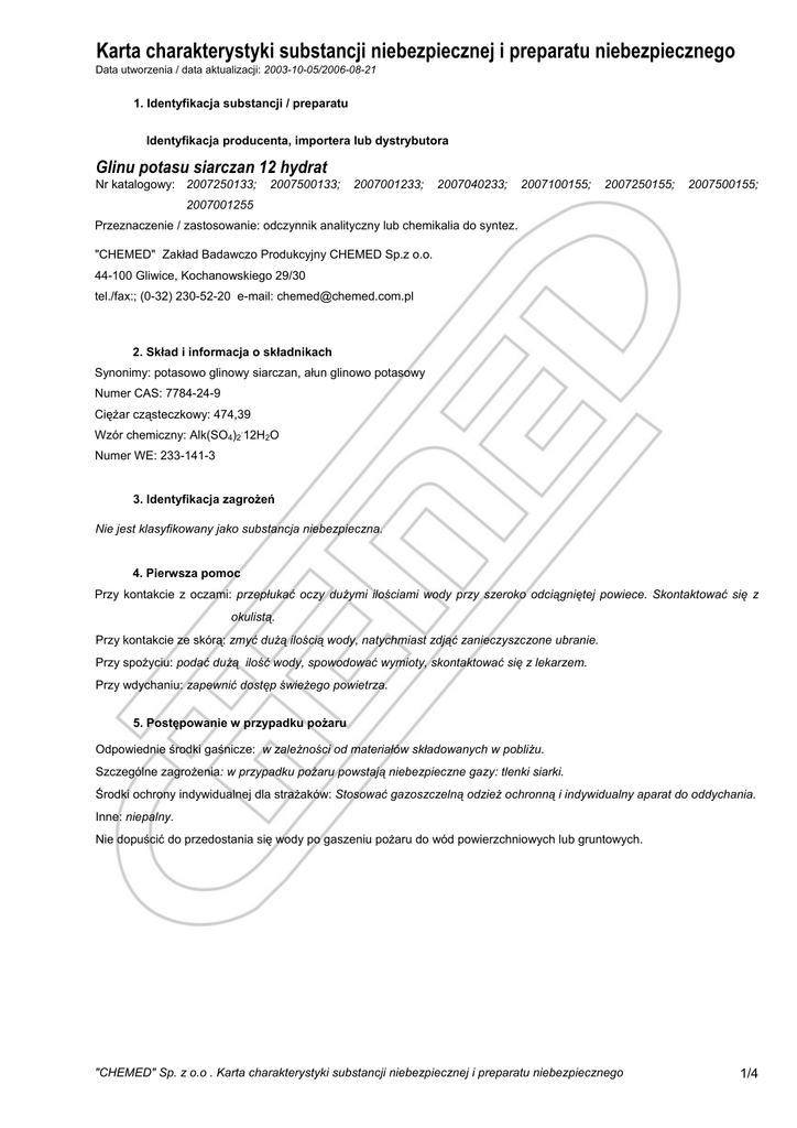 Karta charakterystyki substancji niebezpiecznej i preparatu niebezpiecznego Data utworzenia / data aktualizacji: 2003-10-05/2006-08-21 1. Identyfikacja substancji / preparatu Identyfikacja producenta, importera lub dystrybutora Glinu potasu siarczan 12 hydrat Nr katalogowy: 2007250133; 2007500133; 2007001233; 2007040233; 2007100155; 2007250155; 2007500155; 2007001255 Przeznaczenie / zastosowanie: odczynnik analityczny lub chemikalia do syntez. "CHEMED" Zakład Badawczo Produkcyjny CHEMED Sp.z o.o. 44-100 Gliwice, Kochanowskiego 29/30 tel./fax:; (0-32) 230-52-20 e-mail: [email protected] 2. Skład i informacja o składnikach Synonimy: potasowo glinowy siarczan, ałun glinowo potasowy Numer CAS: 7784-24-9 Ciężar cząsteczkowy: 474,39 . Wzór chemiczny: Alk(SO4)2 12H2O Numer WE: 233-141-3 3. Identyfikacja zagrożeń Nie jest klasyfikowany jako substancja niebezpieczna. 4. Pierwsza pomoc Przy kontakcie z oczami: przepłukać oczy dużymi ilościami wody przy szeroko odciągniętej powiece. Skontaktować się z okulistą. Przy kontakcie ze skórą: zmyć dużą ilością wody, natychmiast zdjąć zanieczyszczone ubranie. Przy spożyciu: podać dużą ilość wody, spowodować wymioty, skontaktować się z lekarzem. Przy wdychaniu: zapewnić dostęp świeżego powietrza. 5. Postępowanie w przypadku pożaru Odpowiednie środki gaśnicze: w zależności od materiałów składowanych w pobliżu. Szczególne zagrożenia: w przypadku pożaru powstają niebezpieczne gazy: tlenki siarki. Środki ochrony indywidualnej dla strażaków: Stosować gazoszczelną odzież ochronną i indywidualny aparat do oddychania. Inne: niepalny. Nie dopuścić do przedostania się wody po gaszeniu pożaru do wód powierzchniowych lub gruntowych. "CHEMED" Sp. z o.o . Karta charakterystyki substancji niebezpiecznej i preparatu niebezpiecznego 1/4 Glinu potasu siarczan 12 hydrat 6. Postępowanie w przypadku niezamierzonego uwolnienia do środowiska Zebrać na sucho, przekazać do likwidacji. Oczyścić zanieczyszczony teren. Nie dopuścić do dostania się do wód, ścieków i gleby. Unikać pylenia. Nie wdychać pyłów. 7. Postępowanie z substancją / preparatem i jej / jego magazynowanie Obchodzenie się z substancją: Zapewnić skuteczną wymianę powietrza (wentylacja). Postępować zgodnie z zasadami dobrej praktyki przemysłowej oraz ogólnymi zasadami bezpieczeństwa i higieny pracy z substancjami chemicznymi. Stosować środki ochrony osobistej zgodnie z pkt.8. Nie opróżniać do kanalizacji. Magazynowanie: szczelne opakowania, suche pomieszczenie. Temperatura pokojowa (wskazane od+15 do +25 °C). 8. Kontrola narażenia i środki ochrony indywidualnej Parametry kontroli (NDS, NDSCh, NDSP): nie ustalone Stosować odpowiednią wentylację wywiewną, miejscową i ogólną zapewniającą utrzymanie stężenia produktu w powietrzu poniżej określonych limitów (minimum 10-krotna wymiana powietrza na godzinę). Zaleca się wyposażenie miejsca pracy w wodny natrysk do płukania oczu oraz prysznic. Środki ochrony indywidualnej powinny być tak zaprojektowane i wykonane aby wykluczały zagrożenie i inne niedogodności w przewidywanych warunkach użytkowania, chroniące przed chemikaliami. Dz. U. nr 217, Rozporządzenie z dnia 29 listopada 2002 (poz. 1833); Dz. U. nr 80, Rozporządzenie z dnia 31 marca 2003 (poz. 725), Dz. U. nr212(poz. 1769), Rozporządzenie Ministra Gospodarki i Pracy z dnia 10 października 2005 Środki ochrony indywidualnej: ochrona dróg oddechowych: konieczna gdy powstają pyły - respirator ochrona oczu: konieczna - okulary ochronne typu gogle ochrona rąk: konieczna – rękawice ochronne, chroniące przed chemikaliami (znak CE) ochrona ciała: konieczna – ubranie ochronne środki ochronne i higieny: zmienić zanieczyszczone ubranie, wymyć ręce po pracy z tą substancją. 9. Własności fizykochemiczne Forma: ciało stałe lepkość dynamiczna: Kolor: biały lepkość kinematyczna: Zapach: bez zapachu Ciśnienie par: nie dotyczy pH: około 3,0-3,5 (20 g/l H2O, 20 °C) Gęstość: 1,74 g/cm3 (20°C) Temperatura topnienia: 92°C Ciężar nasypowy: około 900 kg/m3 Temperatura wrzenia: rozkład >280°C Rozpuszczalność: Temperatura samozapłonu: nie dotyczy w wodzie: 139 g/l (20°C) Temperatura zapłonu: nie dotyczy w rozpuszczalnikach organicznych: brak danych Granice wybuchowości: nie dotyczy log P(w/o): dolna: górna: "CHEMED" Sp. z o.o . Karta charakterystyki substancji niebezpiecznej i preparatu niebezpiecznego 2/4 Glinu potasu siarczan 12 hydrat 10. Stabilność i reaktywność Warunki których należy unikać: brak. Materiały których należy unikać: brak. Niebezpieczne produkty rozkładu: brak. Następne dane: w czasie ogrzewania wydziela wodę krystalizacyjną. 11. Informacje toksykologiczne Informacje toksykologiczne: brak danych ilościowych. Pozostałe dane: przy kontakcie ze skórą: podrażnienia; przy spożyciu: podrażnienie dróg pokarmowych; przy kontakcie z oczami: podrażnienie. 12. Informacje ekologiczne Przy ostrożnym i fachowym posługiwaniu się substancją, nie powinny wystąpić problemy ekologiczne. 13. Postępowanie z odpadami ZBP CHEMED przyjmuje do likwidacji substancje i opakowania po tych substancjach zakupione w ZBP CHEMED. Utylizacją odpadów powinny zająć się wyspecjalizowane firmy. Opakowanie jednorazowego ubytku traktować jak odpad i przekazać odbiorcy odpadów. Sposób likwidacji zebranych odpadów uzgodnić z właściwym terenowo wydziałem ochrony środowiska. Ustawy z dnia 27.04.2001 (Dz. U. nr 62, poz. 628), z dnia 11.05.2001 (Dz. U. nr 63 poz. 638)z poźn. zm. Rozporządzenie z dnia 27.09.2001 (Dz. U. nr 112, poz. 1206) 14. Informacje o transporcie Klasa ADR i grupa pakowania: nie jest przedmiotem przepisów transportowych Numer UN: nie dotyczy Nazwa materiału (wg UN): nie dotyczy "CHEMED" Sp. z o.o . Karta charakterystyki substancji niebezpiecznej i preparatu niebezpiecznego 3/4 Glinu potasu siarczan 12 hydrat 15. Informacje dotyczą