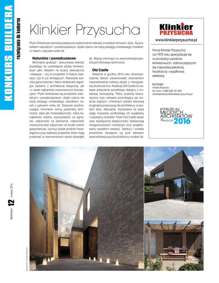 rozwiązania do konkursu Płytki klinkierowe stanowią estetyczne wykończenie elewacji w każdym klimacie i stylu. Są produktem naturalnym i ponadczasowym, dzięki czemu nie tracą swojego unikatowego charakteru nawet z upływem wielu lat. Naturalne i ponadczasowe Minimalna grubość i stosunkowa lekkość pozwalają na użytkowanie płytek klinkierowych jako okładzin na ściany wewnętrzne i elewacje – czy to projektów w trakcie realizacji, czy to już istniejących. Niezwykle szeroka gama kolorów i faktur doskonale współgra zarówno z architekturą klasyczną, jak i z nawet najbardziej nowoczesnymi koncepcjami. Płytki klinkierowe są produktem naturalnym i ponadczasowym, dzięki czemu nie tracą swojego unikatowego charakteru nawet z upływem wielu lat. Znacznie przekraczające minimalne normy parametry techniczne, takie jak mrozoodporność, niska nasiąkliwość wodna, wytrzymałość na zginanie, odporność na plamienie, odporność chemiczna oraz odporność na środki chemii gospodarczej, czynią z płytek produkt niezastąpiony przy realizacji projektów, które mają przetrwać w niezmienionym stanie dziesiątki Zdjęcia arch. Klinkier Przysucha Builder 12 marzec 2016 KONKURS BUILDERA Klinkier Przysucha lat. Więcej informacji na www.klinkierprzysucha.pl/informacje-techniczne. Old Castle Otwarcie w grudniu 2013 roku ultranowoczesnej fabryki zaowocowało stworzeniem niepowtarzalnej kolekcji płytek o nieregularnej strukturze lica. Kolekcja Old Castle to ciekawe połączenie szorstkiego designu z unikatową kolorystyką. Pełny przekrój kolorystyczny oraz ciekawie przenikające się melanże ciepłych i chłodnych odcieni stanowią oryginalną propozycję dla architektury w każdym stylu. Naturalne, stylizowane na stare cegły krzywizny podkreślają ich wyjątkowy i rustykalny charakter. Płytki Old Castle dzięki swej stylistycznej elastyczności dostarczają nieograniczonych możliwości przy projektowaniu wszelkich elewacji. Tekstury i modele produktów dostępne są pod adresem www.klinkierprzysucha.pl/tekstury-modele-3d. www.klinkierprzysucha.pl Firma Klinkier Przysucha od 1972 roku specjalizuje się w produkcji wyrobów klinkierowych, odznaczających się najwyższą jakością, trwałością i wyjątkową estetyką. Kontakt: Aneta Krawiec tel. kom.: (+48) 668 137 463 [email protected] KONKURS dla MŁODYCH ARCHITEKTÓW 4edycja 2016