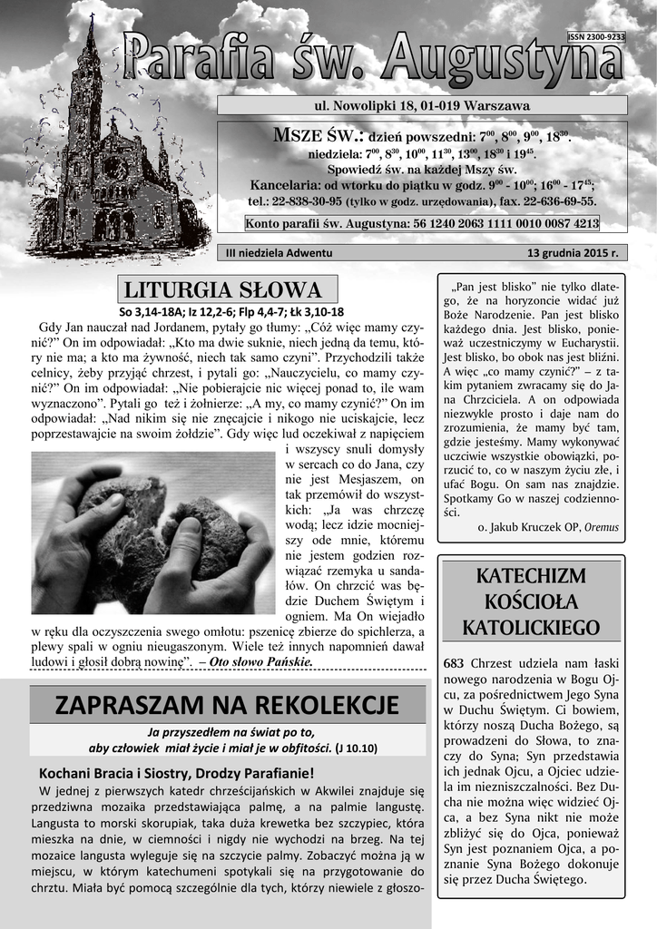 ISSN 2300-9233 ul. Nowolipki 18, 01-019 Warszawa MSZE ŚW.: dzień powszedni: 7 00 , 800, 900, 1830. niedziela: 700, 830, 1000, 1130, 1300, 1830 i 1945. Spowiedź św. na każdej Mszy św. Kancelaria: od wtorku do piątku w godz. 900 - 1000; 1600 - 1745; tel.: 22-838-30-95 (tylko w godz. urzędowania), fax. 22-636-69-55. Konto parafii św. Augustyna: 56 1240 2063 1111 0010 0087 4213 III niedziela Adwentu LITURGIA SŁOWA So 3,14-18A; Iz 12,2-6; Flp 4,4-7; Łk 3,10-18 Gdy Jan nauczał nad Jordanem, pytały go tłumy: „Cóż więc mamy czynić?” On im odpowiadał: „Kto ma dwie suknie, niech jedną da temu, który nie ma; a kto ma żywność, niech tak samo czyni”. Przychodzili także celnicy, żeby przyjąć chrzest, i pytali go: „Nauczycielu, co mamy czynić?” On im odpowiadał: „Nie pobierajcie nic więcej ponad to, ile wam wyznaczono”. Pytali go też i żołnierze: „A my, co mamy czynić?” On im odpowiadał: „Nad nikim się nie znęcajcie i nikogo nie uciskajcie, lecz poprzestawajcie na swoim żołdzie”. Gdy więc lud oczekiwał z napięciem i wszyscy snuli domysły w sercach co do Jana, czy nie jest Mesjaszem, on tak przemówił do wszystkich: „Ja was chrzczę wodą; lecz idzie mocniejszy ode mnie, któremu nie jestem godzien rozwiązać rzemyka u sandałów. On chrzcić was będzie Duchem Świętym i ogniem. Ma On wiejadło w ręku dla oczyszczenia swego omłotu: pszenicę zbierze do spichlerza, a plewy spali w ogniu nieugaszonym. Wiele też innych napomnień dawał ludowi i głosił dobrą nowinę”. – Oto słowo Pańskie. ZAPRASZAM NA REKOLEKCJE Ja przyszedłem na świat po to, aby człowiek miał życie i miał je w obfitości. (J 10.10) Kochani Bracia i Siostry, Drodzy Parafianie! W jednej z pierwszych katedr chrześcijańskich w Akwilei znajduje się przedziwna mozaika przedstawiająca palmę, a na palmie langustę. Langusta to morski skorupiak, taka duża krewetka bez szczypiec, która mieszka na dnie, w ciemności i nigdy nie wychodzi na brzeg. Na tej mozaice langusta wyleguje się na szczycie palmy. Zobaczyć można ją w miejscu, w którym katechumeni spotykali się na przygotowanie do chrztu. Miała być pomocą szczególnie dla tych, którzy niewiele z głoszo- 13 grudnia 2015 r. „Pan jest blisko” nie tylko dlatego, że na horyzoncie widać już Boże Narodzenie. Pan jest blisko każdego dnia. Jest blisko, ponieważ uczestniczymy w Eucharystii. Jest blisko, bo obok nas jest bliźni. A więc „co mamy czynić?” – z takim pytaniem zwracamy się do Jana Chrzciciela. A on odpowiada niezwykle prosto i daje nam do zrozumienia, że mamy być tam, gdzie jesteśmy. Mamy wykonywać uczciwie wszystkie obowiązki, porzucić to, co w naszym życiu złe, i ufać Bogu. On sam nas znajdzie. Spotkamy Go w naszej codzienności. o. Jakub Kruczek OP, Oremus KATECHIZM KOŚCIOŁA KATOLICKIEGO 683 Chrzest udziela nam łaski nowego narodzenia w Bogu Ojcu, za pośrednictwem Jego Syna w Duchu Świętym. Ci bowiem, którzy noszą Ducha Bożego, są prowadzeni do Słowa, to znaczy do Syna; Syn przedstawia ich jednak Ojcu, a Ojciec udziela im niezniszczalności. Bez Ducha nie można więc widzieć Ojca, a bez Syna nikt nie może zbliżyć się do Ojca, ponieważ Syn jest poznaniem Ojca, a poznanie Syna Bożego dokonuje się przez Ducha Świętego. nej im nauki rozumieli. Patrząc na ten obraz, mogli pomyśleć, że ich życie to życie w ciemności, w zimnie, jakie panuje na dnie morza, życie „denne”. Ale kiedy się ochrzczą i wejdą na drogę chrześcijańską, kiedy zaczną ufać Bogu i za Nim podążać, staną się jak ta langusta na palmie wyniesieni w górę, ku słońcu, ku ciepłu, ku szczęściu, w miejsce, do którego nigdy by sami nie dotarli. We współczesnym świecie powstała ogromna duchowa pustynia. Zrodziła się ona z odrzucenia Boga w życiu osobistym i społecznym. Przyniosła smutne owoce: bezsens, przygnębienie, ucieczkę od obowiązków. Stąd pojawia się pytanie: gdzie szukać pomocy? W Bogu, który w Jezusie Chrystusie stał się bliskim człowiekowi. Ten, który za nas umarł i zmartwychwstał pragnie nam udzielać swego Ducha we wspólnocie Kościoła. Piękną okazją zobaczenia innej perspektywy życia, pełnej sensu, szczęścia jest czas rekolekcji parafialnych. Dziękuję już dziś Dobremu Bogu za ten „święty czas” spotkania ze Słowem Bożym i z Wami, Drogimi Parafianami. Dziękuję Waszemu Proboszczowi i księżom wikariuszom za zaproszenie. Proszę o modlitwę i sam o niej zapewniam ufając, że czas rekolekcji pozwoli nam głębiej wejść w perspektywę wiary, przejść przez tę bramę i przełamać samego siebie. Niech dzieje się to w nas, na podobieństwo tego, co stało się z Abrahamem, abyśmy w naszym życiu, często trudnym i naznaczonym cierpieniem dostrzegali Boga czyniącego dobro. On prowadzi nas do dobrego celu. Serdecznie zapraszam i oczekuję spotkania z Wami! Ks. Jacek Sereda – duszpasterz rodzin PROGRAM REKOLEKCJI ADWENTOWYCH 2015 Niedziela 13 grudnia – ŻYJĘ, BO WIERZĘ Msze święte z kazaniem według porządku niedzielnego Poniedziałek 14 grudnia – ŻYJĘ, ALE MOGĘ BARDZIEJ Godz. 9.00 – Msza św. z kazaniem Godz. 18.30 – Msza św. z kazaniem Godz. 20.00 – Konferencja Wtorek 15 grudnia – ŻYJĘ, BO JESTEM KOCHANY Przez cały dzień Adoracja Najświętszego Sakramentu Godz. 9.00 – Msza św. z kazaniem Godz. 18.30 – Msza św. z kazaniem Godz. 20.00 – Konferencja SPOWIEDŹ ŚWIĘTA w godz.: 7.00 – 12.00 oraz 16.00 – 20.00 Środa 16 grudnia – ŻYJĘ, BY KOCHAĆ Dzień poświęcony małżeństwu i rodzinie Godz. 9.00 – Msza św. z odnowieniem ślubów małżeńskich Godz. 18.30 – Msza św. z odnowieniem ślubów małżeńskich Godz. 20.00 – Liturgia Słowa z odnowieniem ślubów małżeńskich, konferencja SERDECZNIE ZAPRASZAMY! 684 Duch Święty przez swoją łaskę pierwszy wzbudza naszą wiarę i udziela nowego życia, które polega na tym, abyśmy znali "jedyne