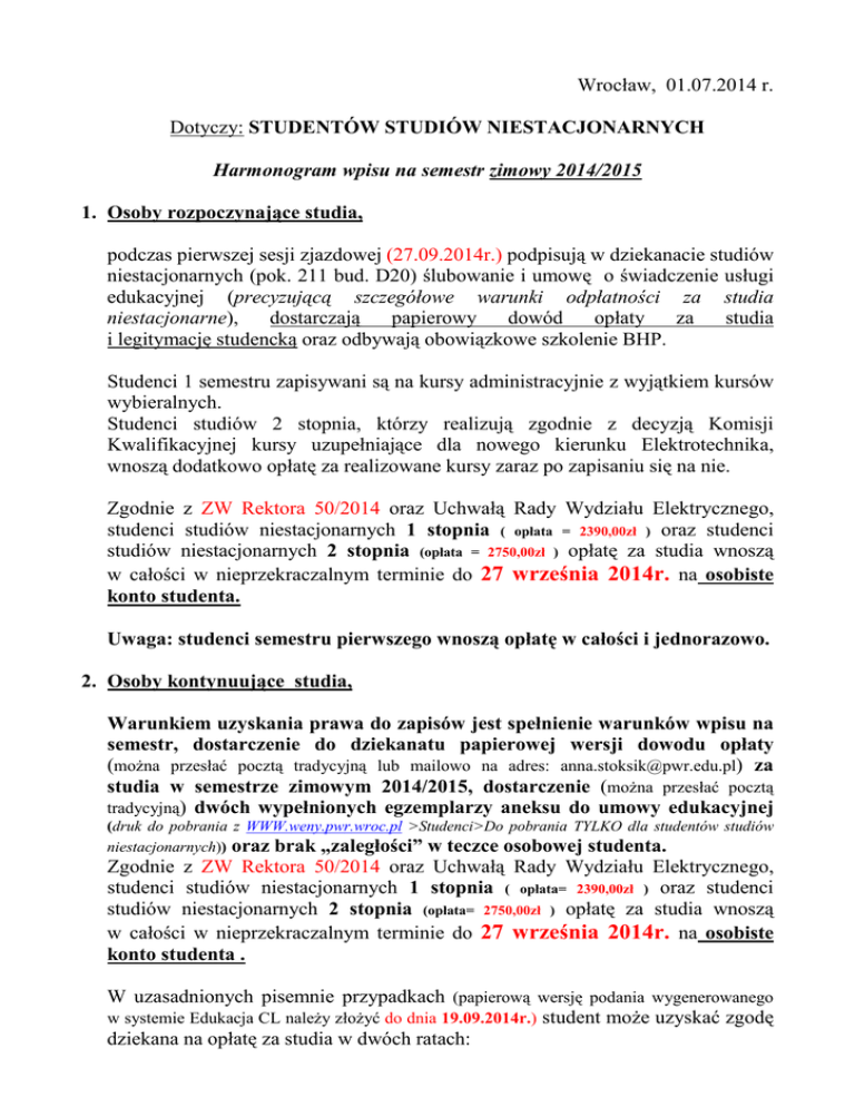 Wrocław, 01.07.2014 r. Dotyczy: STUDENTÓW STUDIÓW NIESTACJONARNYCH Harmonogram wpisu na semestr zimowy 2014/2015 1. Osoby rozpoczynające studia, podczas pierwszej sesji zjazdowej (27.09.2014r.) podpisują w dziekanacie studiów niestacjonarnych (pok. 211 bud. D20) ślubowanie i umowę o świadczenie usługi edukacyjnej (precyzującą szczegółowe warunki odpłatności za studia niestacjonarne), dostarczają papierowy dowód opłaty za studia i legitymację studencką oraz odbywają obowiązkowe szkolenie BHP. Studenci 1 semestru zapisywani są na kursy administracyjnie z wyjątkiem kursów wybieralnych. Studenci studiów 2 stopnia, którzy realizują zgodnie z decyzją Komisji Kwalifikacyjnej kursy uzupełniające dla nowego kierunku Elektrotechnika, wnoszą dodatkowo opłatę za realizowane kursy zaraz po zapisaniu się na nie. Zgodnie z ZW Rektora 50/2014 oraz Uchwałą Rady Wydziału Elektrycznego, studenci studiów niestacjonarnych 1 stopnia ( opłata = 2390,00zł ) oraz studenci studiów niestacjonarnych 2 stopnia (opłata = 2750,00zł ) opłatę za studia wnoszą w całości w nieprzekraczalnym terminie do 27 września 2014r. na osobiste konto studenta. Uwaga: studenci semestru pierwszego wnoszą opłatę w całości i jednorazowo. 2. Osoby kontynuujące studia, Warunkiem uzyskania prawa do zapisów jest spełnienie warunków wpisu na semestr, dostarczenie do dziekanatu papierowej wersji dowodu opłaty (można przesłać pocztą tradycyjną lub mailowo na adres: [email protected]) za studia w semestrze zimowym 2014/2015, dostarczenie (można przesłać pocztą tradycyjną) dwóch wypełnionych egzemplarzy aneksu do umowy edukacyjnej (druk do pobrania z WWW.weny.pwr.wroc.pl >Studenci>Do pobrania TYLKO dla studentów studiów niestacjonarnych)) oraz brak „zaległości” w teczce osobowej studenta. Zgodnie z ZW Rektora 50/2014 oraz Uchwałą Rady Wydziału Elektrycznego, studenci studiów niestacjonarnych 1 stopnia ( opłata= 2390,00zł ) oraz studenci studiów niestacjonarnych 2 stopnia (opłata= 2750,00zł ) opłatę za studia wnoszą w całości w nieprzekraczalnym terminie do 27 września 2014r. na osobiste konto studenta . W uzasadnionych pisemnie przypadkach (papierową wersję podania wygenerowanego w systemie Edukacja CL należy złożyć do dnia 19.09.2014r.) student może uzyskać zgodę dziekana na opłatę za studia w dwóch ratach: I termin – do 27 września 2014 r., II termin do - 22 listopada 2014 r. Proszę o umieszczenie w dowodzie wpłaty informacji o: opłaty za studia – jakiego semestru i roku akademickiego dotyczy opłaty za kursy powtarzane – jakich kursów dotyczy Studenci , którzy się wznowili na semestr zimowy 2014/15 zobowiązani są do dostarczenia (można przesłać pocztą tradycyjną) do dziekanatu studiów niestacjonarnych podpisanych aneksów do umowy edukacyjnej (2 egzemplarze, druk do pobrania z WWW.weny.pwr.wroc.pl >Studenci>Do pobrania TYLKO dla studentów studiów niestacjonarnych) do dnia 27.09.2014 r. 2.a. Studenci, którzy zaliczyli wszystkie kursy objęte programem nauczania do semestru letniego 2013/14 włącznie, zaraz po zakończeniu sesji egzaminacyjnej informują dziekanat o tym fakcie ( osobiście lub mailem). Warunkiem uzyskania prawa do zapisów jest: - komplet dokumentacji w teczce studenta do sem. letniego 2013/14 włącznie - dokonanie opłaty za studia i przesłanie mailowo wersji papierowej dowodu wpłaty na adres: [email protected]. 2.b. Studenci, którzy nie zaliczyli wszystkich kursów objętych programem nauczania do semestru letniego 2013/14 włącznie, składają podanie o wpis z deficytem punktów ECTS (druk do pobrania ze strony WWW.weny.pwr.wroc.pl >Studenci>Do pobrania) zaraz po zakończeniu sesji egzaminacyjnej. Warunkiem uzyskania prawa do zapisów jest: - spełnienie kryteriów deficytu ECTS - komplet dokumentacji w teczce studenta do semestru letniego 2013/14 włącznie, - dokonanie należnych opłat za studia i przesłanie mailowo wersji papierowej dowodów wpłaty na adres: [email protected]. Opłatę za kursy powtarzane student wnosi zaraz po zapisaniu się na nie ale nie później niż do dnia 18 października 2014 r. ( bez względu na fakt czy opłata została naliczona w systemie czy nie )!! i dostarcza (można przesłać mailowo) papierowy dowód wpłaty do akt studenta. 2.c. W przypadku przekroczonego deficytu ECTS i negatywnej decyzji Prodziekana, wszczynana jest procedura skreślenia z listy studentów. W celu przyspieszenia tej procedury, proszę o wygenerowanie w systemie Edukacja CL oświadczenia o rezygnacji ze studiów i dostarczenia podpisanej wersji papierowej do dziekanatu( można przesłać pocztą tradycyjną). 3. Termin zapisów komputerowych w systemie Edukacja.CL uzależniony będzie od kolejności wniesienia stosownych opłat wynikających z umowy edukacyjnej oraz dochowania procedur wymienionych w warunkach i harmonogramie wpisu na semestr. Szczegółowe informacje dotyczące zapisów umieszczane są w załączniku 1 i 2. Student zobowiązany jest do zapisania się na wszystkie kursy wynikające z planu i programu studiów i decyzji Prodziekana. Student zobowiązany jest do realizacji w pierwszej kolejności kursów zaległych. Nie wolno zapisywać się na kursy z wyższych semestrów niż semestr, na który student został zapisany ( brak możliwości realizacji kursów awansem )! Opłatę za powtarzanie kursu wnosi się, zgodnie z ZW Rektora 58/2012 na osobiste konto studenta. Przypominam, że możliwa jest tylko 3-krotna realizacja kursu. Na 4/5 realizację kursu, zgodę musi wyrazić Prodziekan/Prorektor po dostarczeniu podania wygenerowanego w systemie Edukacja cl. Podanie o kolejną realizację kursu składają studenci tylko w przypadku 4 lub 5 realizacji. 4. Prodziekan przyjmuje podania o uznanie dorobku akademickiego w terminie do 09 października 2014 r. Podania złożone po terminie nie będą rozpatrywane! 5. Student uzyskuje urlop od zajęć dydaktycznych za zgodą
