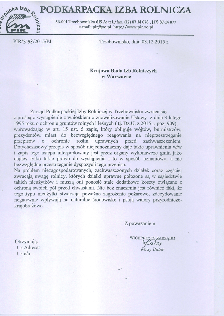 POD KARPACKATZBA ROLN TCZA 36-00lTtzebownisko615A; tel./fax. llTl87 L4078,lnl87.L4 077 e-mail [email protected] http://www.pir.xo.pl PLFJU98 120 l slPJ Trzebownisko, dnia 03.L2.20t5r. Krajowa Rada Izb Rolnicrych w Warszawie Zatzqd PodkarpackiejIzby Rolniczej w Trzebowniskuzwraca sig z proSb4o wystqpienie z wnioskiem o znowelizowanieUstawy z dnia 3 lutego 1995roku o ochroniegrunt6w rolnych i le6nych( tj. Dz.U.22015 r. poz.909), wprowadzajqc w art. 15 ust. 5 zapis, kt6ty obliguje w6jt6w, burmistrz6w, prezydent6w- miast do bezwzglqdnego reagowania na nieprzestrzeganie przepis6w o-, ochronie roSlin uprawnych przed zachwaszczeniem. Dotychczasowyprzepis w spos6bniejednoznacznydaje takie uprawnienia w/w i zapis tego ustqpu interpretowany jest przez organy wykonawcze gmin jako dajqcy tylko takie prawo do wystqpienia i to w spos6b uznaniowy, a nie bezwzglEdneprzestr ze ganiedyspozycji tego przepi su. Na problem n\ezagospodarowanych,zachwaszczonychdzialek coraz czEsciej zwracajq uwagQrolnicy, kt6rych dzialki uprawne polozone sq w sqsiedztwie takich nieu2ytk6w i muszq oni ponosii stale dodatkowe koszty zwiqzane z ochron4 swoich pol przed chwastami.Nie bez znaczeniajest r6wnie2 fakt, 2e tego "typu nieuzytki stwarzajq powazne zagroheniepozarowe, zdecydowanie negatywnie wptywajq na naturalne Srodowiskoi psujq walory przyrodniczokrajobraZowe. Z powahaniem Otrzymuj4: 1 x Adresat txala wrcEPuErnslARzADU u/go,*a/ Jerzy Bator n --.-... .:l:Fi ,_2. rS+\'i'.-,,i;#iz :F*:.;l:;\& ,ry'it,|{i! I "tjqrii::-f\r:. .-r7-Ji! rr , T,J,I't*tcrhr^,rt,'iTl ?*h fi"r^nA4t hr,b*,*J,* I tlt) K"L^,a \-. t:g*.17f::;: MINISTERROLI{ICTWA I ROZWOJUWSI Warszana, 2016- 0l - 0f GZ.rr.}75- 12fi5 Pan Wiktor Szmulewicz PrezesKrajowej Rady Izb Rolniczyclt ul" Wspdlna 30 A0-930 lYarszawn a fir,n Nr41r1o1yC f,-.^p*7 w'zrvi4zkr,rz pismem z dnia 11 grudnia2015 roku. znak:KRIR/JM/135112015, przy kt6rynr zostaloprzekazanewyst4pieniePodkarpackiejIzby Rolniczej zdnia3 grudnia 20L5r. znak: PIR/349812015/PJ rv sprarviepodjEciainicjatywy ustawodarvczej rv celu zmiany ustaw,v z dnia 3 lutego 1995 r. o ochroniegrunt6wrolnych i leSny,'ch (Dz. U. 22015 r. poz.909 z po2n.zm.) i rvproi.vadzenie lv art. 15 ust. 5 przepisu,kt6r;,'zobliguje lv6jt6r.l,(burmistrzdw, prezydent6rvmiast) do bezlvzglEdnego reagolvania,w pl'zypadkunie utrzymywaniagrunt6w roln.v*ch przez ich rvlaScicieli w dobrej kulturze rolnej - przedstaw'iamnastgpuj4ce rvy'jaSnienia W rozr,rmieniu przepisuart. -l pkt. 16 rr,-rv. ustarvyz dnia 3lutego 1995roku o ochronie gruntOlvroluvch i ieSnych grunt,vzdegradowane- to gruntv. kt6r1'-chrolnicza lub lespa wartoSi u2vtkorva zntalala, \\i szczeg6lnoSci ri,-vniku pogorszenia sig rvarunk6rv przytodniczvch albo rvskutek zmiau srodorviskaoraz dzialalnoSciprzemyslor.vej,a takZe wadliwej dzialalnoScirolniczej. Zachrvaszczenie grunt6w' o kt6ryrn mowa w nadestanym piSnriePodkarpackiejlzby Rolniczejz dnia 3 gruclnia2015 r. znak: PIR/34g8/2015/PJ jest i.r'adlirv4dzialalnoSirolnicz4. Zaprzestaniestosowaniaprzezrolnika jakichkolwiek zabieg6wtrprawow)'ch.bezsporniebow.iernprzycz"vniasig do zapoczEtkorvania proces6wdegradacji grunt6"v.Iv{aj4cna urvadzervrv. sytuacje.lv zrvi4zku z'uchyleniem oborvi4zuj4cychprzed 'nvejSciemw Zycie tej ustawy' przepisrii.vdotycz4cych kontroli obor,viqzkurolniczego wvkorzystaniagrunt6r,r'.ustalvodawcawprowadzil przepis art. 15 ust. I omawianejustawy kt6ry wyra2nie wskazuje,ze: LYlaicicielgruntdw stanowiqcychuzytki rolne oraz grunt6w zrekultyu,sv,anychna cele rolne.iest obowiqzanydo przeciu,dzialaniadegradacji gleb, w tym szczeg6lnieerozji i ruchom masowymziemi. Uzycie przez ustawodawcAsformulowania.,w szczeg6lnoSci"nie oznaczakatalogu zamknigtego.ograniczonegowylEczniedo proces6rv erozji i ruclr6w masowychziemi. Wadliwie prowadzonadzialalnoSirolnicza, a zwLaszcza calkowite i dlugotrw'alezaniechaniewykonywaniajakichkolwiek zabieg6wagrotechnicznych przezuLT,tkow'nika grunt6wjest niew'4tplirviedziatalnoSci4 powoduj4c4degradacjggrunt6w z winy wlaSciciela.W takirn przypadku,ma zastosow-anie przepis arl. 15 ust. 5 w/w ustawy, zgodniez kt6rym: IV razie u;yslrlpieniuzu,inyu,laiciciela innych.formdegradacjigr"untdu,.o ktrirl'ch tnov'e 11'ust. I, v' lllut r6v'niez sprnt,odou'ctnej nieprzestrzeganient przepis|w o ochronie roilin upruv,nychprzetl chorobumi, szkodnikami i chwastcuni,u,rjjt, tv drodze deqtTji, nakuzu.iev'luicic'ielov'i grunltitr v'ykonanieu, okreilonym tenninie odpou,iednich zabieg6v'. W razie niswykononiu dec:yzjitt,ri.1't zleca v,ykonaniezastgpczetych zabieg|v, nct koszt v,lulciciela gt'unt6w, vtykorzysluiqcdo czesLtn4)rotu kosztdw u,ykonania zastgpczego irodki budzetu,!o.ie\4'6dzhva. o kt6r);chmov,aut ort. 22b ust.I. Z przepisutego wynika wigc, ze ustar,vodilvcaprzervidzial taK4 sytuacjq,w' kt6rej w6jt (burmistrz. prezydent miasta) zabowiEzanyjest r,r.ydaidecyzjeadministracyjnq* w przypadku,gdy wyst4pily inne formy degradacjigrunt6w riL erozjab4dz ruchy masoweziemi. Organ wydaj4cy decyzjgpow-inien nakazacrvykonanieodpowiednichzabieg6wi okreslenieterminu ich wykonania.Od decyzji tej wlaScicielowiprzyslugujeodu'olaniedo samorz4dowego kolegium odwolawczego,a decyzja ostateczna mo2e byi zaskar2onado w.ojew6dzkiegos4du administracyjnego. Podobnestanowiskoprzedstar.vil Wojerv6dzkiS4dAdministracyjnyw Bydgoszczyw wyroku z dnia 13 sierpnia2013roku. s-v''gn. akt: II SAiBd 355/13.w kt6rym stwierdzil,Zei'Trafnie sltriet'tlzi!1'orgun))oltrztinslmtc'ji- hrak ochronl, grurttt.tltrzed chwasfcrmijestjednq z .fornt nakuzriwokrellon.vchw przepisie art. l5 ust.5 cy,t. .iego dcgrctdacjii uzasaclniu,.slo.sottunie tt.t'lcttt')t. Zu lakc1fu'alifikac:iqprzem6tiut rnoze v, szczeg6lnoicitreic u,yzej v'skctzanego przepistrurl. I5 ust.5 cvl. uslcnt'1', v' k!6rvntpr4nroluje sig naruszenieprzepisdv,dot)'czqq,ch ochronv roilin przecl chu'ctstcttni.iako.jeclen z roclzuffu' tlegradac.iig'rmtu. Wskazatnalezy,ze ttct moc|' cu't. I5 omav:ictnejusta\:y obov'iqzekzapobieguniadegrctclacjigruntu ciqiy na wIa.kicieIu gruttIu." Dltrgotrwalezachrasz-czenie grunt6w powo