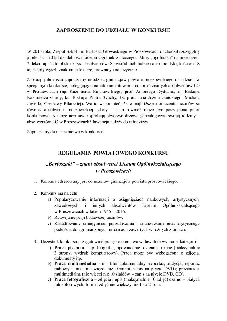 ZAPROSZENIE DO UDZIAŁU W KONKURSIE W 2015 roku Zespół Szkół im. Bartosza Głowackiego w Proszowicach obchodził szczególny jubileusz – 70 lat działalności Liceum Ogólnokształcącego. Mury „ogólniaka” na przestrzeni 7 dekad opuściło blisko 5 tys. absolwentów. Są wśród nich ludzie nauki, polityki, kościoła. Z tej szkoły wyszli znakomici lekarze, prawnicy i nauczyciele. Z okazji jubileuszu zapraszamy młodzież gimnazjów powiatu proszowickiego do udziału w specjalnym konkursie, polegającym na udokumentowaniu dokonań znanych absolwentów LO w Proszowicach (np. Kazimierza Bujakowskiego, prof. Antoniego Dyducha, ks. Biskupa Kazimierza Gurdy, ks. Biskupa Piotra Skuchy, ks. prof. Jana Józefa Janickiego, Michała Jagiełło, Czesławy Pilarskiej). Warto wspomnieć, że w najbliższym otoczeniu uczniów są również absolwenci proszowickiej szkoły – i im również może być poświęcona praca konkursowa. A może uczniowie spróbują stworzyć drzewo genealogiczne swojej rodziny – absolwentów LO w Proszowicach? Inwencja należy do młodzieży. Zapraszamy do uczestnictwa w konkursie. REGULAMIN POWIATOWEGO KONKURSU „Bartoszaki” – znani absolwenci Liceum Ogólnokształcącego w Proszowicach 1. Konkurs adresowany jest do uczniów gimnazjów powiatu proszowickiego. 2. Konkurs ma na celu: a) Popularyzowanie informacji o osiągnięciach naukowych, artystycznych, zawodowych i innych absolwentów Liceum Ogólnokształcącego w Proszowicach w latach 1945 – 2016. b) Rozwijanie pasji badawczej uczniów. c) Kształtowanie umiejętności poszukiwania i analizowania oraz krytycznego podejścia do zgromadzonych informacji zawartych w różnych źródłach. 3. Uczestnik konkursu przygotowuje pracę konkursową w dowolnie wybranej kategorii: a) Praca pisemna - np. biografia, opowiadanie, dziennik i inne (maksymalnie 3 strony, wydruk komputerowy). Praca może być wzbogacona o zdjęcia, dokumenty itp. b) Praca multimedialna - np. film dokumentalny -reportaż, audycja; reportaż radiowy i inne (nie więcej niż 10minut, zapis na płycie DVD); prezentacja multimedialna (nie więcej niż 10 slajdów - zapis na płycie DVD, CD). c) Praca fotograficzna – zdjęcia i opis (maksymalnie 10 zdjęć) czarno – białych lub kolorowych; format zdjęć nie większy niż 15 x 21 cm. 4. Prace należy złożyć w sekretariacie szkoły lub przesłać pocztą na adres: Zespół Szkół im. Bartosza Głowackiego ul. 3 Maja 107 32-100 Proszowice z dopiskiem „Konkurs - Absolwent” w nieprzekraczalnym terminie – 30 marca 2016 r. 5. Do pracy należy dołączyć metryczkę z informacją o autorze pracy: imię i nazwisko, klasa, szkoła, nazwisko nauczyciela opiekuna. 6. Autorzy 3 najlepszych prac w każdej kategorii otrzymają dyplomy i nagrody rzeczowe. 7. Wręczenie nagród nastąpi 4 kwietnia 2016 r. podczas obchodów Święta Szkoły.