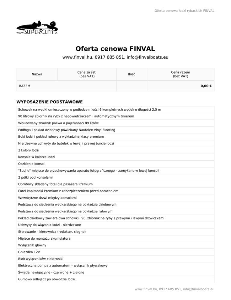 Oferta cenowa łodzi rybackich FINVAL Oferta cenowa FINVAL www.finval.hu, 0917 685 851, [email protected] Nazwa Cena za szt. (bez VAT) Ilość RAZEM Cena razem (bez VAT) 0,00 € WYPOSAŻENIE PODSTAWOWE Schowek na wędki umieszczony w podłodze mieści 6 kompletnych wędek o długości 2,5 m 90 litrowy zbiornik na ryby z napowietrzaczem i automatycznym timerem Wbudowany zbiornik paliwa o pojemności 89 litrów Podłoga i pokład dziobowy powlekany Nautolex Vinyl Flooring Boki łodzi i pokład rufowy z wykładziną klasy premium Nierdzewne uchwyty do butelek w lewej i prawej burcie łodzi 2 kolory łodzi Konsole w kolorze łodzi Oszklenie konsol "Suche" miejsce do przechowywania aparatu fotograficznego – zamykane w lewej konsoli 2 półki pod konsolami Obrotowy składany fotel dla pasażera Premium Fotel kapitański Premium z zabezpieczeniem przed obracaniem Wewnętrzne drzwi między konsolami Podstawa do siedzenia wędkarskiego na pokładzie dziobowym Podstawa do siedzenia wędkarskiego na pokładzie rufowym Pokład dziobowy zawiera dwa schowki i 90l zbiornik na ryby z prawymi i lewymi drzwiczkami Uchwyty do wiązania łodzi - nierdzewne Sterowanie – kierownica (reduktor, cięgno) Miejsce do montażu akumulatora Wyłącznik główny Gniazdko 12V Blok wyłączników elektroniki Elektryczna pompa z automatem – wyłącznik pływakowy Światła nawigacyjne - czerwone + zielone Gumowy odbijacz po obwodzie łodzi www.finval.hu, 0917 685 851, [email protected] Oferta cenowa łodzi rybackich FINVAL Zdejmowany uchwyt do uprawiania narciarstwa wodnego www.finval.hu, 0917 685 851, [email protected]