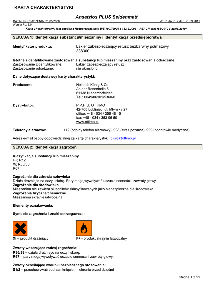 KARTA CHARAKTERYSTYKI Ansatzlos PLUS Seidenmatt DATA SPORZĄDZENIA 21.05.2008 WERSJA PL z dn.: 21.09.2011 Wersja PL: 3.0 Karta Charakterystyki jest zgodna z Rozporządzeniem WE 1907/2006 z 18.12.2006 – REACH oraz453/2010 z 20.05.2010r. SEKCJA 1: Identyfikacja substancji/mieszaniny i identyfikacja przedsiębiorstwa Identyfikator produktu: Lakier zabezpieczający retusz bezbarwny półmatowy 338300 Istotne zidentyfikowane zastosowania substancji lub mieszaniny oraz zastosowania odradzane: Zastosowanie zidentyfikowane: Lakier zabezpieczający retusz Zastosowanie odradzane: nie określono Dane dotyczące dostawcy karty charakterystyki: Producent: Heinrich König & Co. An der Rosenhelle 5 61138 Niederdorfelden Tel.: 0049/06101/5360-0 Dystrybutor: P.P.H.U. OTTIMO 42-700 Lubliniec, ul. Młyńska 27 office: +48 - 034 / 356 48 15 fax: +48 - 034 / 353 06 50 www.ottimo.pl Telefony alarmowe: 112 (ogólny telefon alarmowy), 998 (straż pożarna), 999 (pogotowie medyczne); Adres e-mail osoby odpowiedzialnej za kartę charakterystyki: [email protected] SEKCJA 2: Identyfikacja zagrożeń Klasyfikacja substancji lub mieszaniny F+; R12 Xi; R36/38 R67 Zagrożenie dla zdrowia człowieka Działa drażniąco na oczy i skórę. Pary mogą wywoływać uczucie senności i zawroty głowy. Zagrożenie dla środowiska Mieszanina nie zawiera składników sklasyfikowanych jako niebezpieczne dla środowiska. Zagrożenia fizyczne/chemiczne Mieszanina skrajnie łatwopalna. Elementy oznakowania: Symbole zagrożenia i znaki ostrzegawcze: Xi – produkt drażniący F+ - produkt skrajnie łatwopalny Zwroty wskazujące rodzaj zagrożenia: R36/38 – działa drażniąco na oczy i skórę. R67 – pary mogą wywoływać uczucie senności i zawroty głowy. Zwroty określające warunki bezpiecznego stosowania: S1/2 – przechowywać pod zamknięciem i chronić przed dziećmi Strona 1 z 11 KARTA CHARAKTERYSTYKI Ansatzlos PLUS Seidenmatt DATA SPORZĄDZENIA 21.05.2008 WERSJA PL z dn.: 21.09.2011 Wersja PL: 3.0 Karta Charakterystyki jest zgodna z Rozporządzeniem WE 1907/2006 z 18.12.2006 – REACH oraz453/2010 z 20.05.2010r. S16 – nie przechowywać w pobliżu źródeł zapłonu, nie palić tytoniu S23 – nie wdychać par produktu S26 – zanieczyszczone oczy przemyć natychmiast dużą ilością wody i zasięgnąć porady lekarza S38 - w przypadku niedostatecznej wentylacji stosować odpowiednie indywidualne środki ochrony dróg oddechowych; S45 – w przypadku awarii lub źle się poczujesz, niezwłocznie zasięgnij porady lekarza – jeżeli to możliwe pokaż etykietę. S51 – stosować wyłącznie w dobrze wentylowanych pomieszczeniach Inne informacje: Pojemnik pod ciśnieniem: chronić przed słońcem i nagrzaniem powyżej temperatury 50 °C. Nie przekłuwa ć ani nie spalać, także po zużyciu. Nie przechowywać w pobliżu źródeł zapłonu - nie palić tytoniu. Chronić przed dziećmi. Nie rozpylać nad otwartym płomieniem lub żarzącym się materiałem. Inne zagrożenia: Brak informacji na temat spełnienia kryteriów PBT lub vPvB zgodnie z załącznikiem XIII rozporządzenia REACH. SEKCJA 3: Skład/informacja o składnikach Mieszaniny: Składniki niebezpieczne: Klasyfikacja CLP Identyfikator produktu Octan butylu CAS: 123-84-6 WE: 204-658-1 Nr indeksowy: 607-025-00-1 Nr REACH: substancja podlega przepisom okresu przejściowego Eter dimetylowy CAS: 115-10-6 WE: 204-065-8 Nr indeksowy: 603-019-00-8 Nr REACH: substancja podlega przepisom okresu przejściowego Octan etylu CAS: 141-78-6 WE: 205-500-4 Nr indeksowy: 607-022-00-5 Nr REACH: substancja podlega przepisom okresu przejściowego Alkohol izopropylowy CAS: 67-63-0 WE: 200-661-7 Nr indeksowy: 603-117-00-0 Nr REACH: substancja podlega przepisom okresu przejściowego Butan-1-ol CAS: 71-36-3 WE: 200-751-6 Nr indeksowy: 603-004-00-6 Nr REACH: substancja podlega przepisom okresu przejściowego Zawartość % 25 - 50 Klasyfikacja wg 67/548/EWG R10 R66 R67 25 - 50 F+: R12 F: R11 5 - 10 Xi: R36 R66, R67 F: R11 5 - 10 Xi: R36 R67 R10 2,5 - 5 Klasa zagrożenia i kody kategorii Kody zwrotów wskazujących rodzaj zagrożenia Flam. Liq. 3 STOT SE 3 H226 H336 Flam. Gas 1 Press. Gas H220 Flam. Liq. 2 Eye Irrit. 2 STOT SE 3 H225 H319 H336 Flam. Liq. 2 Eye Irrit. 2 STOT SE 3 H225 H319 H336 Flam. Liq. 3 Acute Tox. 4 STOT SE 3 Xn: R22 Skin Irrit. 2 Xi: R37/38, R41 Eye Dam. 1 STOT SE 3 R67 H226 H302 H335 H315 H318 H336 Strona 2 z 11 KARTA CHARAKTERYSTYKI Ansatzlos PLUS Seidenmatt DATA SPORZĄDZENIA 21.05.2008 WERSJA PL z dn.: 21.09.2011 Wersja PL: 3.0 Karta Charakterystyki jest zgodna z Rozporządzeniem WE 1907/2006 z 18.12.2006 – REACH oraz453/2010 z 20.05.2010r. 1-metoksypropan-2-ol CAS: 107-98-2 WE: 203-539-1 Nr indeksowy: 603-064-00-3 Nr REACH: substancja podlega przepisom okresu przejściowego 2-metylopropan-1-ol CAS: 78-83-1 WE: 201-148-0 Nr indeksowy: 603-108-00-1 Nr REACH: substancja podlega przepisom okresu przejściowego 2,5 - 5 R10 Flam. Liq. 3 H226 2,5 - 5 Flam. Liq. 3 STOT SE 3 Skin Irrit. 2 Xi: R37/38, R41 Eye Dam. 1 R67 STOT SE 3 H226 H335 H315 H318 H336 R10 Pełna treść zwrotów R i H w sekcji 16 SEKCJA 4: Środki pierwszej pomocy Uwagi ogólne: W razie wystąpienia jakichkolwiek niepokojących objawów natychmiast skontaktować się z lekarzem. Nigdy nie podawać niczego doustnie osobie nieprzytomnej W przypadku kontaktu ze skórą: Zdjąć zanieczyszczoną odzież, umyć zabrudzoną skórę wodą z mydłem, spłukać dokładnie wodą, w przypadku pojawienia się podrażnienia, skontaktować się z lekarzem. W przypadku kontaktu z oczami: Przepłukać oczy przez kilkanaście minut (ok. 15) dużą ilością wody, trzymając powieki szeroko rozwarte. Unikać silnego strumienia, ze względu na niebezpieczeństwo uszkodzenia rogówki. W przypadku wystąpienia podrażnienia skonsultować się z lekarzem. Narażenie inhalacyjne: W razie zawrotów głowy lub nudności wyprowadzić poszkodowanego na świeże powietrze, w razie braku szybkiej poprawy zastosować sztuczne