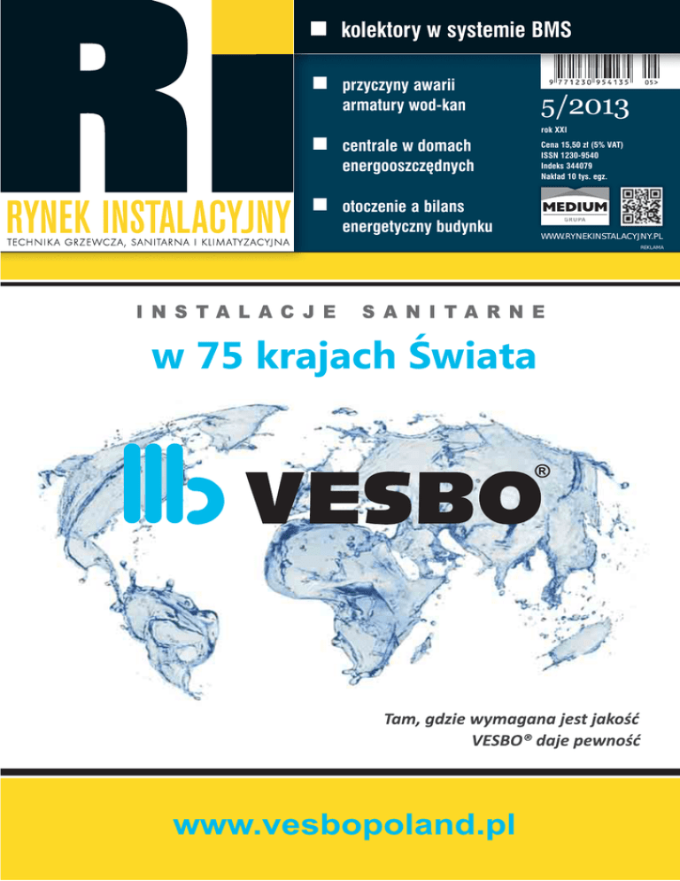 kolektory w systemie BMS przyczyny awarii armatury wod-kan 5/2013 rok XXI centrale w domach energooszczędnych otoczenie a bilans energetyczny budynku Cena 15,50 zł (5% VAT) ISSN 1230-9540 Indeks 344079 Nakład 10 tys. egz. GRUPA WWW.RYNEKINSTALACYJNY.PL REKLAMA © PERFEXIM_PR_05_2013TNKW Perfekcja w kaŋdym calu. W naszym laboratorium armatura instalacyjna PERFEKT System poddawana jest szczegóľowym testom wytrzymaľoŏciowym i materiaľowym. Skrġcamy, wyginamy i testujemy armaturġ w najbardziej ekstremalnych warunkach. Dopieszczanie kaŨdego szczegóľu staľo siġ naszď obsesjď! PERFEKT PERFEK SprawdŦ nas! na www.perfektsystem.pll Dziaġ sprzedaŋy: (+48) 61 830 20 17, fax (+48) 61 222 64 06, e-mail [email protected] Lista dystrybutorów: www.perfektsystem.pl, www.perfexim.com.pl, www.nexeline.pl LAB MIESIĘCZNIK INFORMACYJNO-TECHNICZNY ISSN 1230-9540, nakład 10 000 GRUPA Wydawca Grupa MEDIUM www.medium.media.pl Adres redakcji 04-112 Warszawa, ul. Karczewska 18 tel./faks 22 512 60 75 do 77 e-mail: [email protected] www.rynekinstalacyjny.pl Redaktor naczelny Waldemar Joniec, tel. 517 185 023 [email protected] Sekretarz redakcji Agnieszka Orysiak, tel. 600 050 378 [email protected] Redakcja Jerzy Kosieradzki (red. tematyczny), Aleksandra Cybulska (red. portalu internetowego), Joanna Korpysz-Drzazga (red. językowy), Janina Myckan-Cegłowska (red. statystyczny), Jacek Sawicki (red. tematyczny), Bogusława Wiewiórowska-Paradowska (red. tematyczny) Recenzenci dr hab. inż. Witold Chmielnicki, prof. dr hab. inż. Waldemar Jędral, dr inż. Władysław Kasieczka, dr inż. Jarosław Müller, dr inż. Florian Piechurski, prof. dr hab. inż. Zbigniew Popiołek, prof. dr hab. inż. Władysław Szaflik, dr inż. Grzegorz Ścieranka, dr inż. Kazimierz Wojtas Reklama i marketing tel./faks 22 810 28 14, 512 60 70 Dyrektor biura reklamy i marketingu Joanna Grabek, [email protected] Dyrektor ds. marketingu i sprzedaży Michał Grodzki, [email protected] Kolportaż i prenumerata tel./faks 22 512 60 74, 810 21 24 Specjalista ds. prenumeraty Jerzy Lachowski, [email protected] Prenumerata realizowana przez RUCH S.A. Zamówienia na prenumeratę w wersji papierowej i na e-wydania można składać bezpośrednio na stronie www.prenumerata.ruch.com.pl. Ewentualne pytania prosimy kierować na adres e-mail: [email protected] lub kontaktując się z Telefonicznym Biurem Obsługi Klienta pod numerem: 801 800 803 lub 22 717 59 59 – czynne w godzinach 7.00 – 18.00. Koszt połączenia wg taryfy operatora. Skład, łamanie [email protected] Druk Zakłady Graficzne TAURUS Redakcja zastrzega sobie prawo do adiustacji tekstów i nie zwraca materiałów niezamówionych. Redakcja nie ponosi odpowiedzialności za treść reklam i ogłoszeń, ma też prawo odmówić publikacji bez podania przyczyn. Wszelkie prawa zastrzeżone © by Grupa MEDIUM. Rozpowszechnianie opublikowanych materiałów bez zgody wydawcy jest zabronione. Wersja pierwotna czasopisma – papierowa. Za publikację w „Rynku Instalacyjnym” MNiSW przyznaje jednostkom naukowym 5 punktów. Grupa MEDIUM jest członkiem Izby Wydawców Prasy Od Redaktora Czas kryzysu to czas oszczędzania, ale czy warto oszczędzać, nic nie robiąc i nie wydając, czy nie lepiej inwestować w to, co przyniesie mniejsze wydatki przy zachowaniu tego samego poziomu życia? Może branża instalacyjna powinna upatrywać swoich szans także w okresie, gdy gospodarka nie rozwija się w takim tempie jak wcześniej? Nie powinniśmy jednak oczekiwać, że będzie lepiej, jeśli będą dotacje, tak jak w innych krajach, do nowych domów, do kredytów na nie, do instalacji z odnawialnymi źródłami energii. Wiele państw tak rozregulowało dotacjami swoje rynki budowlane i OZE, że teraz nie bardzo wiedzą, jak wybrnąć z tych kłopotów. Z powodu zapóźnień, tak prawnych, jak i technologicznych, mamy szansę tego uniknąć, a interes ogółu powinien wziąć górę nad korzyściami różnych grup. To ścieranie się interesów widać m.in. przy okazji dyskusji na temat ustawy o OZE. Nie znaczy to jednak, że mamy odrzucić nowe technologie – wręcz przeciwnie, trzeba i warto je wspierać, ale wtedy, gdy przynoszą efekty w praktyce, a nie tylko na deklaracji w karcie produktu, i to sprowadzonego z innego kontynentu. W naszym interesie jest, aby wymagania państwa sponsorującego dane instalacje czy urządzenia były coraz wyższe i służyły konkretnym celom, jakie państwo ma do zrealizowania – bezpieczeństwo energetyczne, obniżenie emisji i zwiększenie efektywności energetycznej. Za ten „sponsoring” płacimy konkretnym odsetkiem z naszych podatków i niech to zostanie wykorzystane dla korzyści ogółu. Budownictwo ma spory potencjał oszczędnościowy, zwłaszcza w starszych budynkach. Nadal trwonimy sporo energii i wody – tym razem przyjrzyjmy się tej ostatniej. W Polsce narzekamy na ceny – płacimy średnio ok. 10 zł za 1 m3 wody, ale są już gminy, gdzie kosztuje ona nawet 20 zł. Niemcy płacą ok. 25 zł za 1 m3. Ceny nie spadną, a na pewno wzrosną – trzeba przecież sfinansować duże inwestycje w sieci kanalizacyjne i oczyszczalnie ścieków, a potem w nietanią eksploatację. Warto zatem wodę oszczędzać. W ramach Światowego Dnia Wody firma Oras sprawdziła, jak korzystamy z wody i czy ją oszczędzamy. Polacy zużywają ok. 93 litrów dziennie na osobę. Rezygnujemy z kąpieli w wannie na rzecz prysznica, montujemy zmywarki do naczyń, do podlewania działek używamy deszczówki. Z badań tych wynika, że potencjał rynku technologii oszczędzania wody jest nadal duży, począwszy od opomiarowania, przez domowe uzdatnianie wody, po ekoprzyciski w wylewkach i toaletach, baterie termostatyczne i bezdotykowe. Z kolei firma Geberit przyjrzała się, jak mieszkańcy kilkunastu krajów podchodzą do higieny osobistej i komfortu. Polacy wysoko cenią sobie komfort i higienę, ale z tych badań wynika także, że nasz rynek ma jeszcze bard