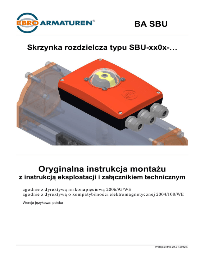 BA SBU Skrzynka rozdzielcza typu SBU-xx0x-… Oryginalna instrukcja montażu z instrukcją eksploatacji i załącznikiem technicznym zgodnie z d yrektywą nis kona pięciową 2006/95/WE zgodnie z d yrektywą o kompatybilnoś ci elektroma gnetyc znej 2004/108/WE Wersja językowa: polska Wersja z dnia 24.01.2012 r. INS TRUKCJ A EKS P LOATACJ I S KRZYNKI ROZDZIELCZEJ TYP U S BU Spis treści Strona A) INFORMACJE OGÓLNE 3 A1 A2 A3 A4 A5 A6 WYJAŚNIENIE SYMBOLI ZASTOSOWANIE ZGODNIE Z PRZEZNACZENIEM OZNAKOWANIE SKRZYNKI ROZDZIELCZEJ ZAMONTOWANE PODZESPOŁY WPROWADZENIA PRZEWODÓW TRANSPORT I SKŁADOWANIE DO DODATKOWEGO WYPOSAŻENIA LUB WYMIANY 3 3 4 4 4 4 B) MONTAŻ I URUCHOMIENIE B1 B2 B3 B4 4 ZASADY BEZPIECZEŃSTWA DOTYCZĄCE URUCHOMIENIA WARUNKI MONTAŻU I DEMONTAŻU OPERACJE ROBOCZE PODCZAS MONTAŻU PIERWSZE URUCHOMIENIE 5 5 5 5 C) INSTRUKCJA EKSPLOATACJI 6 C1 ZASADY BEZPIECZEŃSTWA DOTYCZĄCE EKSPLOATACJI I KONSERWACJI C2 AUTOMATYCZNY TRYB PRACY C3 USUWANIE ZAKŁÓCEŃ 6 6 6 D) ZAŁĄCZNIK TECHNICZNY, DOKUMENTACJA PROJEKTOWA 7 D1 D2 D3 D4 7 7 7 7 SPECYFIKACJA TECHNICZNA SKRZYNKI ROZDZIELCZEJ SCHEMAT ZACISKÓW ARKUSZE DANYCH TYPOWYCH SYGNALIZATORÓW POŁOŻENIA RYSUNKI WYMIAROWE DEKLARACJA ZGODNIE Z DYREKTYWAMI WE 8 Dodatkowe informacje oraz aktualne adresy naszych oddziałów i partnerów handlowych można znaleźć na stronie: www.ebro-armaturen.com EBRO ARMATUREN GmbH Karlstraße 8 D-58135 Hagen (02331) 904-0 Faks (02331) 904-111 Strona 2 INS TRUKCJ A EKS P LOATACJ I S KRZYNKI ROZDZIELCZEJ TYP U S BU A) Informacje ogólne A1 Wyjaśnienie symboli W niniejszej instrukcji odpowiednie wskazówki zostały oznakowane symbolami: xxxxx Zagrożenie / Ostrożnie / Ostrzeżenie ... informuje o grożącym niebezpieczeństwie, które w razie nieuniknięcia może spowodować śmierć lub poważne obrażenia osób bądź uszkodzenia systemów rurowych. Uwaga … informuje o instrukcji, których należy bezwzględnie przestrzegać. Informacja … zawiera pożyteczne rady i zalecenia Nieprzestrzeganie wskazówek, ostrzeżeń i uwag może doprowadzić do zagrożenia oraz unieważnić gwarancję producenta. A2 Zastosowanie zgodnie z przeznaczeniem Skrzynka rozdzielcza typu SBU jest stosowana w połączeniu z pneumatycznymi obrotowymi napędami armatur. Po zamontowaniu na armaturze służy ona do rejestracji sygnału stanu „otwarta / zamknięta”. Skrzynka rozdzielcza jest wyposażona w czujniki bezdotykowe oraz mechaniczne wyłączniki krańcowe zgodnie z wymaganiami zamawiającego – schematy połączeń typowych sygnalizatorów położenia patrz załącznik D2. Do podłączania przyłączeniowe. cewki zaworu elektromagnetycznego Opcjonalnie możliwe są zaciski przyłączeniowe do elektromagnetycznego oraz trzeciego czujnika położenia. przewidziane podłączenia są odpowiednie drugiej cewki zaciski zaworu Skrzynki rozdzielcze i jej elementy spełniają wymagania obowiązujących norm EN 60947-5-2 i EN 60947-5-6. Patrz D1 Mechaniczne dopasowanie do napędu pneumatycznego następuje bezpośrednio w złączu regulatorów położenia i sygnalizatorów zgodnie z VDI/VDE 3845, przy czym stosowany jest schemat otworów 80 x30 mm i wysokość wału 30 mm (∅maks. 30 mm). Do montażu w innych przypadkach dostępne są zestawy montażowe zgodnie z VDI/VDE 3845 o różnych wymiarach konsoli – patrz arkusz wymiarów w załączniku D3. Skrzynka rozdzielcza może zostać uruchomiona dopiero po uwzględnieniu wymagań następujących dokumentów: • <Deklaracja producenta dotycząca dyrektyw WE>, • niniejsza instrukcja montażu i eksploatacji, objęta zakresem dostawy. Użytkowanie skrzynki rozdzielczej w otoczeniu zagrożonym wybuchem ( ) jest niedopuszczalne. Nieprzestrzeganie <Zastosowania zgodnie z przeznaczeniem> stanowi rażącą niedbałość i zwalnia producenta – firmę EBRO-ARMATUREN – z odpowiedzialności za produkt. Strona 3 INS TRUKCJ A EKS P LOATACJ I S KRZYNKI ROZDZIELCZEJ TYP U S BU A3 Oznakowanie skrzynki rozdzielczej Na każdej skrzynce rozdzielczej umieszczone są następujące dane, albo bezpośrednio na obudowie, albo na tabliczce znamionowej: Do Oznaczenie Uwagi EBRO ARMATUREN Producent Adres patrz strona 2 <dodatkowe informacje> Typ armatury np. (oznakowanie na obudowie) patrz przegląd SBU-M203-K211-M01 w rozdziale D3 CE Zgodność Zgodność z dyrektywą maszynową 2006/42/WE np. IP67 Zabezpieczenie Stopień ochrony elektrycznego środka produkcji IP Dop. temperatura T (i wartość liczbowa) Wartości liczbowe granic zastosowania U (i wartość liczbowa) Wartości liczbowe granic zastosowania dop. U I (i wartość liczbowa) Wartości liczbowe górnej granicy zastosowania maks. dop. I Nr art. np. 4182647 Nr artykułu EBRO Tabliczka znamionowa nie może być zasłaniana, aby zapewnić identyfikowalność zamontowanej skrzynki rozdzielczej. A4 Zamontowane podzespoły Skrzynka rozdzielcza jest wyposażona w czujniki położenia zgodnie z wymaganiami zamawiającego. Uzupełnienie wyposażenia skrzynki rozdzielczej jest dozwolone wyłącznie po uzgodnieniu z producentem. Należy przestrzegać instrukcji montażu oraz zasad bezpieczeństwa, podanych przez producentów poszczególnych podzespołów. A5 Wprowadzenia przewodów Przy podłączaniu kabli i przewodów do środków produkcji należy używać przepustów, dopasowanych do odpowiednich typów kabli i przewodów. Muszą one zawierać odpowiedni element uszczelniający, aby zapewnić co najmniej stopień ochrony układu sterowania, równy IP 67. Metaliczne przepusty przewodów muszą być połączone z układem uziemienia. Nieużywane otwory wprowadzenia przewodów muszą być zamknięte zatyczkami. A6 Transport i składowanie do dodatkowego wyposażenia lub wymiany Podczas transportu i składowania skrzynka rozdzielcza powinna pozostawać w opakowaniu producenta. Należy ją rozpakować dopiero bezpośrednio przed zamontowaniem na pneumatycznym napędzie obrotowym. B) Montaż i uruchomienie Niniejsza instrukcja zawiera zasady b