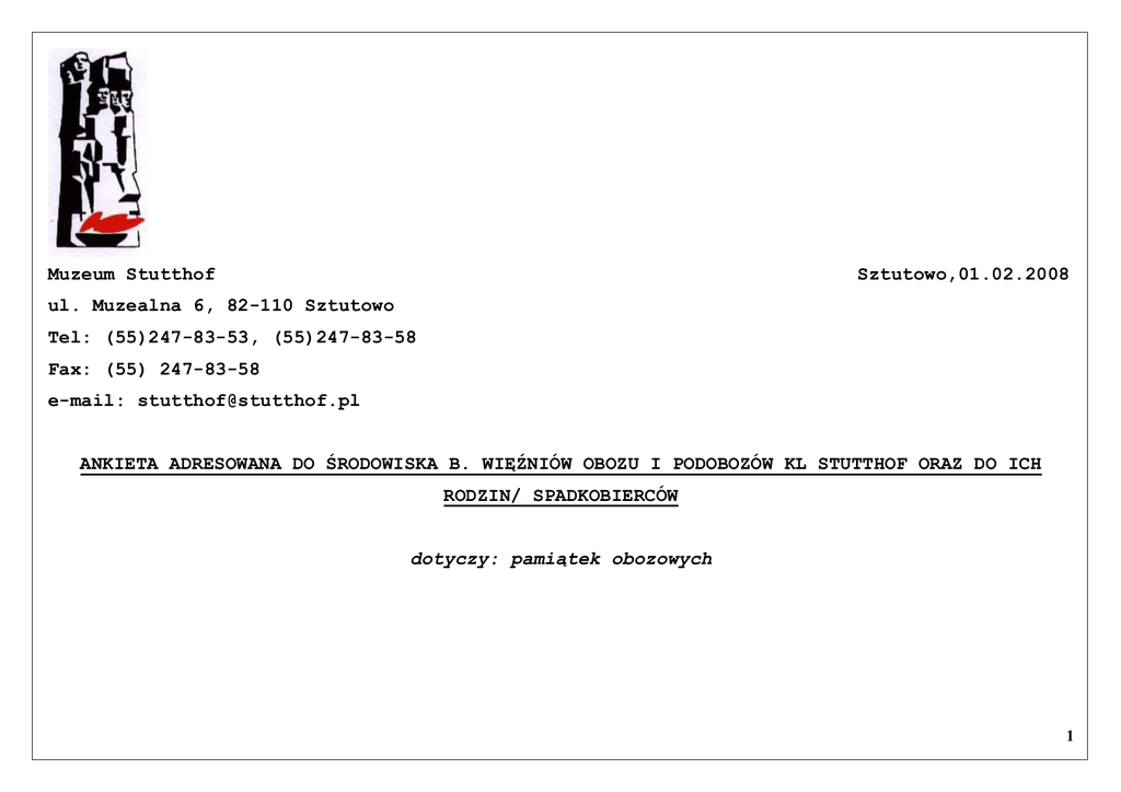 Muzeum Stutthof Sztutowo,01.02.2008 ul. Muzealna 6, 82-110 Sztutowo Tel: (55)247-83-53, (55)247-83-58 Fax: (55) 247-83-58 e-mail: [email protected] ANKIETA ADRESOWANA DO ŚRODOWISKA B. WIĘŹNIÓW OBOZU I PODOBOZÓW KL STUTTHOF ORAZ DO ICH RODZIN/ SPADKOBIERCÓW dotyczy: pamiątek obozowych 1 Szanowni Państwo! Uzyskane dane od Państwa są dla nas bardzo ważne; będą wykorzystane tylko przez Muzeum Stutthof. Przed przystąpieniem do udzielenia odpowiedzi prosimy najpierw przeczytać całą ankietę, odpowiedzi. aby Możliwe zorientować jest się wybranie we kilku wszystkich odpowiedzi możliwościach na dane udzielenia pytanie. Wybrać należy odpowiedź poprzez zaznaczenia krzyżykiem odpowiedniego kwadracika. Wypełnioną ankietę prosimy odesłać w załączonej kopercie. W ankiecie pod słowem „pamiątki obozowe” należy rozumieć całą materialną spuściznę obozową, w tym dokumenty. Bardzo dziękujemy za poświecenie czasu na wypełnienie ankiety! 2 METRYCZKA DLA WYPEŁNIAJĄCEGO ANKIETĘ: JAKO B. WIĘZIEŃ KL STUTTHOF I/ LUB JEGO PODOBOZÓW Nazwisko i imię (w obozie) Nazwisko i imię (po wojnie) Pseudonimy Używane nazwiska fałszywe Data i miejsce urodzenia Data i miejsce aresztowania Pobyt w więzieniach, gettach, obozach Numer obozowy w KL STUTTHOF Data zwolnienia z obozu(jeśli dotyczy) Kiedy i gdzie wyzwolony Adres/ telefon kontaktowy Uwagi 3 JAKO OSOBA SPOKREWNIONA/SPADKOBIERCA B.WIĘŹNIA KL STUTTHOF I/ LUB JEGO PODOBOZÓW Własne nazwisko i imię Stopień pokrewieństwa Adres/ telefon kontaktowy: Dane dotyczące b.więźnia: Nazwisko i imię (w obozie) Nazwisko i imię (po wojnie) Pseudonimy Używane nazwiska fałszywe Data i miejsce urodzenia Data i miejsce aresztowania Pobyt w więzieniach, gettach, obozach Numer obozowy w KL STUTTHOF Data zwolnienia z obozu (jeśli dotyczy) Kiedy i gdzie wyzwolony Data śmierci (jeśli dotyczy) Miejsce śmierci (jeśli dotyczy) Uwagi 4 I) Posiadam: I.1 własne pamiątki obozowe z KL Stutthof i/ lub jego podobozów. I.2 własne pamiątki z innych obozów koncentracyjnych. I.3 pamiątki po więźniu/więźniarce z z KL Stutthof i/ lub jego podobozów. I.4 pamiątki po więźniu/więźniarce z innych obozów koncentracyjnych. I.5 nie dotyczy → przejdź do punktu III. II) Zamierzam: II.1 przekazać pamiątki obozowe Muzeum Stutthof. II.2 przekazać pamiątki obozowe innym instytucjom. (jakim?)................................................................................................ ....................................................................................................... II.3 przekazać pamiątki obozowe rodzinie/ spadkobiercom/znajomym (prosimy podać imię i nazwisko oraz kontakt z daną osobą) ........................................................................................................ ........................................................................................................ Jeśli tak - proszę podać kiedy?:...................... II.4 nie dotyczy → przejdź do punktu III. 5 III) Nie posiadam już pamiątek obozowych, gdyż: III.1 A B C Własne pamiątki obozowe z KL Stutthof i/ lub jego podobozów przekazałem: Muzeum Stutthof. innym instytucjom:(nazwa)...................................................................... rodzinie/spadkobiercom/ znajomym (stopień pokrewieństwa, imię, nazwisko, kontakt).......................................................................................... D inne, jakie?................................................................................... Jeśli tak - proszę podać, kiedy to było?:...................... III.2 Własne pamiątki z innych obozów przekazałem: A Muzeum Stutthof. B innym instytucjom:(nazwa)...................................................................... C rodzinie/spadkobiercom/ znajomym (stopień pokrewieństwa, imię, nazwisko, kontakt).......................................................................................... D inne, jakie?................................................................................... Jeśli tak proszę - podać, kiedy to było?:........................................... 6 III.3 Pamiątki po więźniach z KL Stutthof lub jego podobozów przekazałem: A Muzeum Stutthof. B innym instytucjom:(nazwa)...................................................................... C rodzinie/spadkobiercom/ znajomym (stopień pokrewieństwa, imię, nazwisko, kontakt)........................................................................................ D inne, jakie?................................................................................... Jeśli tak - proszę podać, kiedy to było?:......................................... III.4 Pamiątki po innych więźniach z innych obozów przekazałem: A Muzeum Stutthof. B innym instytucjom:(nazwa)...................................................................... C rodzinie/spadkobiercom/ znajomym (stopień pokrewieństwa, imię, nazwisko, kontakt)........................................................................................ D inne, jakie?.................................................................................. Jeśli tak – proszę podać, kiedy to było?:..................... 7 IV) Pamiątki poobozowe, jakie posiadam/posiadałem, można zaliczyć do grupy: P P O O S S I U I I L W A A D D O A A A Ś G M Ł Ć I KATEGORIA PAMIĄTEK E M Tekstylia (pasiaki i ubrania cywilne, więźniarskie numery obozowe) Obuwie Przedmioty przywiezione przez więźniów do obozu Przedmioty związane z funkcjonowaniem obozu/pracą Spisane modlitwy Przedmioty kultu religijnego (poza modlitwami) Wiersze obozowe Kartki świąteczne Portret obozowy własny Portret obozowy innego więźnia Rysunki obozowe Inne przedmioty sztuki obozowej 8 Listy z obozu Listy do obozu Grypsy obozowe Dokumenty obozowe Inne, jakie?.............................................................................. ............................................
