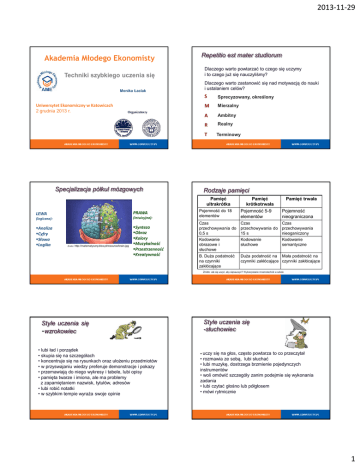 2013-11-29 Repetitio est mater studiorum Akademia Młodego Ekonomisty Dlaczego warto powtarzać to czego się uczymy i to czego już się nauczyliśmy? Techniki szybkiego uczenia się Dlaczego warto zastanowić się nad motywacją do nauki i ustalaniem celów? Monika Łaciak Uniwersytet Ekonomiczny w Katowicach 2 grudnia 2013 r. S Sprecyzowany, określony M Mierzalny A Ambitny R Realny T Terminowy 1 Specjalizacja półkul mózgowych 2 Rodzaje pamięci Pamięć ultrakrótka PRAWA LEWA (logiczna): (intuicyjna): Analiza Cyfry Słowa Logika Synteza Obraz Kolory Muzykalność Przestrzenność Kreatywność Źródło: http://matematyczny.blox.pl/resource/brain.jpg Pojemność do 18 elementów Pamięć krótkotrwała Pojemność 5-9 elementów Pamięć trwała Pojemność nieograniczona Czas przechowywania do 0,5 s Czas przechowywania do 15 s Czas przechowywania nieoganiczony Kodowanie obrazowe i słuchowe Kodowanie słuchowe Kodowanie semantyczne B. Duża podatność na czynniki zakłócające Duża podatność na Mała podatność na czynniki zakłócające czynniki zakłócające Źródło: Jak się uczyć, aby sięnauczyć? Wykorzystanie mnemotechnik w szkole 3 4 Style uczenia się -słuchowiec Style uczenia się -wzrokowiec • lubi ład i porządek • skupia się na szczegółach • koncentruje się na rysunkach oraz ułożeniu przedmiotów • w przyswajaniu wiedzy preferuje demonstracje i pokazy • przemawiają do niego wykresy i tabele, lubi opisy • pamięta twarze i imiona, ale ma problemy z zapamiętaniem nazwisk, tytułów, adresów • lubi robić notatki • w szybkim tempie wyraża swoje opinie • uczy się na głos, często powtarza to co przeczytał • rozmawia ze sobą, lubi słuchać • lubi muzykę, dostrzega brzmienie pojedynczych instrumentów • woli omówić szczegóły zanim podejmie się wykonania zadania • lubi czytać głośno lub półgłosem • mówi rytmicznie 5 6 1 2013-11-29 Style uczenia się - kinestetyk Eksploracja • wiedzę przyswaja przez bezpośrednie doświadczanie • lubi okazywać i interpretować emocje, • wykonuje czynności w ruchu, często jest zaangażowany • dobrze pamięta rzeczy wykonane samodzielnie • nudzi go monotonia • w przekazie często gestykuluje, nie lubi słuchać długich wywodów • mówi powoli • preferuje prace praktyczne • lubi projekty • chętnie pracuje w zespołach, jest aktywny Twórczość eksploracyjna – tzw. myślenie pytajne Wszelkie procesy poznawcze związane z czynnościami dostrzegania, formułowania, reformułowania pytań problemowych wynikających z zaciekawienia i wywołanych przez sytuację problemową o charakterze: intelektualnym, emocjonalnym lub praktycznym 7 8 Kombinacja Transformacja Dzięki działaniom ”kombinowania” powstają nowe idee poprzez łączenie/kojarzenie starych pomysłów w nowy sposób- ten sposób twórczego myślenia wymaga szerokiej wiedzy i obszernych informacji w danym zakresie tematycznym. Jest to proces przemiany, przekształcenie jednej rzeczy lub stanu w inną rzecz lub stan. Przeobrażenie to ma prowadzić do czegoś innego, niż było do tej pory. Transformacja polega na umysłowym zmienianiu wszystkich lub niektórych cech obiektu, tak aby jego końcowa postać różniła się znacznie od obiektu wyjściowego. 9 10 Warunki sprzyjające uczeniu się Kreatywność a uczenie się • wpływa na elastyczny dobór i zastosowanie technik uczenia się • wpływa na spójny rozwój obu półkul mózgowych • wpływa na potrzebę poznawania, doświadczania i zdobywania wiedzy • wspomaga koncentrację zewnętrzne •Porządek •Światło •Muzyka •Przybory •Gotowość do relaksacji •Odpowiednie przerwy •Ruch wewnętrzne •Nastawienie i przekonania •Motywacja •Świadomość zastosowania w praktyce zdobytej wiedzy •Nauka jako wartość •Rozgrzewki pamięciowe 11 12 2 2013-11-29 Metody wspomagające uczenie się Metody wspomagające uczenie się Analfabeta przyszłości nie będzie osobą, która nie potrafi czytać. Będzie to osoba, która nie wie jak się uczyć. - Alvin Tofler • łańcuchowa metoda skojarzeń PAMIĘĆ = OBRAZ + AKCJA Dynamiczny Kolorowy Śmieszny Pozytywny Przesadny, absurdalny Łączenie w ogniwa dwóch wyrazów, które często nie są ze sobą kojarzone, a dzięki nowemu połączeniu tworzą żywy obraz • mapy myślowe szczególnie wskazane dla wzrokowców, dzięki dobrze rozrysowanym powiązaniom tworzą całość. Często wystarczy jeden rzut oka by przypomnieć sobie całą treść. 13 Metody wspomagające uczenie się Lista zakupów OWOCE Jabłka Mandarynki Banany NABIAŁ Jogurty truskawkowe Kefir Mleko Ser biały 14 Metody wspomagające uczenie się • rzymski pokój lokowanie treści w terenie , wybieramy przestrzeń po której poruszamy się podczas nauki. W różnych miejscach lokujemy pojęcia, treści, trudne nazwy, których chcemy się nauczyć. • grupowanie porządkowanie treści w kategorie (szufladkowanie), szczególnie pomocne w uczeniu się pojęć i nazw branżowych oraz języków obcych. PRZYKŁAD na szafie jest mitochondrium, a obok lustra jest antenat zaraz pod lustrem znajduje się scheda, a przy fotelu autochton. Pokonując wyznaczoną trasę uczymy się wyrazów. WARZYWA Marchewki 15 Metody wspomagające uczenie się 16 Metody wspomagające uczenie się •Technika haka (wieszaka) - czyli zakładki obrazkowe Polega na odpowiedniej organizacji przyswajanego materiału. Technika ta wykorzystywana jest do zapamiętywania informacji w ściśle określonej kolejności. • technika słów zastępczych Metoda ta wykorzystywana jest do nauki trudnych długich wyrazów, także pochodzących z języka obcego. Wyraz dzielimy na kilka część, a pojedyncze części mogą podlegać skojarzeniom lub przekształceniom graficznym. Zwykle poszczególne części wyrazu zamieniamy na obrazy, a następnie łączymy je w łańcuch. Aby ją wykorzystać dobieramy słowa haki do, których dokładamy infor