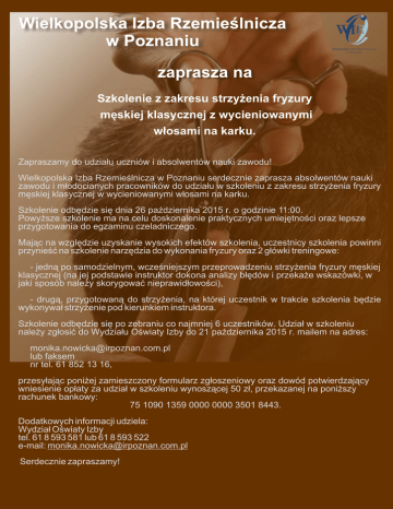 Szkolenie z zakresu strzy¿enia fryzury mêskiej klasycznej z wycieniowanymi w³osami na karku. Zapraszamy do udzia³u uczniów i absolwentów nauki zawodu! Wielkopolska Izba Rzemieœlnicza w Poznaniu serdecznie zaprasza absolwentów nauki zawodu i m³odocianych pracowników do udzia³u w szkoleniu z zakresu strzy¿enia fryzury mêskiej klasycznej w wycieniowanymi w³osami na karku. Szkolenie odbêdzie siê dnia 26 paŸdziernika 2015 r. o godzinie 11:00. Powy¿sze szkolenie ma na celu doskonalenie praktycznych umiejêtnoœci oraz lepsze przygotowania do egzaminu czeladniczego. Maj¹c na wzglêdzie uzyskanie wysokich efektów szkolenia, uczestnicy szkolenia powinni przynieœæ na szkolenie narzêdzia do wykonania fryzury oraz 2 g³ówki treningowe: - jedn¹ po samodzielnym, wczeœniejszym przeprowadzeniu strzy¿enia fryzury mêskiej klasycznej (na jej podstawie instruktor dokona analizy b³êdów i przeka¿e wskazówki, w jaki sposób nale¿y skorygowaæ nieprawid³owoœci), - drug¹, przygotowan¹ do strzy¿enia, na której uczestnik w trakcie szkolenia bêdzie wykonywa³ strzy¿enie pod kierunkiem instruktora. Szkolenie odbêdzie siê po zebraniu co najmniej 6 uczestników. Udzia³ w szkoleniu nale¿y zg³osiæ do Wydzia³u Oœwiaty Izby do 21 paŸdziernika 2015 r. mailem na adres: [email protected] lub faksem nr tel. 61 852 13 16, przesy³aj¹c poni¿ej zamieszczony formularz zg³oszeniowy oraz dowód potwierdzaj¹cy wniesienie op³aty za udzia³ w szkoleniu wynosz¹cej 50 z³, przekazanej na poni¿szy rachunek bankowy: 75 1090 1359 0000 0000 3501 8443. Dodatkowych informacji udziela: Wydzia³ Oœwiaty Izby tel. 61 8 593 581 lub 61 8 593 522 e-mail: [email protected] Serdecznie zapraszamy!