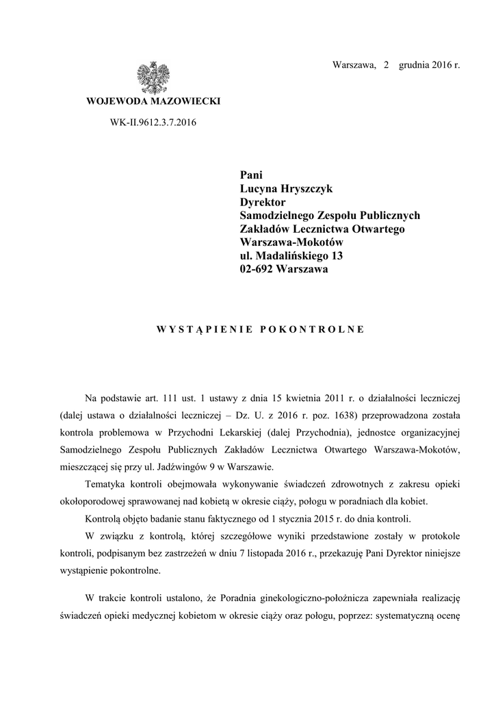 Warszawa, 2 grudnia 2016 r. WOJEWODA MAZOWIECKI WK-II.9612.3.7.2016 Pani Lucyna Hryszczyk Dyrektor Samodzielnego Zespołu Publicznych Zakładów Lecznictwa Otwartego Warszawa-Mokotów ul. Madalińskiego 13 02-692 Warszawa WYSTĄPIENIE POKONTROLNE Na podstawie art. 111 ust. 1 ustawy z dnia 15 kwietnia 2011 r. o działalności leczniczej (dalej ustawa o działalności leczniczej – Dz. U. z 2016 r. poz. 1638) przeprowadzona została kontrola problemowa w Przychodni Lekarskiej (dalej Przychodnia), jednostce organizacyjnej Samodzielnego Zespołu Publicznych Zakładów Lecznictwa Otwartego Warszawa-Mokotów, mieszczącej się przy ul. Jadźwingów 9 w Warszawie. Tematyka kontroli obejmowała wykonywanie świadczeń zdrowotnych z zakresu opieki okołoporodowej sprawowanej nad kobietą w okresie ciąży, połogu w poradniach dla kobiet. Kontrolą objęto badanie stanu faktycznego od 1 stycznia 2015 r. do dnia kontroli. W związku z kontrolą, której szczegółowe wyniki przedstawione zostały w protokole kontroli, podpisanym bez zastrzeżeń w dniu 7 listopada 2016 r., przekazuję Pani Dyrektor niniejsze wystąpienie pokontrolne. W trakcie kontroli ustalono, że Poradnia ginekologiczno-położnicza zapewniała realizację świadczeń opieki medycznej kobietom w okresie ciąży oraz połogu, poprzez: systematyczną ocenę stanu zdrowia ciężarnych kobiet oraz płodu, kierowanie na specjalistyczne konsultacje lekarskie, identyfikację czynników ryzyka okołoporodowego, propagowanie zdrowego stylu życia, praktyczne i teoretyczne przygotowanie do porodu, połogu, karmienia piersią oraz rodzicielstwa, a także wykonywanie badań kontrolnych w okresie połogu, zgodnie z wymogami określonymi w rozporządzeniu Ministra Zdrowia z dnia 20 września 2012 r. w sprawie standardów postępowania medycznego przy udzielaniu świadczeń zdrowotnych z zakresu opieki okołoporodowej sprawowanej nad kobietą w okresie fizjologicznej ciąży, fizjologicznego porodu, połogu oraz opieki nad noworodkiem (dalej rozporządzenie w sprawie standardów opieki okołoporodowej – Dz. U. z 2016 r. poz. 1132). Świadczenia zdrowotne z zakresu opieki okołoporodowej sprawowanej nad kobietą w ciąży realizowane były przez 2 lekarzy specjalistów w dziedzinie położnictwa i ginekologii oraz 2 położne, które odbyły kurs kwalifikacyjny w dziedzinie pielęgniarstwa rodzinnego – program dla położnych. W dokumentacji podmiotu leczniczego zgromadzono dokumenty potwierdzające prawo wykonywania zawodu aktualnie zatrudnionego personelu lekarskiego i położnych. Przychodnia, w strukturach której funkcjonuje kontrolowana poradnia, zabezpieczała odpowiednie warunki lokalowe, kadrowe i sprzętowe umożliwiające właściwą organizację świadczeń z zakresu opieki okołoporodowej, zgodnie z wymogami ustalonymi w rozporządzeniu w sprawie standardów opieki okołoporodowej. Podmiot zapewniał możliwość wykonania badań laboratoryjnych, cytologicznych, ultrasonograficznych i kardiotokograficznych, natomiast badania bakteriologiczne wykonywane były poza Przychodnią, na podstawie umowy zawartej z podwykonawcą. Stwierdzono również, że podmiot prowadził szkołę rodzenia w kontrolowanej jednostce organizacyjnej, w której prowadzone były zajęcia przygotowujące do porodu, połogu, pielęgnacji noworodka oraz do roli rodziców. Poradnia ginekologiczno-położnicza realizowała także świadczenia promujące zdrowy styl życia, ze szczególnym uwzględnieniem tematyki związanej z okresem ciąży i połogu oraz karmieniem naturalnym. Dla kobiet ciężarnych ustalone zostały plany opieki przedporodowej, które uwzględniały procedury medyczne związane z opieką prenatalną wraz z określeniem terminu ich wykonania, zgodnie z wymogiem ustalonym w części IV załącznika do rozporządzenia w sprawie standardów opieki okołoporodowej. Plan opieki przedporodowej był odpowiednio modyfikowany przez osobę sprawującą opiekę prenatalną – w zależności od sytuacji zdrowotnej kobiety ciężarnej. Personel Przychodni świadczył usługi zdrowotne w miejscu zamieszkania lub pobytu położnicy. Opiekę poporodową sprawowała położna środowiskowo-rodzinna podstawowej opieki 2 zdrowotnej, która opieką patronażową objęła 537 położnic i 547 noworodków. Położna środowiskowo-rodzinna wykonywała 4 wizyty patronażowe, w czasie których oceniała stan zdrowia położnicy, relacje w rodzinie, warunki socjalno-bytowe, udzielała instruktażu na temat opieki nad noworodkiem, technik kąpieli, pielęgnacji skóry i kikuta pępowiny, motywowała do karmienia naturalnego i pomagała w rozwiązywaniu problemów związanych z laktacją, a także informowała o potrzebie odbycia wizyty kontrolnej u lekarza ginekologa w 6. tygodniu połogu oraz o konieczności zgłaszania się z dzieckiem na szczepienia ochronne i badania profilaktyczne. W podmiocie umieszczono informację o prawach pacjenta, zgodnie z wymogiem określonym w art. 11 ust. 1 ustawy z dnia 6 listopada 2008 r. o prawach pacjenta i Rzeczniku Praw Pacjenta (Dz. U. z 2016 r. poz. 186, z późn. zm.). Przychodnia dysponowała dokumentacją potwierdzającą sprawność techniczną aparatury i sprzętu medycznego wykorzystywanego przy udzielaniu świadczeń medycznych, do której posiadania i okazania organowi kontroli podmiot jest zobowiązany na podstawie art. 90 ust. 6, 7 i 9 ustawy z dnia 20 maja 2010 r. o wyrobach medycznych (Dz. U. z 2015 r. poz. 876, z późn. zm.). Podmiot posiadał opracowane minimalne normy zatrudnienia pielęgniarek i położnych, które uwzględniały kontrolowaną komórkę organizacyjną, zgodnie z wytycznymi określonymi w rozporządzeniu Ministra Zdrowia z dnia 28 grudnia 2012 r. w sprawie sposobu ustalania minimalnych norm zatrudnienia pielęgniarek i położnych w podmiotach leczniczych niebędących przedsiębiorcami (Dz. U. z 2012 r. poz. 1545). Indywidualna dokumentacja medyczna pacjentów prowadzona i przechowywana był