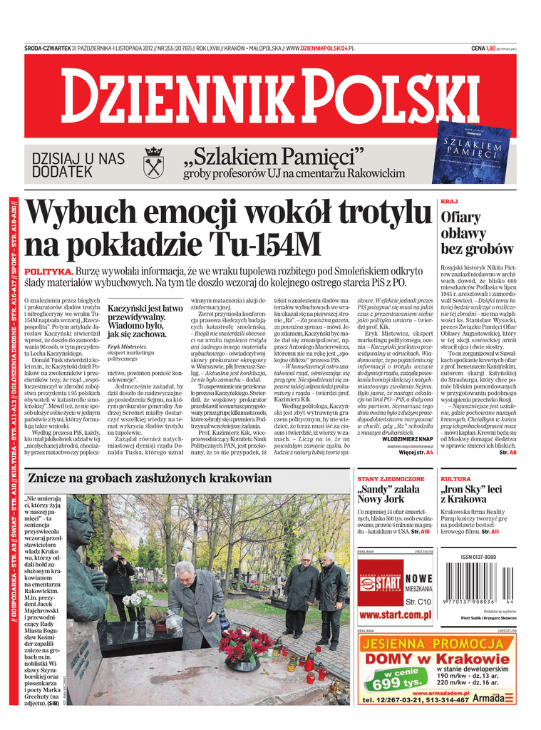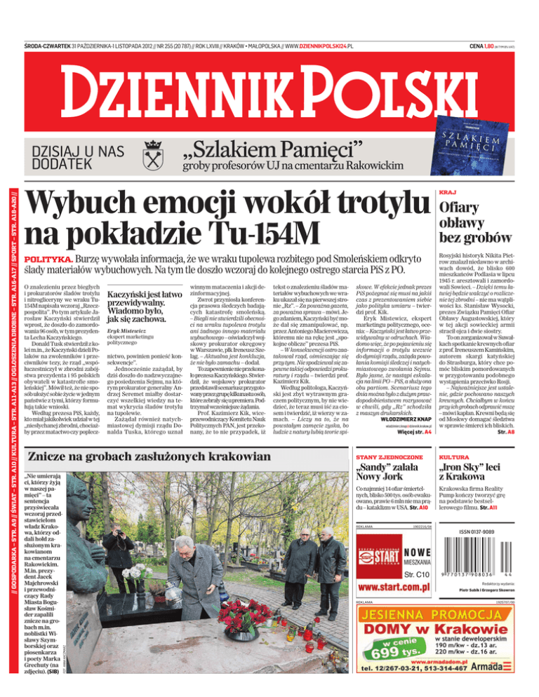 ŚRODA-CZWARTEK 31 PAŹDZIERNIKA-1 LISTOPADA 2012 // NR 255 (20 787) // ROK LXVIII // KRAKÓW • MAŁOPOLSKA // WWW.DZIENNIKPOLSKI24.PL „Szlakiem Pamięci” (cz. III) groby profesorów UJ na cmentarzu Rakowickim KRAJ Wybuch emocji wokół trotylu Ofiary obławy bez grobów na pokładzie Tu-154M POLITYKA. Burzę wywołała informacja, że we wraku tupolewa rozbitego pod Smoleńskiem odkryto ślady materiałów wybuchowych. Na tym tle doszło wczoraj do kolejnego ostrego starcia PiS z PO. O znalezieniu przez biegłych i prokuratorów śladów trotylu i nitrogliceryny we wraku Tu154M napisała wczoraj „Rzeczpospolita”. Po tym artykule Jarosław Kaczyński stwierdził wprost, że doszło do zamordowania 96 osób, w tym prezydenta Lecha Kaczyńskiego. Donald Tusk stwierdził z kolei m.in., że Kaczyński dzieli Polaków na zwolenników i przeciwników tezy, że rząd „współuczestniczył w zbrodni zabójstwa prezydenta i 95 polskich obywateli w katastrofie smoleńskiej”. Mówił też, że nie sposób ułożyć sobie życie w jednym państwie z tymi, którzy formułują takie wnioski. Według prezesa PiS, każdy, kto miał jakikolwiek udział w tej „niesłychanej zbrodni, chociażby przez matactwo czy poplecz- Kaczyński jest łatwo przewidywalny. Wiadomo było, jak się zachowa. Eryk Mistewicz ekspert marketingu politycznego nictwo, powinien ponieść konsekwencje”. Jednocześnie zażądał, by dziś doszło do nadzwyczajnego posiedzenia Sejmu, na którym prokurator generalny Andrzej Seremet miałby dostarczyć wszelkiej wiedzy na temat wykrycia śladów trotylu na tupolewie. Zażądał również natychmiastowej dymisji rządu Donalda Tuska, którego uznał winnym mataczenia i akcji dezinformacyjnej. Zwrot przyniosła konferencja prasowa śledczych badających katastrofę smoleńską. – Biegli nie stwierdzili obecności na wraku tupolewa trotylu ani żadnego innego materiału wybuchowego – oświadczył wojskowy prokurator okręgowy w Warszawie, płk Ireneusz Szeląg. – Aktualna jest konkluzja, że nie było zamachu – dodał. TozapewnienienieprzekonałoprezesaKaczyńskiego.Stwierdził, że wojskowy prokurator przedstawiłscenariuszprzygotowanyprzezgrupękilkunastuosób, którezebrałysięupremiera.Podtrzymałwcześniejszeżądania. Prof. Kazimierz Kik, wiceprzewodniczący Komitetu Nauk Politycznych PAN, jest przekonany, że to nie przypadek, iż Znicze na grobach zasłużonych krakowian „Nie umierają ci, którzy żyją w naszej pamięci” – ta sentencja przyświecała wczoraj przedstawicielom władz Krakowa, którzy oddali hołd zasłużonym krakowianom na cmentarzu Rakowickim. M.in. prezydent Jacek Majchrowski i przewodniczący Rady Miasta Bogusław Kośmider zapalili znicze na grobach m.in. noblistki Wisławy Szymborskiej oraz piosenkarza i poety Marka Grechuty (na zdjęciu). (SIB) FOT. ANNA KACZMARZ // GOSPODARKA – STR. A9 // ŚWIAT – STR. A10 // KULTURA – STR. A11-A13 // OGŁOSZENIA DROBNE – STR. A16-A17 // SPORT – STR. A18-A20 // DZISIAJ U NAS DODATEK CENA 1,80 (W TYM 8% VAT) tekst o znalezieniu śladów materiałów wybuchowych we wraku ukazał się na pierwszej stronie „Rz”. – Za poważna gazeta, za poważna sprawa – mówi. Jego zdaniem, Kaczyński być może dał się zmanipulować, np. przez Antoniego Macierewicza, któremu nie na rękę jest „spokojne oblicze” prezesa PiS. – W konsekwencji ostro zaatakował rząd, ośmieszając się przy tym. Nie spodziewał się zapewne takiej odpowiedzi prokuratury i rządu – twierdzi prof. Kazimierz Kik. Według politologa, Kaczyński jest zbyt wytrawnym graczem politycznym, by nie wiedzieć, że teraz musi iść za ciosem i twierdzić, iż wierzy w zamach. – Liczy na to, że na powstałym zamęcie zyska, bo ludzie z natury lubią teorie spi- skowe. W efekcie jednak prezes PiS pożegnać się musi na jakiś czas z prezentowaniem siebie jako polityka umiaru – twierdzi prof. Kik. Eryk Mistewicz, ekspert marketingu politycznego, ocenia: – Kaczyński jest łatwo przewidywalny w odruchach. Wiadomo więc, że po pojawieniu się informacji o trotylu wezwie do dymisji rządu, zażąda powołania komisji śledczej i natychmiastowego zwołania Sejmu. Było jasne, że nastąpi eskalacja na linii PO – PiS, a służy ona obu partiom. Scenariusz tego dnia można było z dużym prawdopodobieństwem rozrysować w chwili, gdy „Rz” schodziła z maszyn drukarskich. WŁODZIMIERZ KNAP [email protected] Więcej str. A4 Rosyjski historyk Nikita Pietrow znalazł niedawno w archiwach dowód, że blisko 600 mieszkańców Podlasia w lipcu 1945 r. aresztowali i zamordowali Sowieci. – Dzięki temu łatwiej będzie walczyć o rozliczenie tej zbrodni – nie ma wątpliwości ks. Stanisław Wysocki, prezes Związku Pamięci Ofiar Obławy Augustowskiej, który w tej akcji sowieckiej armii stracił ojca i dwie siostry. To on zorganizował w Suwałkach spotkanie krewnych ofiar z prof. Ireneuszem Kamińskim, autorem skargi katyńskiej do Strasburga, który chce pomóc bliskim pomordowanych w przygotowaniu podobnego wystąpienia przeciwko Rosji. – Najważniejsze jest ustalenie, gdzie pochowano naszych krewnych. Chciałbym w końcu przy ich grobach odprawić mszę – mówi kapłan. Krewni będą się od Moskwy domagać śledztwa w sprawie śmierci ich bliskich. Str. A8 STANY ZJEDNOCZONE KULTURA „Sandy” zalała Nowy Jork „Iron Sky” leci z Krakowa Co najmniej 14 ofiar śmiertelnych, blisko 500 tys. osób ewakuowano, prawie 6 mln nie ma prądu – kataklizm w USA. Str. A10 Krakowska firma Reality Pump kończy tworzyć grę na podstawie bestsellerowego filmu. Str. A11 REKLAMA 1902216/04 ISSN 0137-9089 Str. C10 Redaktorzy wydania: Piotr Subik i Grzegorz Skowron REKLAMA 1925707/00