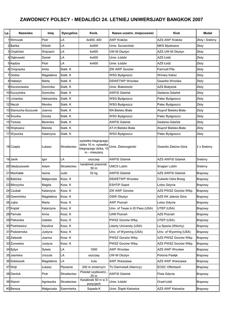 ZAWODNICY POLSCY - MEDALIŚCI 24. LETNIEJ UNIWERSJADY BANGKOK 2007 Lp. Nazwisko Imię Dyscyplina Konk. 1 Klimczak Piotr LA 4x400, 400 2 Bańka Witold LA 3 Chybiński Wojciech 4 Dąbrowski Nazwa uczelni, miejscowość Klub Medal AWF Kraków AZS AWF Kraków Złoty i Srebrny 4x400 Uniw. Szczeciński MKS Mysłowice Złoty LA 4x400 UW-M Olsztyn AZS UW-M Olsztyn Złoty Daniel LA 4x400 Uniw. Łódzki AZS Łódź Złoty 5 Kędzia Piotr LA 4x400 Uniw. Łódzki AZS Łódź Złoty 6 Chojnacka Anita Siatk. K ZW AWF Gorzów Farmutil Piła Złoty 7 Godos Magdalena Siatk. K WSG Bydgoszcz Winiary Kalisz Złoty 8 Haładyn Marta Siatk. K DSWETWP Wrocław Gwardia Wrocław Złoty 9 Koczorowska Dominika Siatk. K Uniw. Białostocki AZS Białystok Złoty 10 Kuczyńska Dominika Siatk. K AWFiS Gdańsk Gedania Gdańsk Złoty 11 Liniarska Aleksandra Siatk. K WSG Bydgoszcz Pałac Bydgoszcz Złoty 12 Naczk Monika Siatk. K WSG Bydgoszcz Pałac Bydgoszcz Złoty 13 Staniucha-Szczurek Joanna Siatk. K KN Bielsko Biała Aluprof Bielsko-Biała Złoty 14 Ściurka Dorota Siatk. K WSG Bydgoszcz Pałac Bydgoszcz Złoty 15 Tomsia Berenika Siatk. K AWFiS Gdańsk Gedania Gdańsk Złoty 16 Wojtowicz Mariola Siatk. K AT-H Bielsko Biała Aluprof Bielsko-Biała Złoty 17 Wysocka Katarzyna Siatk. K WSG Bydgoszcz Pałac Bydgoszcz Złoty 18 Czapla Łukasz sylwetka biegnącego dzika 10 m, sylwetka Uniw. Zielonogórski Strzelectwo biegnącego dzika, 10 m - mieszany Gwardia Zielona Góra 2 x Srebrny 19 Janik Igor LA AZS AWFiS Gdańsk Srebrny 20 Gładyszewski Adam Strzelectwo Snajper Lublin Srebrny 21 Machałek Iwona Judo AWFiS Gdańsk AZS AWFiS Gdańsk Brązowy 22 Babicka Małgorzata Kosz. K DSWETWP Wrocław Cukierki Odra Brzeg Brązowy 23 Bibrzycka Magda Kosz. K ESHTiP Sopot Lotos Gdynia Brązowy 24 Czubak Katarzyna Kosz. K ZW AWF Gorzów AZS PWSZ Gorzów Wlkp. Brązowy 25 Gawrońska Magdalena Kosz. K OSW Olsztyn AZS KK Jelenia Góra Brązowy 26 Jujka Marta Kosz. K AWF Poznań Lotos Gdynia Brązowy 27 KręŜel Katarzyna Kosz. K Univ. of Texas in El Paso (USA) UTEP (USA) Brązowy 28 Pamuła Anna Kosz. K UAM Poznań AZS Poznań Brązowy 29 Piekarska Izabela Kosz. K PWSZ Gorzów Wlkp. UTEP (USA) Brązowy 30 Piotrkiewicz Karolina Kosz. K Liberty University (USA) La Spezia (Włochy) Brązowy 31 Podziemska Justyna Kosz. K Univ. of Wyoming (USA) Univ. of Wyoming (USA) Brązowy 32 Zalesiak Joanna Kosz. K PWSZ Gorzów Wlkp. AZS PWSZ Gorzów Wlkp. Brązowy oszczep AWFiS Gdańsk karabinek pneumat. UMCS Lublin 50 m 52 kg 33 śurowska Justyna Kosz. K PWSZ Gorzów Wlkp. AZS PWSZ Gorzów Wlkp. Brązowy 34 Ejdys Sylwia LA 1500 AWF Wrocław AZS AWF Wrocław Brązowy 35 Jasińska Urszula LA oszczep UW-M Olsztyn Polonia Pasłęk Brązowy 36 Sobieszek Magdalena LA kula AWF Warszawa AZS AWF Warszawa Brązowy 37 Wójt Łukasz Pływanie TU Darmstadt (Niemcy) EOSC Offenbach Brązowy Flota Gdynia Brązowy Orzeł Łódź Brązowy AZS AWF Katowice Brązowy 38 Daniluk Piotr Strzelectwo 39 Staroń Agnieszka Strzelectwo 40 Bereza Małgorzata Szermierka 200 m zmiennym Pistolet szybkostrz., AWFiS Gdańsk 25 m Karabinek 50 m w 3 Uniw. Łódzki pozycjach Szpada K Uniw. Śląski Katowice