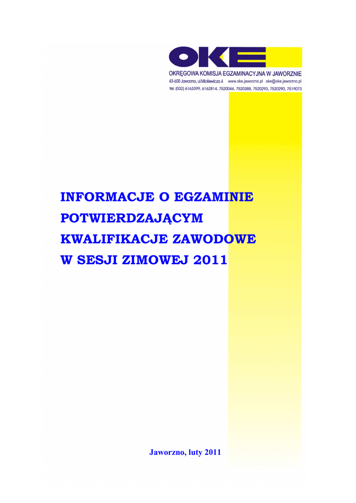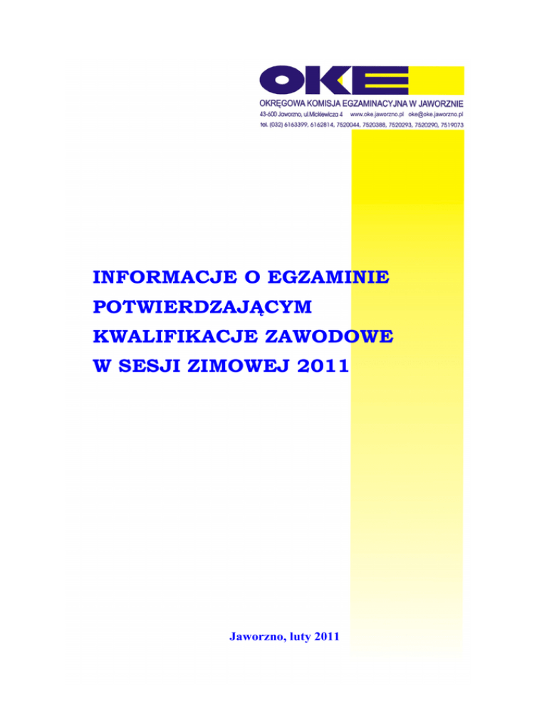 INFORMACJE O EGZAMINIE POTWIERDZAJĄCYM KWALIFIKACJE ZAWODOWE W SESJI ZIMOWEJ 2011 Jaworzno, luty 2011 Zgodnie z zasadami określonymi w Rozporządzeniu Ministra Edukacji Narodowej z dnia 30 kwietnia 2007 r. w sprawie warunków i sposobu oceniania, klasyfikowania i promowania uczniów i słuchaczy oraz przeprowadzania sprawdzianów i egzaminów w szkołach publicznych (Dz. U. Nr 83, poz. 562 ) absolwenci zasadniczej szkoły zawodowej i szkoły policealnej dla dorosłych kształcącej na poziomie zasadniczej szkoły zawodowej oraz szkoły policealnej, technikum i technikum uzupełniającego, w których zajęcia dydaktyczno – wychowawcze kończyły się w styczniu, przystąpili do etapu pisemnego egzaminu zawodowego 18 stycznia 2011 r. Absolwenci technikum oraz szkoły policealnej przystąpili do etapu praktycznego w okresie od 19 do 21 stycznia 2011 r., natomiast absolwenci zasadniczej szkoły zawodowej oraz szkoły policealnej kształcącej w tych samych zawodach, w których kształci zasadnicza szkoła zawodowa – od 25 stycznia do 11 lutego 2011 r. Do egzaminu zawodowego przystąpiło 1799 absolwentów szkół policealnych, techników i techników uzupełniających (1601 absolwentów przystąpiło do egzaminu po raz pierwszy) oraz 37 absolwentów zasadniczych szkół zawodowych i szkół policealnych dla dorosłych kształcących na poziomie zasadniczej szkoły zawodowej (wszyscy absolwenci przystąpili do egzaminu po raz pierwszy). W kryterialnym ocenianiu zadań egzaminacyjnych wykonanych przez zdających w etapie praktycznym egzaminu po zasadniczej szkole zawodowej oraz szkole policealnej dla dorosłych kształcącej na poziomie zasadniczej szkoły zawodowej uczestniczyło łącznie 15 egzaminatorów, w tym 5 przewodniczących. Przygotowanie stanowisk egzaminacyjnych w tym etapie zapewniło 3 asystentów technicznych, natomiast pomoc przedmedyczną – 3 osoby. Sprawdzanie prac egzaminacyjnych z etapu praktycznego po technikum, technikum uzupełniającym i szkole policealnej w Okręgowej Komisji Egzaminacyjnej w Jaworznie odbywało się w siedzibie komisji oraz w ośrodku w Częstochowie. W przygotowaniu stanowisk egzaminacyjnych do etapu praktycznego egzaminu zawodowego po technikum, technikum uzupełniającym oraz szkole policealnej wzięło udział 34 asystentów technicznych. W ocenianiu prac egzaminacyjnych z etapu praktycznego egzaminu uczestniczyło łącznie 50 egzaminatorów, w tym 8 przewodniczących. Spośród absolwentów szkół policealnych, techników i techników uzupełniających przystępujących po raz pierwszy do egzaminu zawodowego dyplom potwierdzający kwalifikacje zawodowe uzyskały 954 osoby (59,58% zdających), natomiast spośród absolwentów zasadniczych szkół zawodowych oraz szkół policealnych dla dorosłych kształcących na poziomie zasadniczej szkoły zawodowej – 35 osób (94,59% zdających). Zaprezentowane poniżej wyniki egzaminu zawodowego dotyczą absolwentów przystępujących do egzaminu po raz pierwszy. Strona 2 z 32 Zawód Etap pisemny Etap praktyczny Lp. nazwa symbol przystąpiło zdało przystąpiło zdało liczba liczba procent liczba liczba procent Ubiegało się o dyplom (w liczbach) Tabela 1. Zdawalność egzaminu po szkole policealnej, technikum i technikum uzupełniającym Uzyskało dyplom liczba procent 1. Technik budownictwa 311[04] 14 10 71 13 9 69 14 8 57 2. Technik elektryk 311[08] 1 1 100 1 0 0 1 0 0 3. Technik górnictwa 311[15] podziemnego 40 34 85 40 38 95 40 33 83 4. Technik informatyk 312[01] 45 22 49 44 20 45 45 14 31 5. Fototechnik 313[01] 22 22 100 22 18 82 22 18 82 6. Technik bezpieczeństwa i higieny pracy 315[01] 797 748 94 800 419 52 801 413 52 7. Technik rolnik 321[05] 35 31 89 35 24 69 35 22 63 8. Asystentka stomatologiczna 322[01] 106 102 96 106 70 66 106 70 66 9. Ratownik medyczny 322[06] 132 129 98 132 103 78 133 101 76 10. Technik dentystyczny 322[09] 106 105 99 106 99 93 106 98 92 11. Technik ekonomista 341[02] 4 4 100 4 3 75 4 3 75 12. Technik handlowiec 341[03] 12 9 75 11 2 18 12 2 17 13. Technik hotelarstwa 341[04] 8 8 100 8 2 25 8 2 25 14. Technik obsługi turystycznej 341[05] 13 12 92 12 7 58 13 7 54 Technik 15. organizacji reklamy 342[01] 15 14 93 15 10 67 15 10 67 16. Technik logistyk 342[04] 24 23 96 24 15 63 24 15 63 Strona 3 z 32 Etap pisemny Etap praktyczny Lp. przystąpiło zdało przystąpiło zdało liczba liczba procent liczba liczba procent Ubiegało się o dyplom (w liczbach) Zawód Uzyskało dyplom nazwa symbol 17. Technik administracji 343[01] 109 106 97 109 60 55 109 60 55 18. Asystent osoby niepełnosprawnej 346[02] 14 14 100 14 11 79 14 11 79 Opiekun w domu 19. pomocy społecznej 346[04] 15 15 100 15 13 87 15 13 87 liczba procent 20. Technik rachunkowości 412[01] 22 21 95 21 17 81 22 17 77 21. Technik prac biurowych 419[01] 10 10 100 10 7 70 10 7 70 22. Technik usług kosmetycznych 514[03] 44 39 89 44 25 57 44 24 55 515[01] 8 6 75 8 7 88 8 6 75 Razem 1596 1485 93 1594 979 61 1601 954 60 Technik ochrony 23. fizycznej osób i mienia Etap pisemny Zawód Etap praktyczny Lp. nazwa 1. 2. 3. Opiekun medyczny* Sprzedawca Malarz-tapeciarz symbol przystąpiło zdało przystąpiło zdało liczba liczba procent liczba liczba procent Ubiegało się o dyplom (w liczbach) Tabela 2. Zdawalność egzaminu po zasadniczej szkole zawodowej oraz po szkole policealnej dla dorosłych kształcącej na poziomie zasadniczej szkoły zawodowej Uzyskało dyplom liczba procent 513[02] 26 25 96 26 26 100 26 25 96 522[01] 714[01] Razem 6 5 37 6 5 36 100 100 97 6 5 37 5 5 36 83 100 97 6 5 37 5 5 35 83 100 95 *szkoła policealna dla dorosłych kształcąca na poziomie zasadniczej szkoły zawodowej Strona 4 z 32 Tabela 3. Podstawowe wskaźniki statystyczne wyników egzaminu absolwentów szkoły policealnej, technikum i technikum uzupełniającego (w procentach) Etap pisemny – część pierwsza Etap pisemny – część druga minimum wynik najczęstszy mediana maksimum minimum wynik najczęstszy Technik budownict