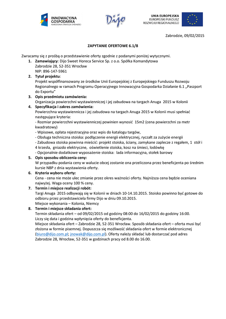 Zabrodzie, 09/02/2015 ZAPYTANIE OFERTOWE 6.1/8 Zwracamy się z prośbą o przedstawienie oferty zgodnie z podanymi poniżej wytycznymi. 1. Zamawiający: Dijo Sweet Horeca Service Sp. z o.o. Spółka Komandytowa Zabrodzie 28, 52-351 Wrocław NIP: 896-147-5961 2. Tytuł projektu: Projekt współfinansowany ze środków Unii Europejskiej z Europejskiego Funduszu Rozwoju Regionalnego w ramach Programu Operacyjnego Innowacyjna Gospodarka Działanie 6.1 „Paszport do Exportu” 3. Opis przedmiotu zamówienia: Organizacja powierzchni wystawienniczej i jej zabudowa na targach Anuga 2015 w Kolonii 4. Specyfikacja i zakres zamówienia: Powierzchna wystawiennicza i jej zabudowa na targach Anuga 2015 w Kolonii musi spełniać następujące kryteria: - Rozmiar powierzchni wystawienniczej powinien wynosić 15m2 (cena powierzchni za metr kwadratowy) - Wpisowe, opłata rejestracyjna oraz wpis do katalogu targów, - Obsługa techniczna stoiska: podłączenie energii elektrycznej, ryczałt za zużycie energii - Zabudowa stoiska powinna mieścić: projekt stoiska, ściany, zamykane zaplecze z regałem, 1 stół i 4 krzesła, gniazdo elektryczne, oświetlenie stoiska, kosz na śmieci, lodówkę - Opcjonalnie dodatkowe wyposażenie stoiska: lada informacyjna, stołek barowy 5. Opis sposobu obliczenia ceny: W przypadku podania ceny w walucie obcej zostanie ona przeliczona przez beneficjenta po średnim kursie NBP z dnia wystawienia oferty. 6. Kryteria wyboru oferty: Cena - cena nie może ulec zmianie przez okres ważności oferty. Najniższa cena będzie oceniana najwyżej. Waga oceny 100 % ceny. 7. Termin i miejsce realizacji robót: Targi Anuga 2015 odbywają się w Kolonii w dniach 10-14.10.2015. Stoisko powinno być gotowe do odbioru przez przedstawiciela firmy Dijo w dniu 09.10.2015. Miejsce wykonania – Kolonia, Niemcy 8. Termin i miejsce składania ofert: Termin składania ofert – od 09/02/2015 od godziny 08:00 do 16/02/2015 do godziny 16:00. Liczy się data i godzina wpłynięcia oferty do beneficjenta. Miejsce składania ofert – Zabrodzie 28, 52-351 Wrocław. Sposób składania ofert – oferta musi być złożona w formie pisemnej. Dopuszcza się możliwość składania ofert w formie elektronicznej ([email protected]; [email protected]). Oferty należy składać lub dostarczać pod adres Zabrodzie 28, Wrocław, 52-351 w godzinach pracy od 8.00 do 16.00.