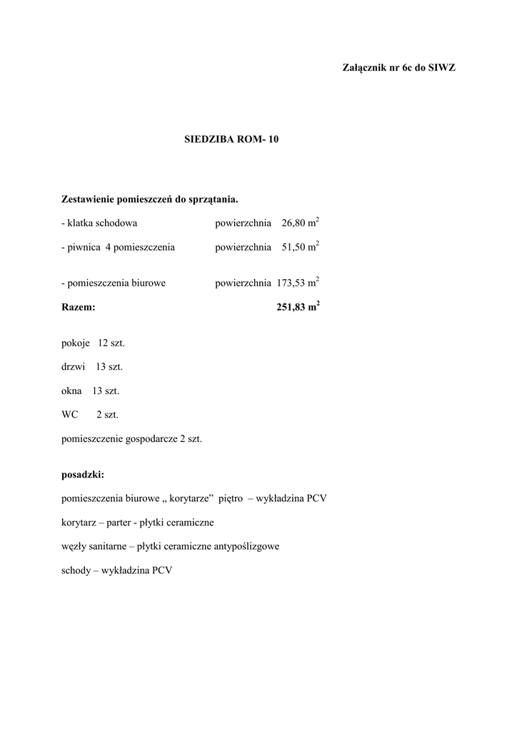 Załącznik nr 6c do SIWZ SIEDZIBA ROM- 10 Zestawienie pomieszczeń do sprzątania. - klatka schodowa powierzchnia 26,80 m2 - piwnica 4 pomieszczenia powierzchnia 51,50 m2 - pomieszczenia biurowe powierzchnia 173,53 m2 251,83 m2 Razem: pokoje 12 szt. drzwi 13 szt. okna 13 szt. WC 2 szt. pomieszczenie gospodarcze 2 szt. posadzki: pomieszczenia biurowe „ korytarze” piętro – wykładzina PCV korytarz – parter - płytki ceramiczne węzły sanitarne – płytki ceramiczne antypoślizgowe schody – wykładzina PCV