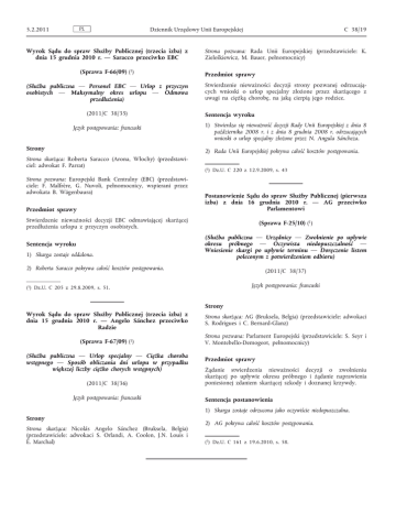 PL 5.2.2011 Dziennik Urzędowy Unii Europejskiej Wyrok Sądu do spraw Służby Publicznej (trzecia izba) z dnia 15 grudnia 2010 r. — Saracco przeciwko EBC (Sprawa F-66/09) (1) (Służba publiczna — Personel EBC — Urlop z przyczyn osobistych — Maksymalny okres urlopu — Odmowa przedłużenia) (2011/C 38/35) Język postępowania: francuski Strony C 38/19 Strona pozwana: Rada Unii Europejskiej (przedstawiciele: K. Zieleśkiewicz, M. Bauer, pełnomocnicy) Przedmiot sprawy Stwierdzenie nieważności decyzji strony pozwanej odrzucają cych wnioski o urlop specjalny złożone przez skarżącego z uwagi na ciężką chorobę, na jaką cierpią jego rodzice. Sentencja wyroku 1) Stwierdza się nieważność decyzji Rady Unii Europejskiej z dnia 8 października 2008 r. i z dnia 8 grudnia 2008 r. odrzucających wnioski o urlop specjalny złożone przez N. Angula Sáncheza. 2) Rada Unii Europejskiej pokrywa całość kosztów postępowania. Strona skarżąca: Roberta Saracco (Arona, Włochy) (przedstawi ciel: adwokat F. Parrat) Strona pozwana: Europejski Bank Centralny (EBC) (przedstawi ciele: F. Malfrère, G. Nuvoli, pełnomocnicy, wspierani przez adwokata B. Wägenbaura) Przedmiot sprawy (1) Dz.U. C 220 z 12.9.2009, s. 43 Postanowienie Sądu do spraw Służby Publicznej (pierwsza izba) z dnia 16 grudnia 2010 r. — AG przeciwko Parlamentowi Stwierdzenie nieważności decyzji EBC odmawiającej skarżącej przedłużenia urlopu z przyczyn osobistych. Sentencja wyroku 1) Skarga zostaje oddalona. (Sprawa F-25/10) (1) (Służba publiczna — Urzędnicy — Zwolnienie po upływie okresu próbnego — Oczywista niedopuszczalność — Wniesienie skargi po upływie terminu — Doręczenie listem poleconym z potwierdzeniem odbioru) 2) Roberta Saracco pokrywa całość kosztów postępowania. (2011/C 38/37) Język postępowania: francuski (1) Dz.U. C 205 z 29.8.2009, s. 51. Strony Wyrok Sądu do spraw Służby Publicznej (trzecia izba) z dnia 15 grudnia 2010 r. — Angelo Sánchez przeciwko Radzie Strona skarżąca: AG (Bruksela, Belgia) (przedstawiciele: adwokaci S. Rodrigues i C. Bernard-Glanz) (Sprawa F-67/09) (1) Strona pozwana: Parlament Europejski (przedstawiciele: S. Seyr i V. Montebello-Demogeot, pełnomocnicy) (Służba publiczna — Urlop specjalny — Ciężka choroba wstępnego — Sposób obliczania dni urlopu w przypadku większej liczby ciężko chorych wstępnych) (2011/C 38/36) Język postępowania: francuski Przedmiot sprawy Żądanie stwierdzenia nieważności decyzji o zwolnieniu skarżącej po upływie okresu próbnego i żądanie naprawienia poniesionej zdaniem skarżącej szkody i doznanej krzywdy. Sentencja postanowienia 1) Skarga zostaje odrzucona jako oczywiście niedopuszczalna. Strony Strona skarżąca: Nicolás Angelo Sánchez (Bruksela, Belgia) (przedstawiciele: adwokaci S. Orlandi, A. Coolen, J.N. Louis i É. Marchal) 2) AG pokrywa całość kosztów postępowania. (1) Dz.U. C 161 z 19.6.2010, s. 58.