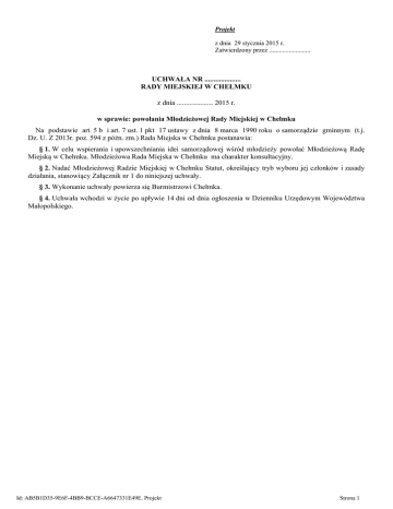 Projekt z dnia 29 stycznia 2015 r. Zatwierdzony przez ......................... UCHWAŁA NR .................... RADY MIEJSKIEJ W CHEŁMKU z dnia .................... 2015 r. w sprawie: powołania Młodzieżowej Rady Miejskiej w Chełmku Na podstawie art. 5 b i art. 7 ust. 1 pkt 17 ustawy z dnia 8 marca 1990 roku o samorządzie gminnym (t.j. Dz. U. Z 2013r. poz. 594 z późn. zm.) Rada Miejska w Chełmku postanawia: § 1. W celu wspierania i upowszechniania idei samorządowej wśród młodzieży powołać Młodzieżową Radę Miejską w Chełmku. Młodzieżowa Rada Miejska w Chełmku ma charakter konsultacyjny. § 2. Nadać Młodzieżowej Radzie Miejskiej w Chełmku Statut, określający tryb wyboru jej członków i zasady działania, stanowiący Załącznik nr 1 do niniejszej uchwały. § 3. Wykonanie uchwały powierza się Burmistrzowi Chełmka. § 4. Uchwała wchodzi w życie po upływie 14 dni od dnia ogłoszenia w Dzienniku Urzędowym Województwa Małopolskiego. Id: AB5B1D35-9E6F-4BB9-BCCE-A6647331E49E. Projekt Strona 1 Załącznik Nr 1 do Uchwały Nr .................... Rady Miejskiej w Chełmku z dnia....................2015 r. Młodzieżowa Rada Miejskiej w Chełmku STATUT Rozdział 1. Postanowienia ogólne § 1. 1. Statut określa cele i zasady działania Młodzieżowej Rady Miejskiej w Chełmku, zwanej dalej Radą Młodzieży oraz tryb wyboru jej członków. 2. Rada Młodzieży działa w szczególności na podstawie art. 5b ustawy z dnia 8 marca 1990 r. o samorządzie gminnym (Dz. U. Z 2013 r. poz. 594 z późn. zm.) oraz niniejszego statutu. § 2. Siedzibą Rady Młodzieży jest miasto Chełmek. § 3. 1. Rada Młodzieży ma prawo używania herbu Chełmka z dopiskiem "Młodzieżowa Rada Miejska w Chełmku" oraz pieczęci określonych według wzorów w Załączniku nr 1 do Statutu. 2. Ochrona używania herbu odbywa się na zasadach określonych w statucie Gminy Chełmek. § 4. 1. Rada Młodzieży składa się z maksymalnie 15 członków, w tym: - Samorządowy Zespół Szkół Nr 1 - 4 członków (Szkoła Podstawowa 2 członków, Gimnazjum 2 członków), - Samorządowy Zespół Szkolno - Przedszkolny Nr 2 - 6 członków (Szkoła Podstawowa 3 członków, Gimnazjum 3 członków), - Samorządowy Zespół Szkół w Bobrku - 2 członków (Szkoła Podstawowa 1 członek, Gimnazjum 1 członek), - Samorządowy Zespół Szkół w Gorzowie - 2 członków (Szkoła Podstawowa 1 członek, Gimnazjum 1 członek), - Powiatowy Zespół Nr 8 Szkół Zawodowych i Ogólnokształcących w Chełmku - 1 członek. 2. Członkowie Rady Młodzieży są wybierani i odwoływani przez podmiot, który reprezentują, zgodnie z Załącznikiemnr 2 do Statutu. 3. Radni Rady Młodzieży muszą być mieszkańcami i uczniami szkół podstawowych, gimnazjalnych i ponadgimnazjalnych działających na terenie gminy Chełmek. 4. Kadencja Rady Młodzieży trwa 2 lata szkolne, z wyłączeniem ust 5. 5. Pierwsza kadencja Rady Młodzieży rozpoczyna się 1 kwietnia 2015 r. i trwa do 31 października 2016 r. § 5. Rada Młodzieży w swoich działaniach, kieruje się interesem miasta i młodzieży. § 6. 1. Burmistrz Chełmka powołuje doradcę Rady Młodzieży. 2. Zadaniem doradcy jest pomoc merytoryczna członkom Rady Młodzieży, w związku z bieżącą działalnością Rady Młodzieży oraz zapewnienie właściwych warunków umożliwiających swobodny przepływ informacji pomiędzy Radą Młodzieży, a organami gminy Chełmek oraz Urzędem Miejskim w Chełmku. § 7. Celem działania Rady Młodzieży jest: 1) promowanie idei społeczeństwa obywatelskiego; 2) upowszechnianie zasad działania samorządu terytorialnego wśród młodzieży; 3) integracja i współpraca środowisk młodzieżowych na terenie miasta; 4) podejmowanie działań na rzecz zaspokajania potrzeb i oczekiwań młodych mieszkańców miasta; 5) organizacja aktywnego uczestnictwa młodzieży w życiu publicznym. § 8. Do zadań Rady Młodzieży należy: Id: AB5B1D35-9E6F-4BB9-BCCE-A6647331E49E. Projekt Strona 1 1) opiniowanie spraw dotyczących młodzieży na wniosek organów administracji samorządowej miasta Chełmek, poprzez podejmowanie uchwał oraz stanowisk; 2) inicjowanie i promowanie działań o charakterze społecznym, edukacyjnym, kulturalnym, sportowym, rekreacyjnym, ekologicznym, charytatywnym i wolontariackim; 3) współpraca z jednostkami organizacyjnymi miasta Chełmek w zakresie organizacji działań wskazanych w § 8 pkt.2 nieniejszego statutu. 4) wybór oraz odwoływanie przewodniczącego Rady Młodzieży- zwanego dalej prezydium; 5) powoływanie komisji rewizyjnej oraz komisji problemowych; 6) przyjmowanie sprawozdań z kadencji z działalności prezydium, komisji rewizyjnej i komisji problemowych; 7) podejmowanie uchwał w sprawie wygaśnięcia mandatu członka Rady Młodzieży i przeprowadzania wyborów uzupełniających; 8) proponowanie zmian w Statucie Rady Młodzieży, na zasadach określonych w § 23; Rozdział 2. Organizacja Młodzieżowej Rady Gminy Chełmek § 9. Organem wykonawczym Rady Młodzieży jest prezydium. § 10. 1. Prezydium składa się z: 1) przewodniczącego Rady Młodzieży; 2) wiceprzewodniczącego; 3) sekretarza; 2. Do kompetencji prezydium należy: 1) kierowanie bieżącymi sprawami Rady Młodzieży; 2) przygotowywanie kalendarza prac Rady Młodzieży 3) przygotowanie projektów uchwał, stanowisk i wniosków; 3. Rada Młodzieży wybiera członków prezydium spośród członków Rady Młodzieży, bezzwględną większością głosów, w głosowaniu tajnym. 4. Rada Młodzieży może odwołać członka lub członków prezydium bezwzględnie większością głosów w głosowaniu tajnym, na wniosek przewodniczącego Rady Młodzieży lub co najmniej 1/5 statutowego składy Rady Młodzieży. Wniosek o odwołanie członka lub członków prezydium Rady Młodzieży rozpatruje się na sesji następnej po sesji, na której zgłoszono wniosek, nie wcześniej jednak niż po upływie miesiąca. Jeżeli wniosek o odwołanie cz