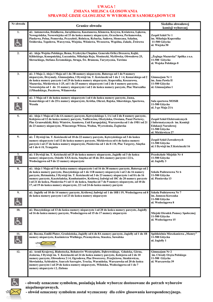 UWAGA ! ZMIANA MIEJSCA GŁOSOWANIA SPRAWDŹ GDZIE GŁOSUJESZ W WYBORACH SAMORZĄDOWYCH Nr obwodu 1. 2. 3. 4. 5. Granice obwodu ul.: Antonowska, Działkowa, Jarzębinowa, Kasztanowa, Klonowa, Krzywa, Kwiatowa, Łąkowa, Nowogródzka, Nowowiejska od 33 do końca numery nieparzyste, Orzechowa, Perkunowska, Piaskowa, Polna, Pomorska, Przyszłość, Rolnicza, Rybacka, Sadowa, Słoneczna, Szkolna, Świderska, Topolowa, Warzywna, Wiejska, Wiśniowa, Wrzosowa, Wspólna, Zakole, Żwirowa ul.: Aleja Wojska Polskiego, Bema, Fryderyka Chopina, Generała Orlicz Dreszera, Kajki, Kilińskiego, Konopnickiej, Łuczańska, Mikołaja Reja, Moniuszki, Myśliwska, Obwodowa 25, Słowackiego, Stefana Żeromskiego, Struga, Św. Brunona, Turystyczna, Tuwima ul.: 3 Maja 2, Aleja 1 Maja od 1 do 3B numery nieparzyste, Batorego od 1 do 9 numery nieparzyste, Drzymały, Gimnazjalna, I Dywizji im. T. Kościuszki od 1 do 2 i 4, Konarskiego od 2 do końca numery parzyste i od 29 do końca numery nieparzyste, Kopernika, Koszarowa, Mazurska, Mickiewicza 1-25, od 1 do 25 numery nieparzyste i od 2 do 4 numery parzyste, Nowowiejska od 1 do 31 numery nieparzyste i od 2 do końca numery parzyste, Plac Marszałka J.Piłsudskiego, Pocztowa, Wilanowska ul.: 3 Maja od 1 do końca numery nieparzyste i od 4 do końca numery parzyste, Jasna, Konarskiego od 1 do 25A numery nieparzyste, Krótka, Okrzei, Rajska, Sikorskiego, Sportowa, Wesoła ul.: Aleja 1 Maja od 2 do 4A numery parzyste, Kętrzyńskiego 1, 1A i od 2 do 8 numery parzyste, Kolejowa od 12 do końca numery parzyste, Nadbrzeżna, Olsztyńska, Owsiana, Pasaż Portowy, Plac Grunwaldzki, Róży Wiatrów, Szantowa, Unii Europejskiej, Warszawska od 1 do 19B i od 21 do 23 numery nieparzyste, Wincentego Witosa, Wodna, Wyzwolenia, Żeglarska Siedziba obwodowej komisji wyborczej Zespół Szkół Nr 1 im. Mikołaja Kopernika 11-500 Giżycko ul. Wiejska 50 „Żegluga Mazurska” Spółka z o.o. 11-500 Giżycko al. Wojska Polskiego 8 Gimnazjum Nr 1 im. Jana Pawła II 11-500 Giżycko ul. Gimnazjalna 1 Sala sportowa MOSiR 11-500 Giżycko ul. 3-go Maja 21A Zespół Szkół Elektronicznych i Informatycznych im. Komisji Edukacji Narodowej 11-500 Giżycko ul. Mickiewicza 27 ul.: I Dywizji im. T. Kościuszki od 18 do 22 numery parzyste, Kętrzyńskiego od 3 do końca numery nieparzyste i od 12 do końca numery parzyste, Mickiewicza od 6 do końca numery parzyste i od 27 do końca numery nieparzyste, Pionierska od 1 do 8 i 10, Plac Targowy, Smętka od 1 do 6 i 8, Traugutta Zespół Szkół Zawodowych 11-500 Giżycko ul. I Dywizji im.T.Kościuszki 16 7. ul.: I Dywizji im. T. Kościuszki od 25 do końca numery nieparzyste, Jagiełły od 3 do końca numery nieparzyste, Osiedle XXX-lecia, Smętka od 18 do 20A numery parzyste i 22A, Wodociągowa od 9 do 13 numery nieparzyste Przedszkole Miejskie Nr 4 11-500 Giżycko ul. Jagiełły 3 8. ul.: Aleja 1 Maja od 5 do końca numery nieparzyste i od 16 do 38 numery parzyste, Batorego od 2 do końca numery parzyste, Daszyńskiego od 1 do 11B numery nieparzyste i od 2 do 16 numery parzyste, Hetmańska, I Dywizji im. T. Kościuszki od 3 do 23 numery nieparzyste i od 8A do 16 numery parzyste, Kasztelańska, Kombatantów, Królowej Jadwigi od 18C do 20 numery parzyste i od 21 do końca, Pionierska 9 i od 11 do końca, Smętka od 7 do 9 numery nieparzyste, od 10 do 17, od 19 do końca numery nieparzyste, 22 i od 24 do końca numery parzyste 6. Szkoła Podstawowa Nr 6 11-500 Giżycko ul. Pionierska 13 9. ul.: Jagiełły od 10 do 14 numery parzyste, Królowej Jadwigi od 1 do 18B i 19, Wodociągowa od 8 Szkoła Podstawowa Nr 7 do końca numery parzyste i od 23 do końca numery nieparzyste im. Janusza Korczaka 11-500 Giżycko ul. Wodociągowa 8 10. ul.: Daszyńskiego od 13 do końca numery nieparzyste i od 20 do końca numery parzyste, Jagiełły od 16 do końca numery parzyste, Wodociągowa od 15 do 17 numery nieparzyste Miejski Ośrodek Pomocy Społecznej 11-500 Giżycko ul. Wodociągowa 15 11. ul.: Boczna, Emilii Plater, Grodzieńska, Jagiełły od 6 do 8A numery parzyste, Jagiełły od 1 do 1B numery nieparzyste, Kazimierza Wielkiego, Przemysłowa, Staszica, Suwalska Spółdzielnia Mieszkaniowa „Mamry” 11-500 Giżycku ul. Jagiełły 1 12. ul.: Armii Krajowej, Białostocka, Bohaterów Westerplatte, Dąbrowskiego, Gdańska, Górna, Jeziorna, I Dywizji im. T. Kościuszki od 24 do końca numery parzyste, Kolejowa od 2 do 10 numery parzyste, Obwodowa 2 i 4, Ogrodowa, Plac Dworcowy, Przejściowa, Sienkiewicza, Słowiańska, Sybiraków, Szarych Szeregów, Trocka, Warmińska, Warszawska od 20 do końca numery parzyste i od 29 do końca numery nieparzyste, Wileńska, Wodociągowa od 1 do 7 numery nieparzyste i 2, Zielona Gimnazjum Nr 2 im. Chwały Oręża Polskiego 11-500 Giżycko ul. Warszawska 39 - obwody oznaczone symbolem, posiadają lokale wyborcze dostosowane do potrzeb wyborców niepełnosprawnych. - obwód oznaczony symbolem został wyznaczony dla celów głosowania korespondencyjnego. INFORMACJ A ! WYBORY SAMORZĄDOWE 16 LISTOPADA 2014 r. Wyborcy niepełnosprawni mogą składać wnioski o dopisanie ich do spisu wyborców w obwodach głosowania dostosowanych do potrzeb wyborców niepełnosprawnych w terminie do dnia 12 listopada 2014 r. do Urzędu Miejskiego w Giżycku. Wyborca niepełnosprawny o znacznym lub umiarkowanym stopniu niepełnosprawności w rozumieniu ustawy z dnia 27 sierpnia 1997 r. o rehabilitacji zawodowej i społecznej oraz zatrudnianiu osób niepełnosprawnych (Dz. U. z 2011 r. Nr 127, poz. 721, z późn. zm.) oraz wyborca ,który najpóźniej w dniu głosowania kończy 75 lat, może w terminie do dnia 7 listopada 2014r.złożyć wniosek do Burmistrza Miasta o sporządzenie aktu pełnomocnictwa do głosowania w jego imieniu. Wyborca niepełnosprawny o znacznym lub umiarkowanym stopniu niepełnosprawności w rozumieniu ustawy z dnia 27 sierpnia 1997 r. o rehabilitacji zawodowej i społecznej oraz zatrudnianiu osób niepełnosprawnych może glo